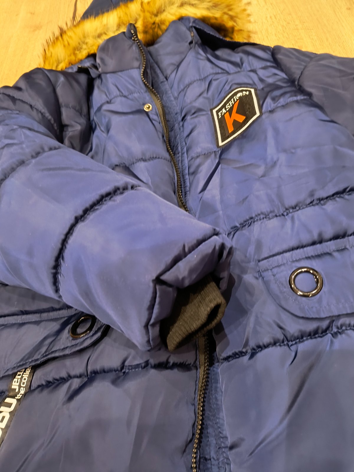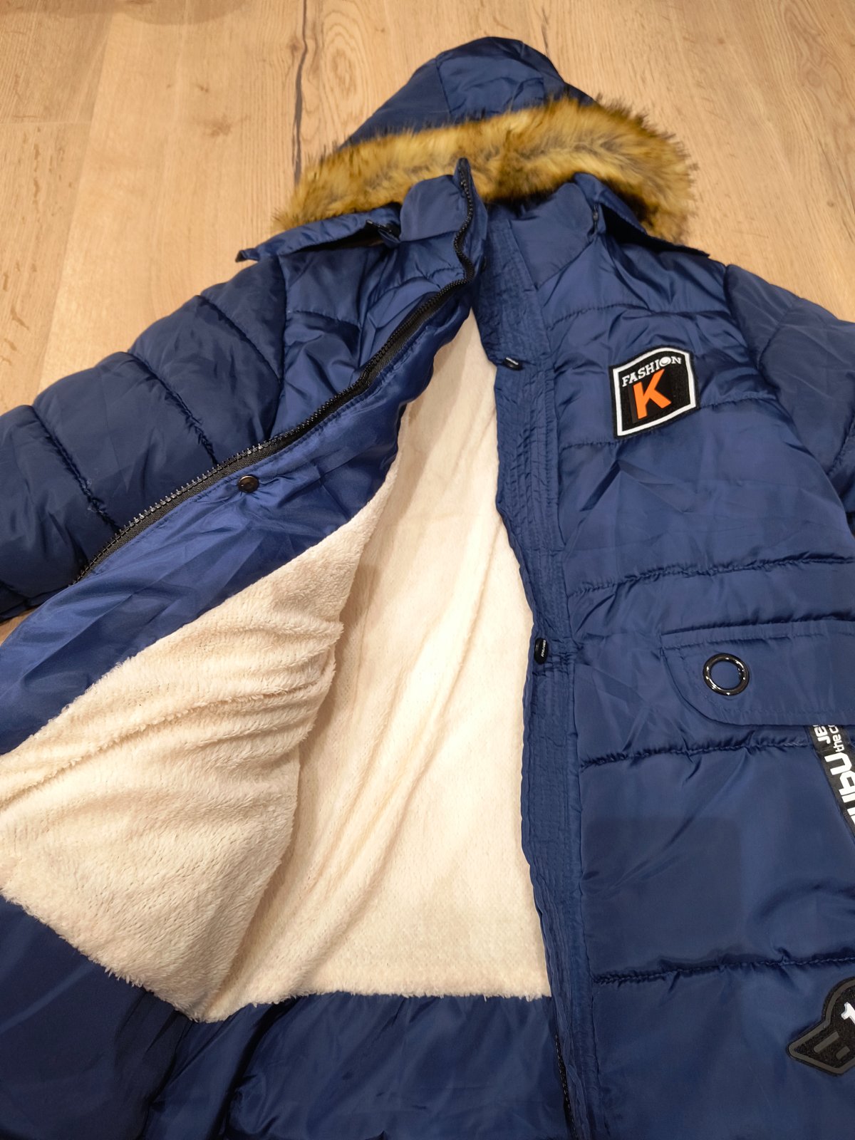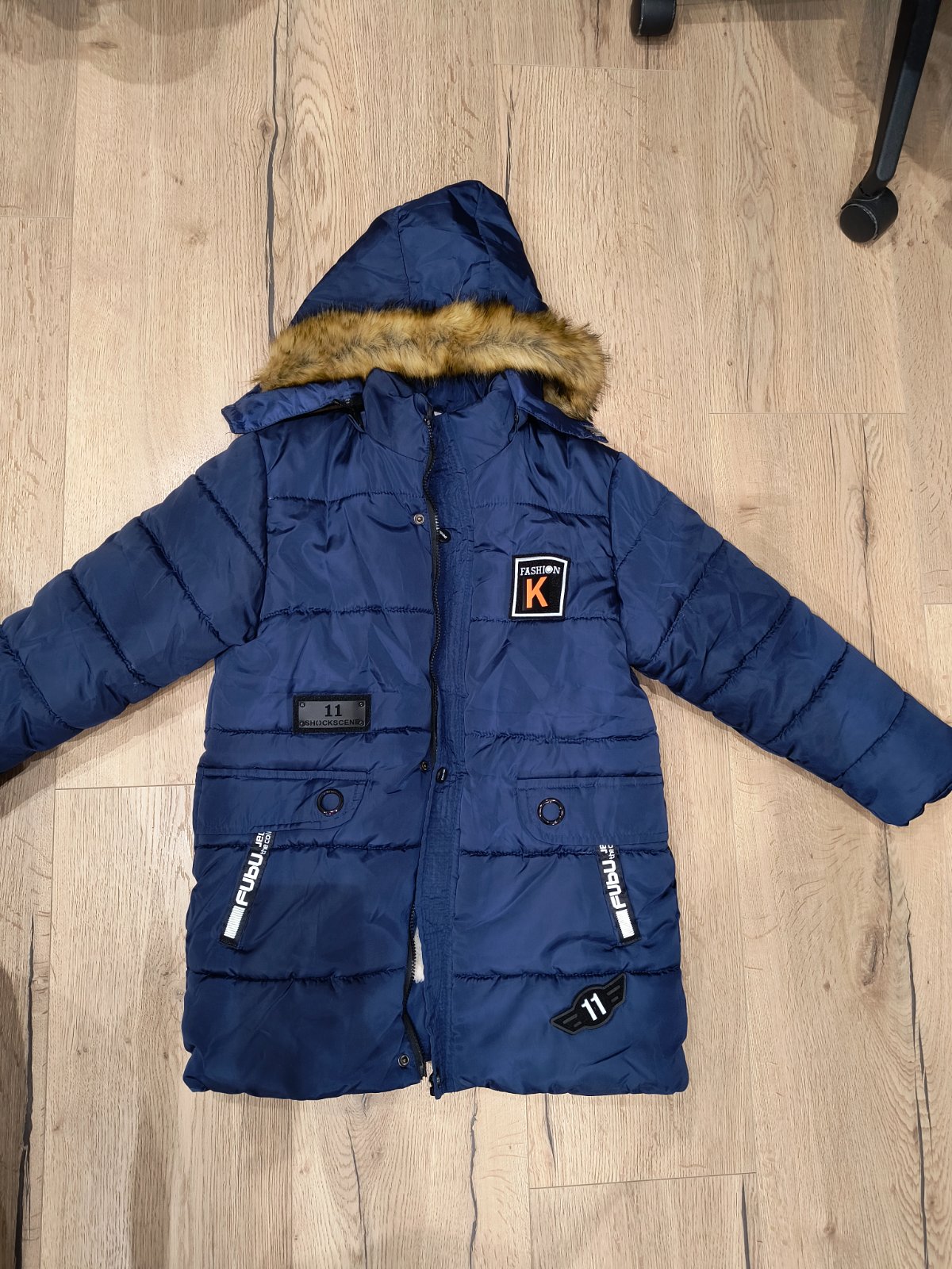Tmavomodrá bunda so sivými ramenami. Veľ. 152-158 cm. Dve vrecká na zips. Koniec rukáva je predĺžený, aby bolo teplo na zápastie. Skrytý zips pod gombíkmi. Vysoký golier. Nepoškodená.