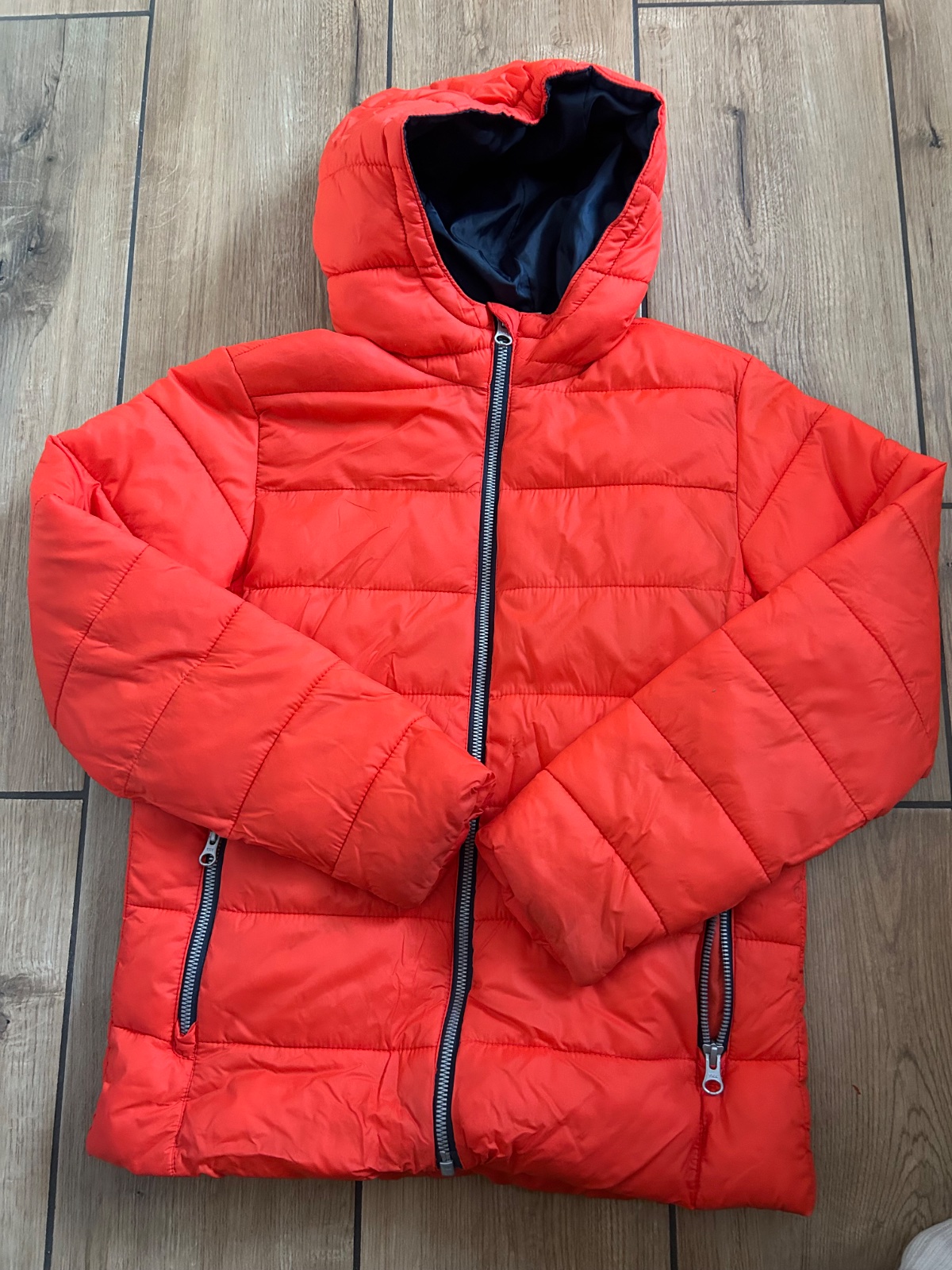 Prechodna bunda,kapucna napevno,velmi zachovala,na patentoch jemne zmolky. Dlzka 52 cm, sirka pod pazuchou 44 cm, dlzka rukva od pleca 52 cm. Cena 6 eur plus postovne