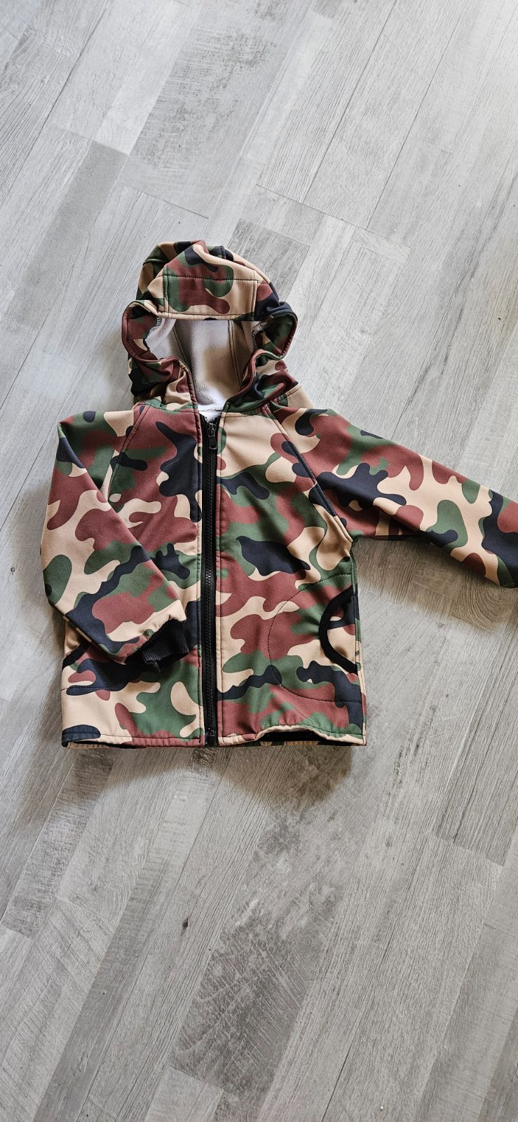 Predám krásnu handmade softshellovú bundicku,veľkosť cca 86/92. Na kapucni je guma,aby lepšie držala na hlavicke