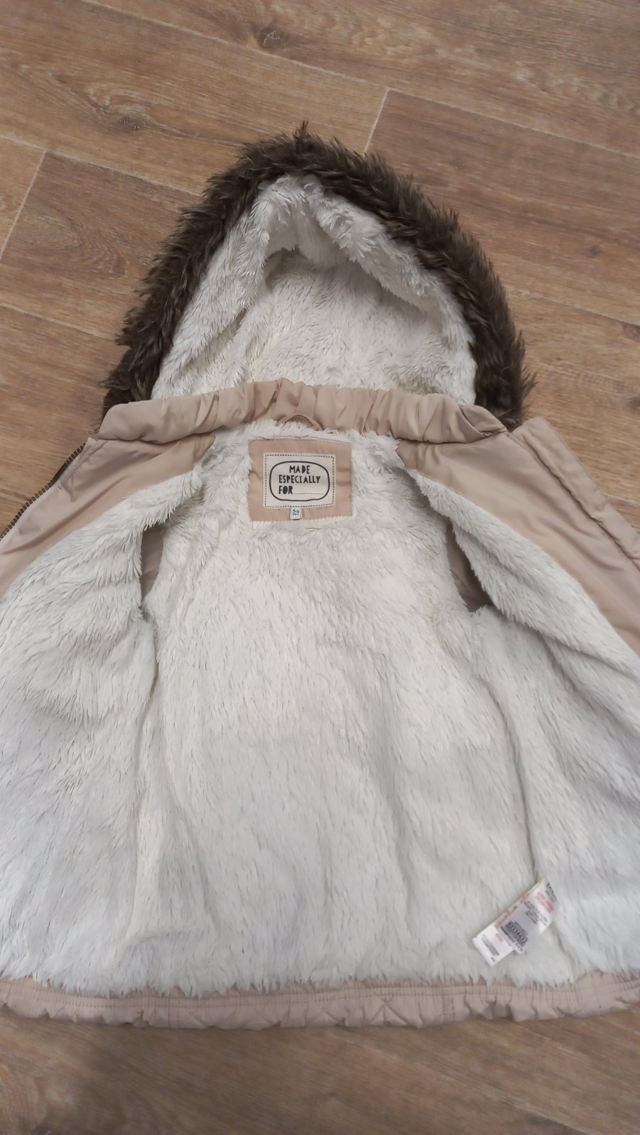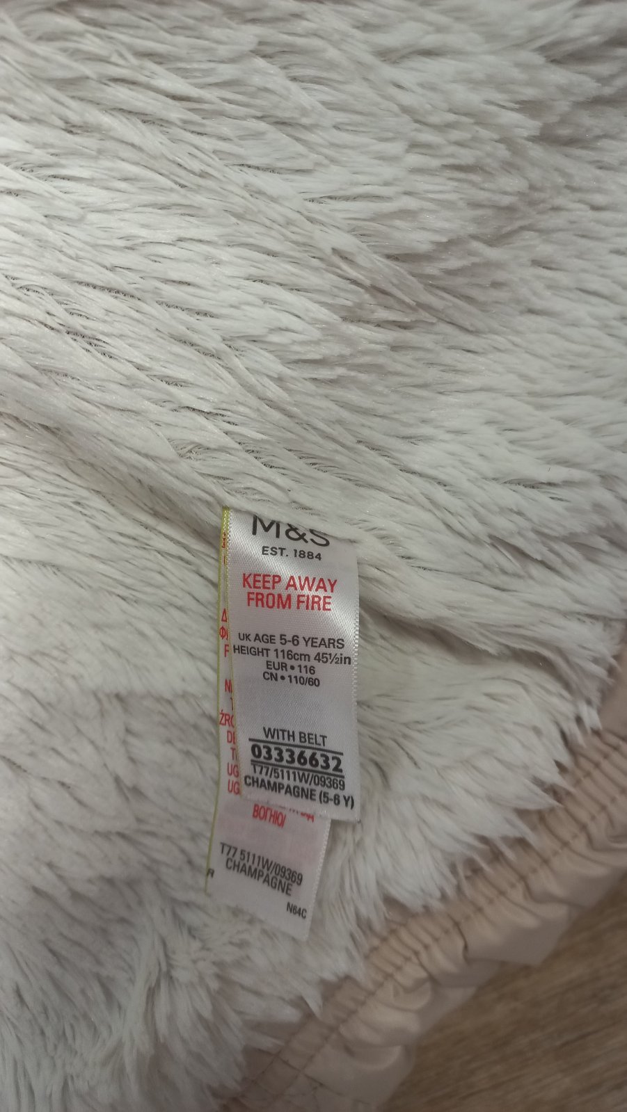 Prešívaná vetrovka s kapucňou a opaskom. Na jednom rukáve malé 2 fliačiky, sú na to prostriedky, vetrovka je uz malá. vid foto. ZN: M&S. Vhodná 5-6 rokov.