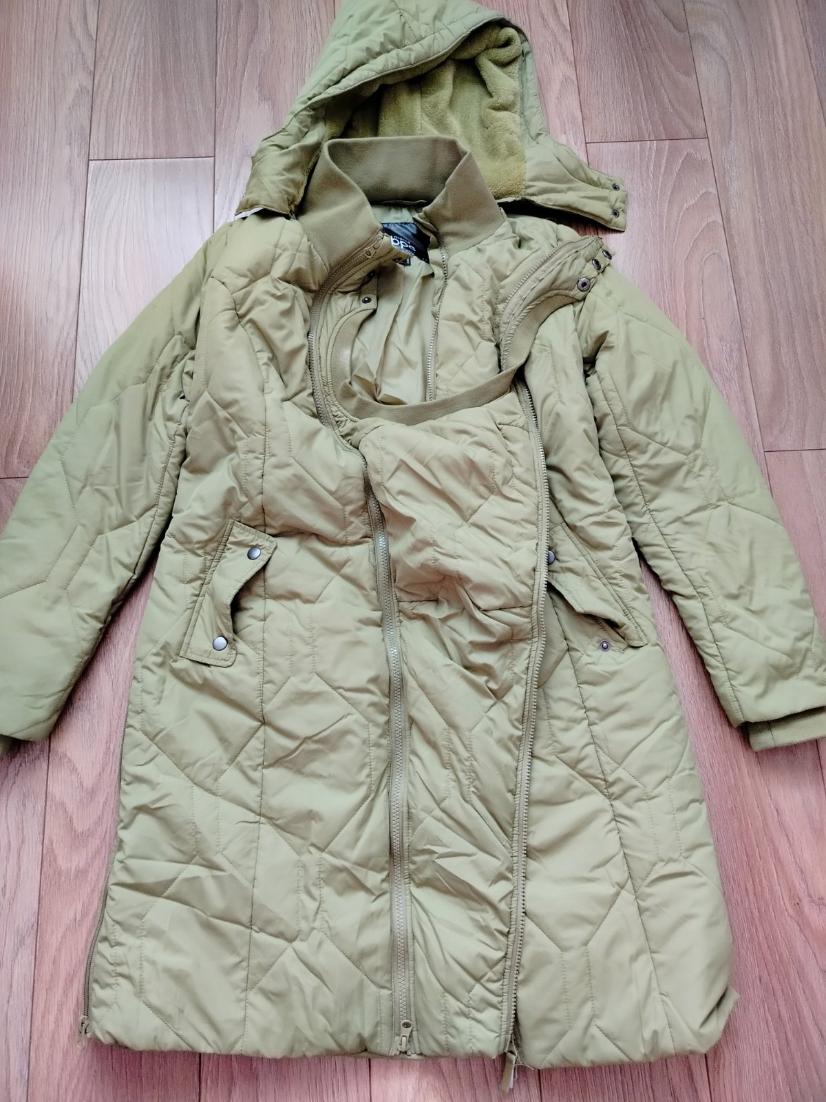 Funkcie: dvojitý zips + tehotenská vložka na rozšírenie (je súčasťou), po pôrode ideálne na dojčenie, veľká kapucňa, vysoký golier, praktické vrecká.