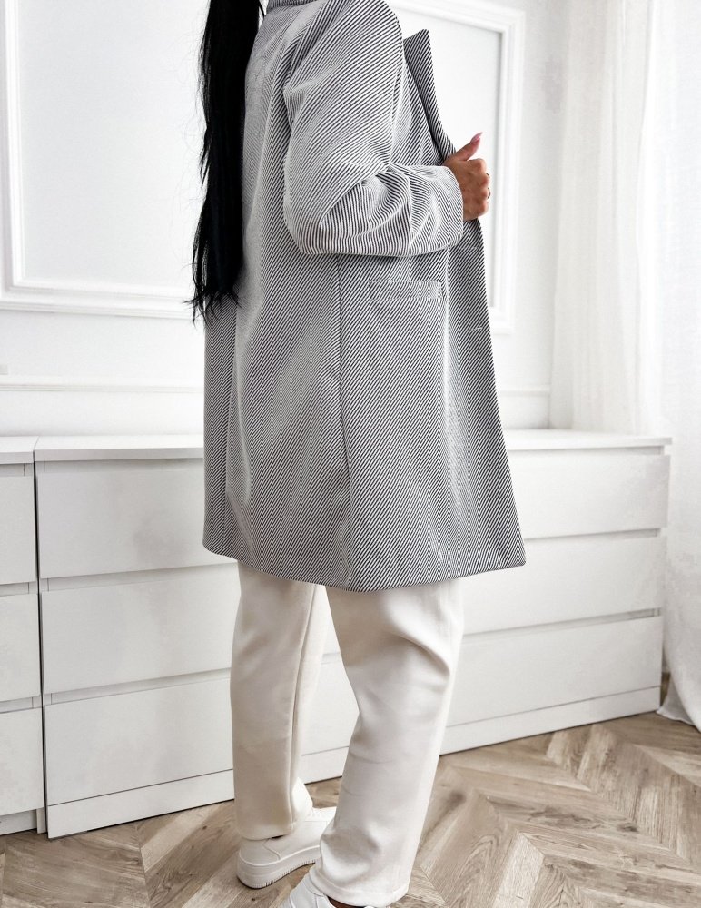 Čierno-biely kabát Viviana je trendový, prechodný kabát s dlhým rukávom. Kabát má predĺžený strih a pásikavý vzor. Perfektne sa hodí k elegantným aj ležérnym outfitom.