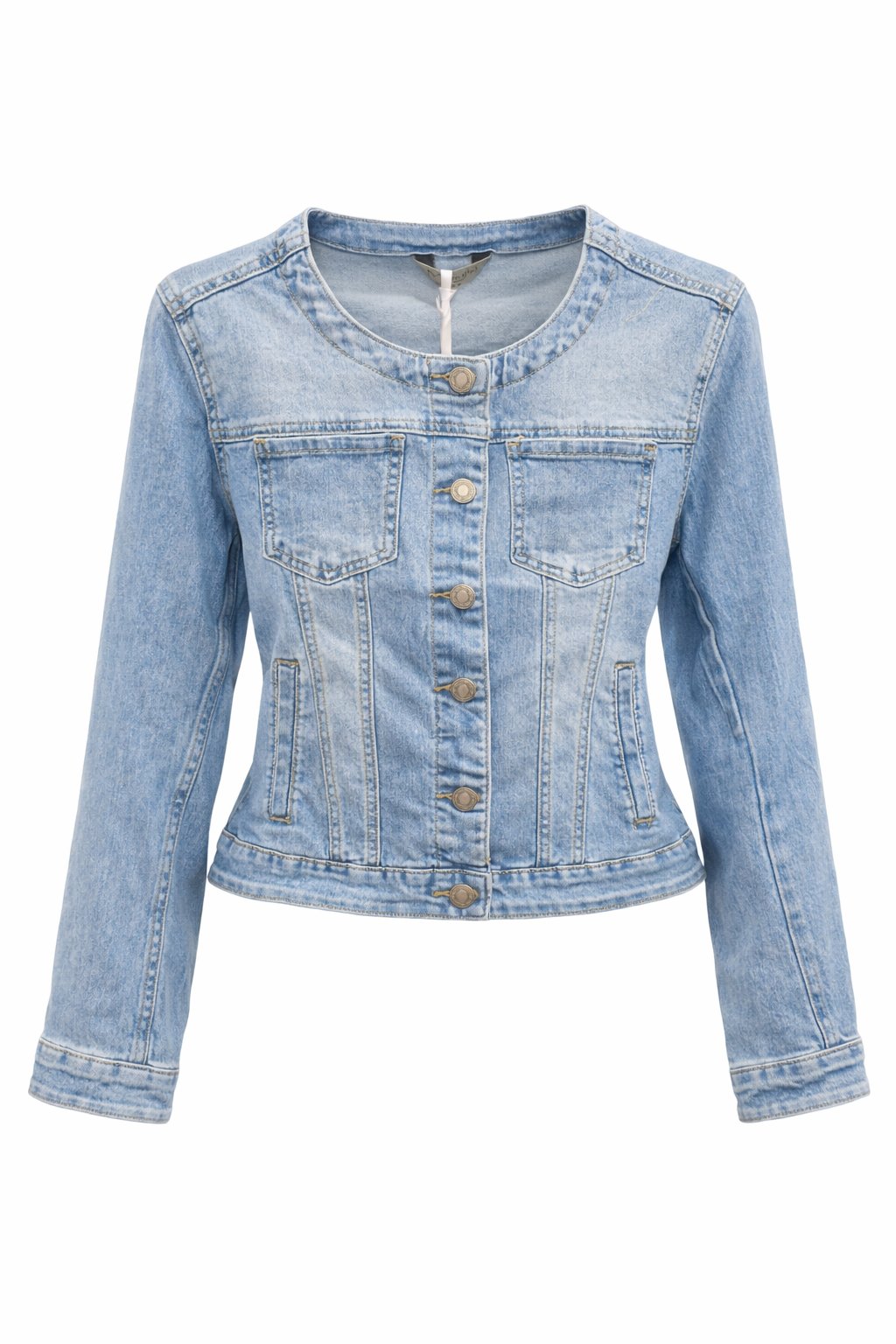 Model je navrhnutý bez klasického goliera, čo mu dodáva elegantnejší a čistejší vzhľad. Vertikálne švy tvarujú postavu a kovové gombíky po celej dĺžke podčiarkujú klasický denimový štýl.