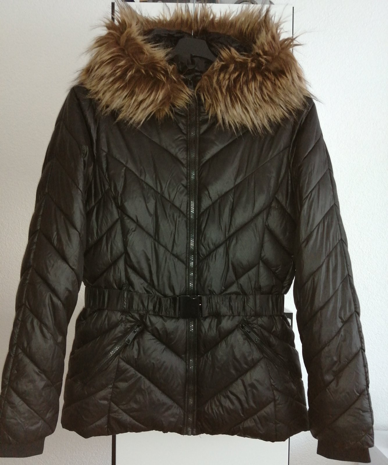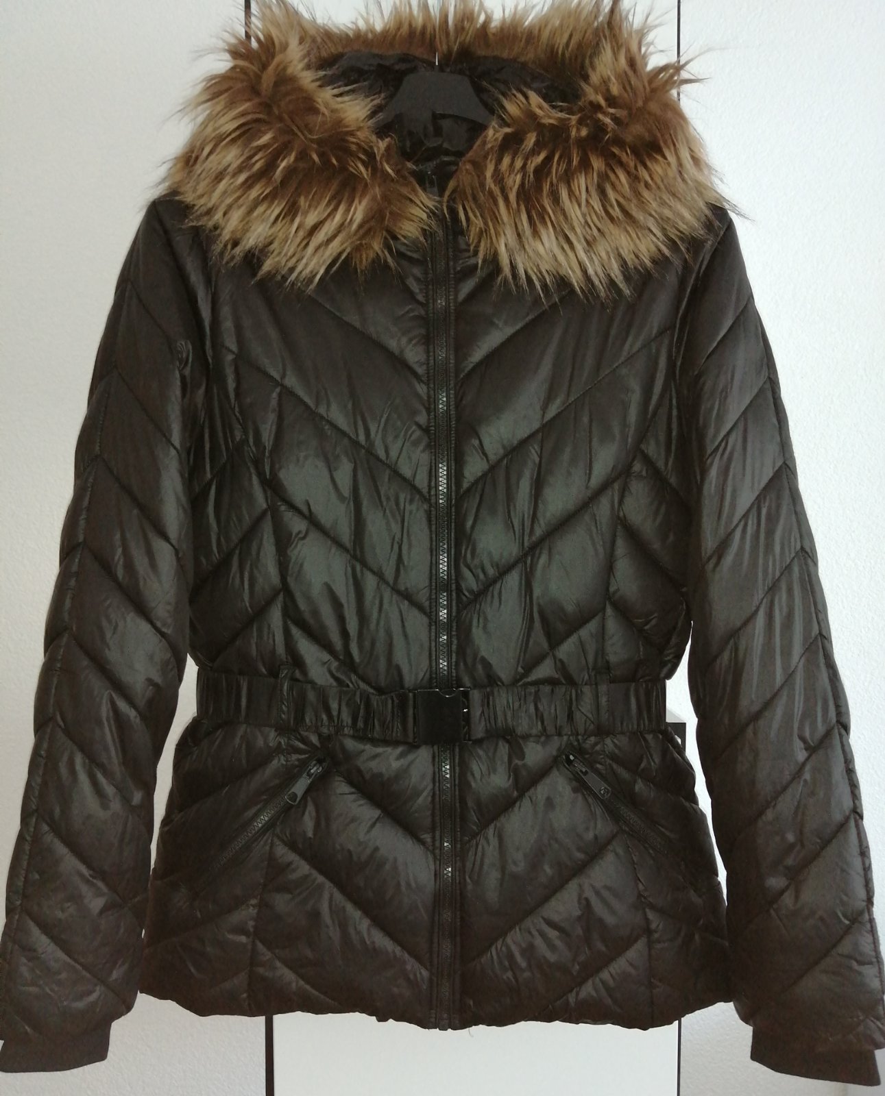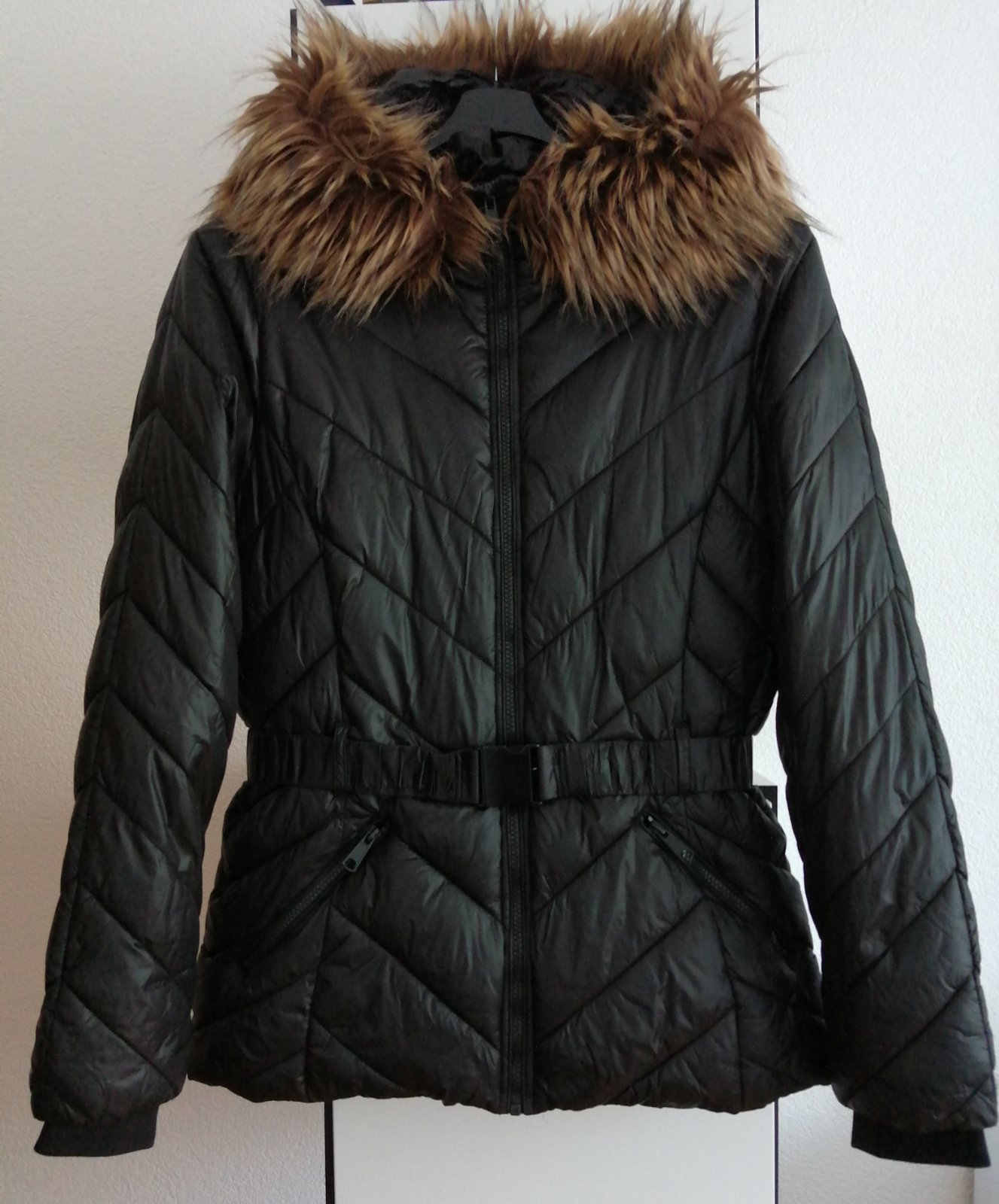 Krásna bunda s odnímateľnou čiernou falošnou kožušinkou z H&M, veľkosť S/36 a aj sedí. Vnútro plnené perím (viď. foto zloženie). Bunda bola príležitostne nosená, bez poškodení. PC bola vyššia.