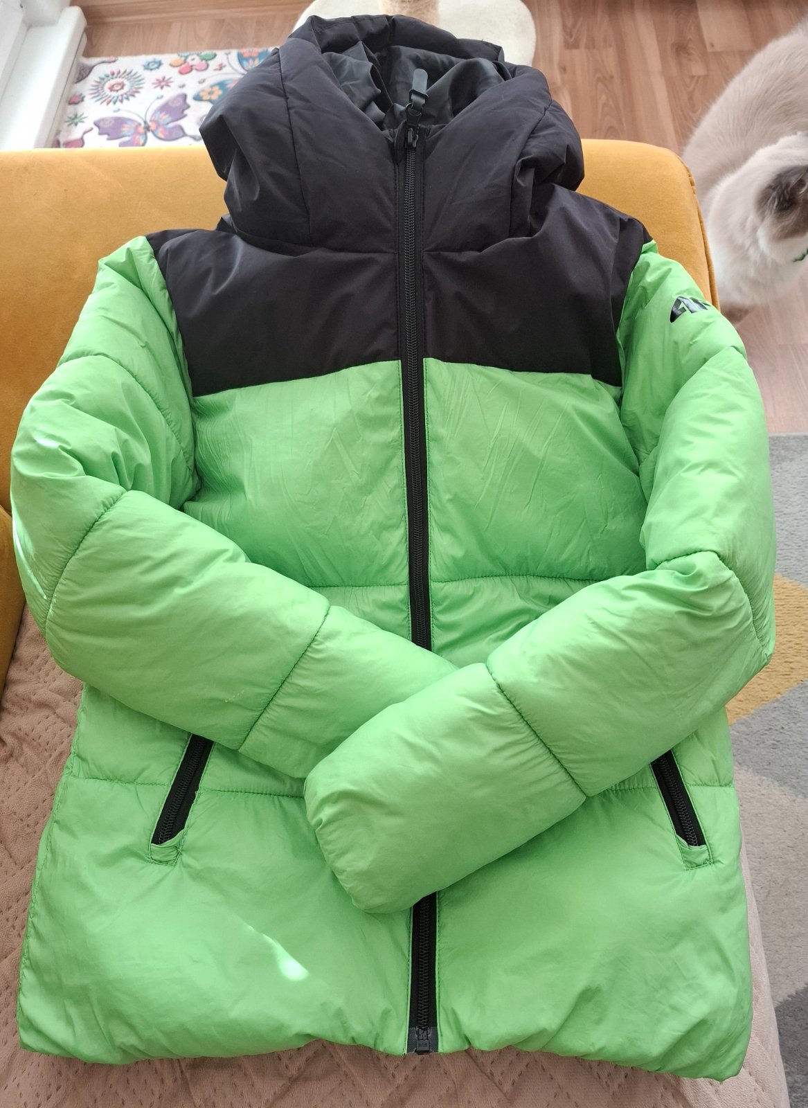 Predam novu zimnu bundu s visackou. Bledozelena farba. Kozusina z kapucne sa da dat dole, kapucna je napevno. Dlzka 82 cm (merana zozadu), ostatne rozmery na fotkach.