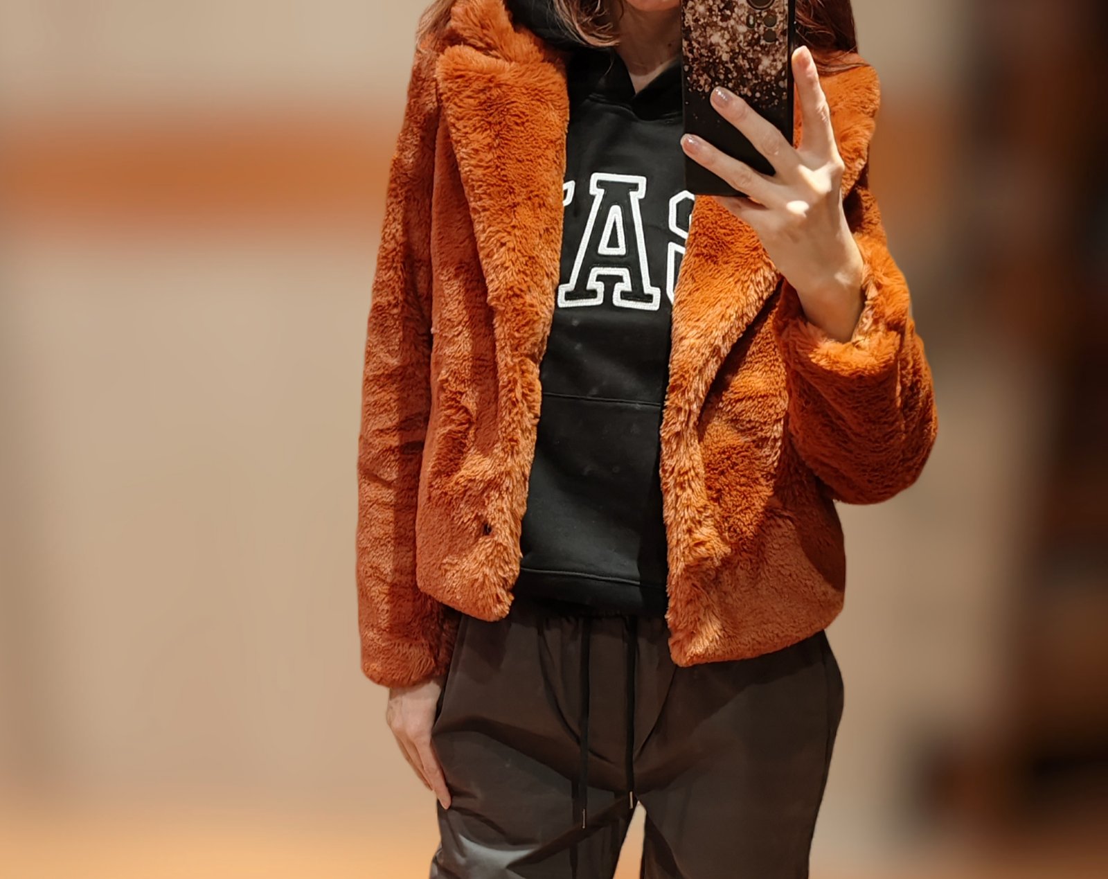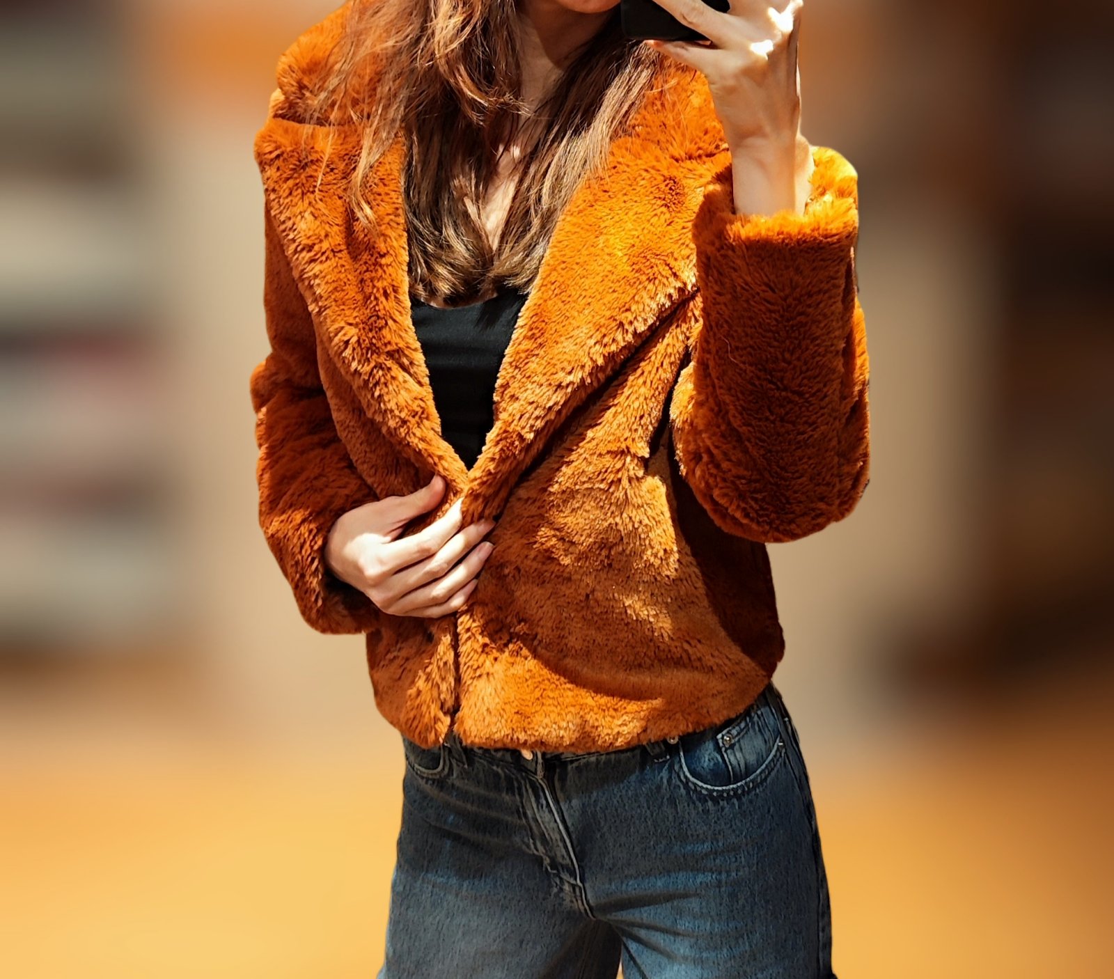 Raz vzatý kožuch (Teddy kabátik ) v oranžovo - tehlovej farbe, sedí na xs-s. Nejedná sa o pravú kožušinu.