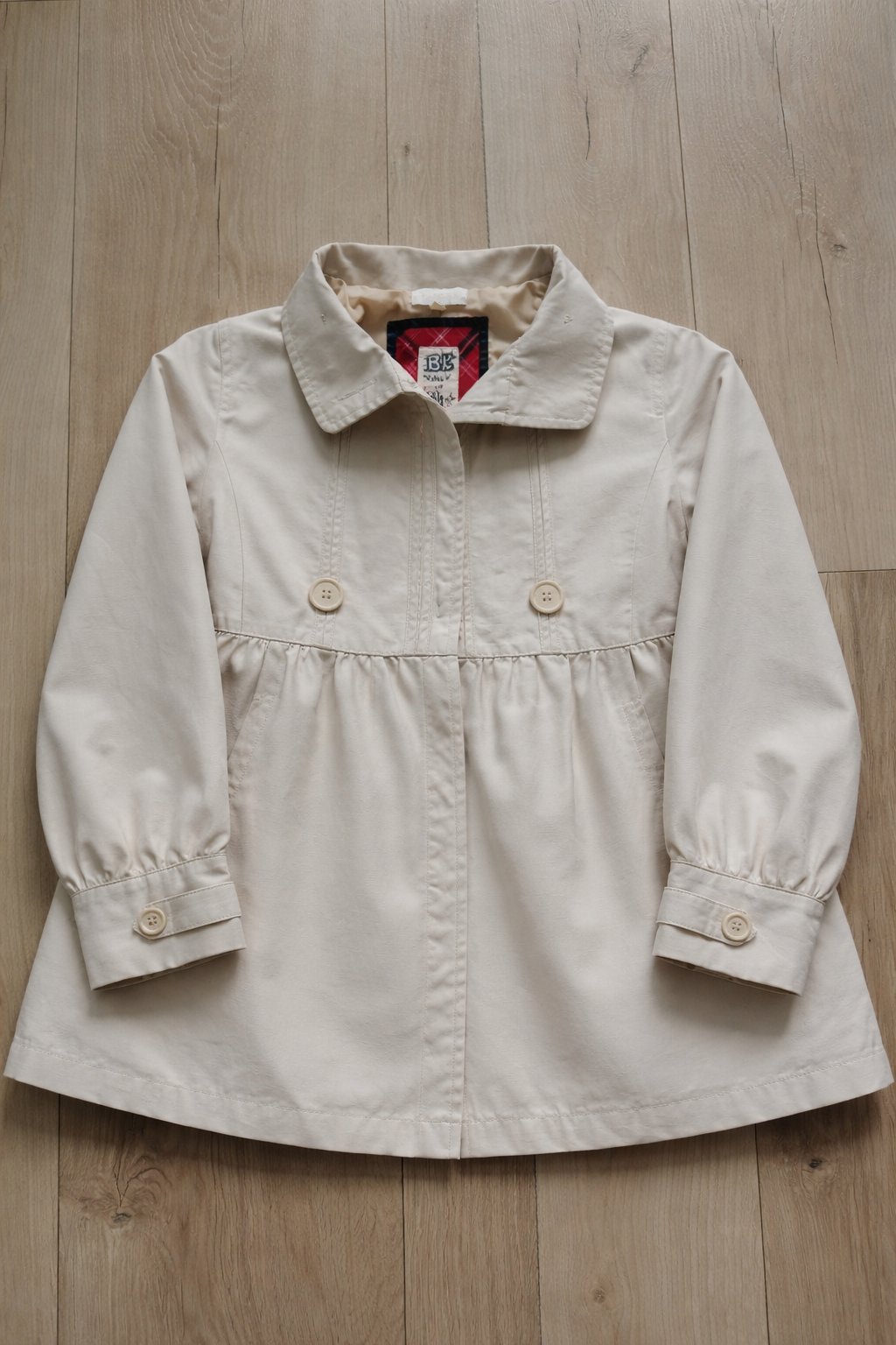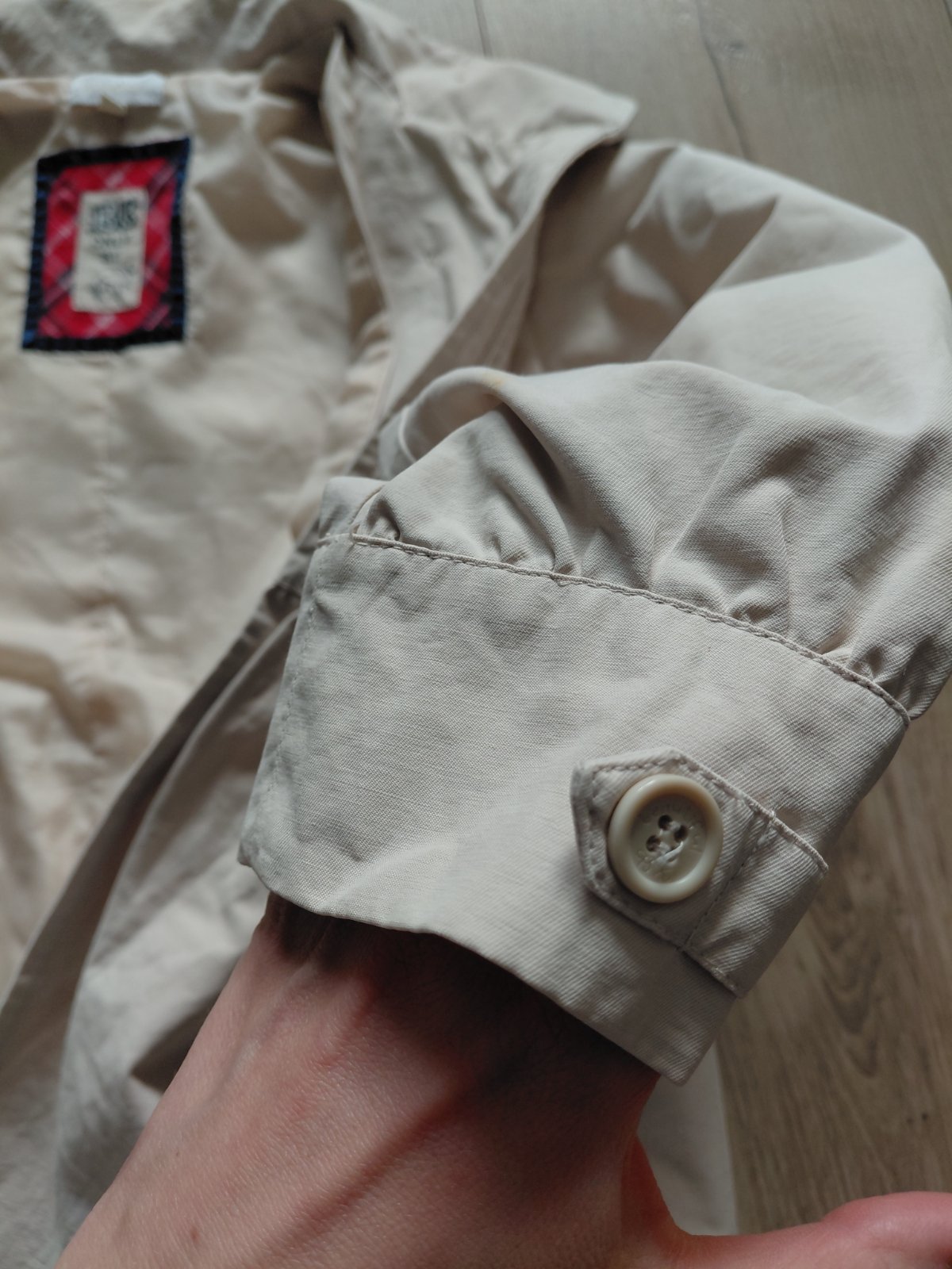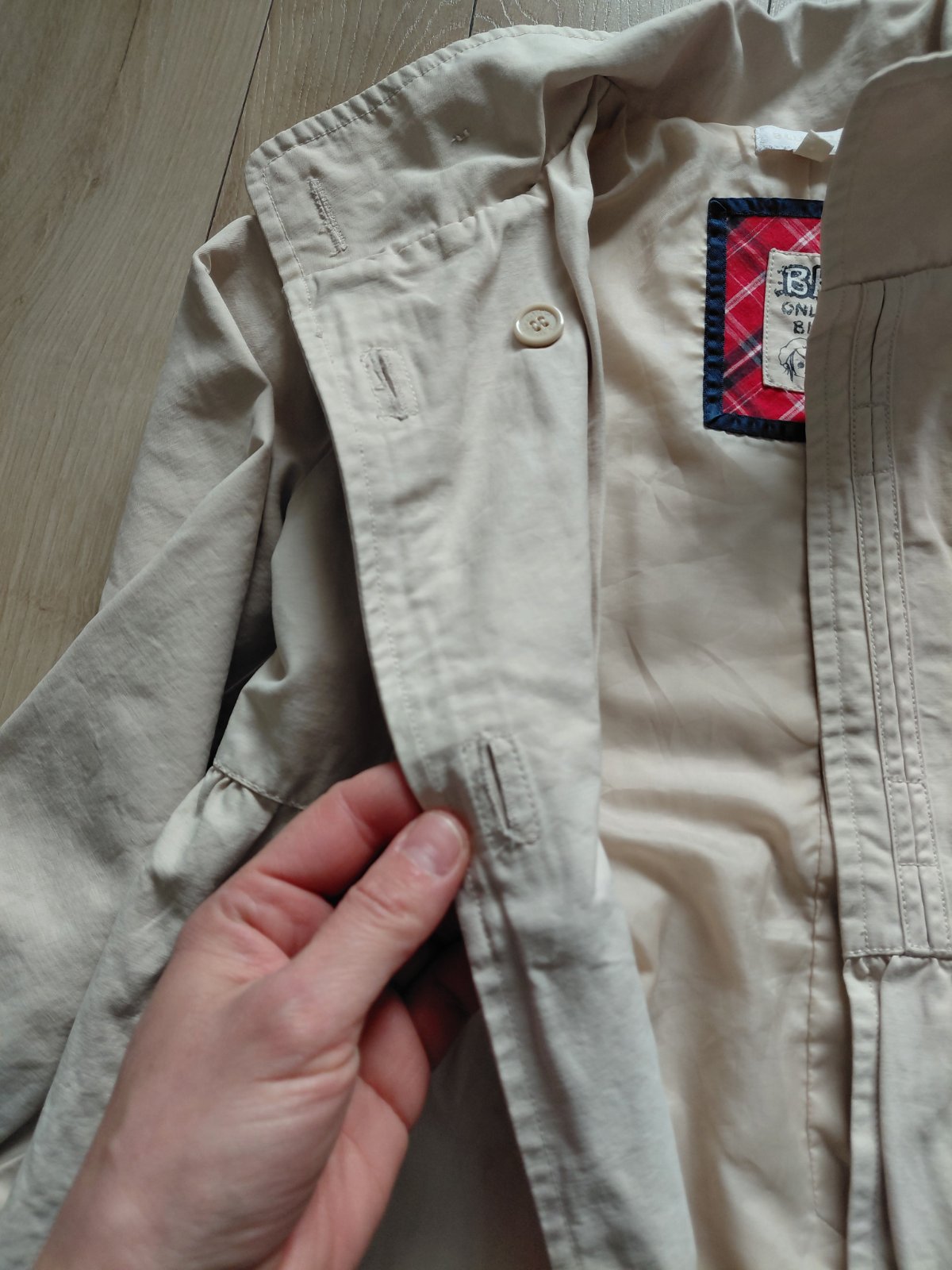 Prechodný kabatik, vo velmi dobrom stave bez poškodení zapinanie na gombíky. Farba jemná krémová ako na prvej foto.
