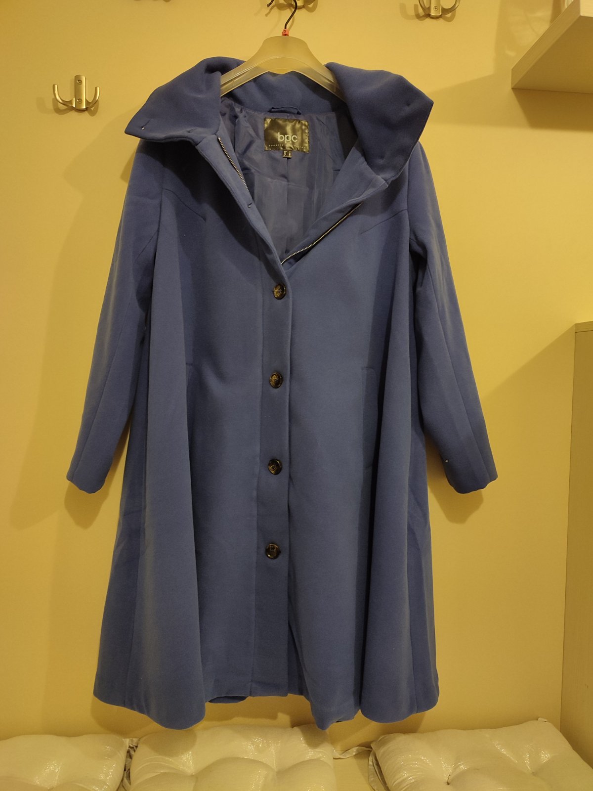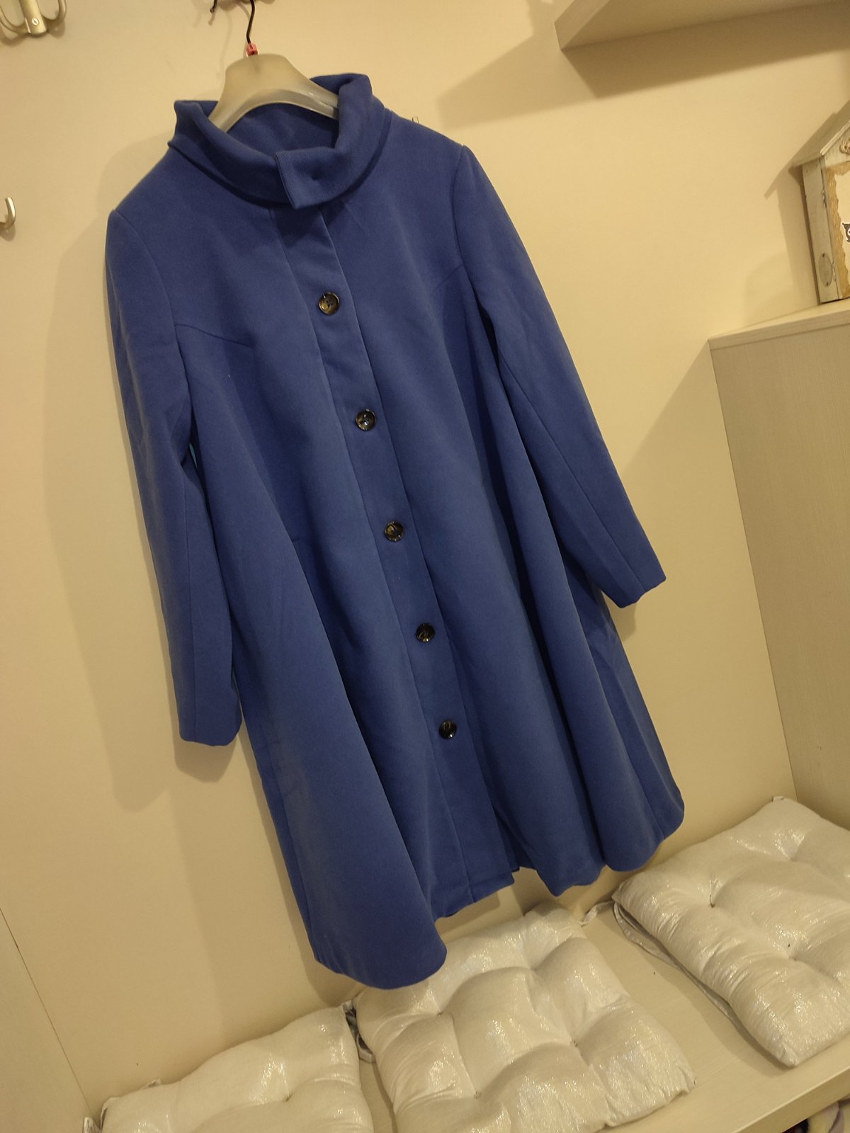 Len vyskúšana, nádherná teplá bunda/kabát, zavinovacia s vnútornými cvockami, modrá s nádychom do slivkovej, veľkosť na štítku 46, zodpovedá L/XL, strih do A, šírka pod pazuchami cca 53 cm, dĺžka 8...