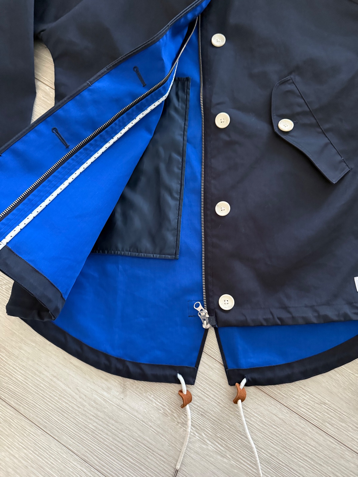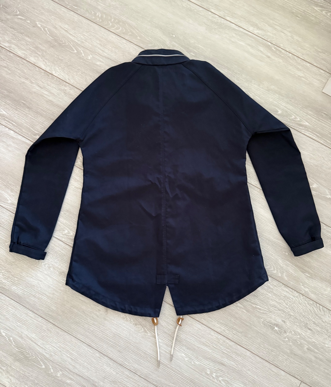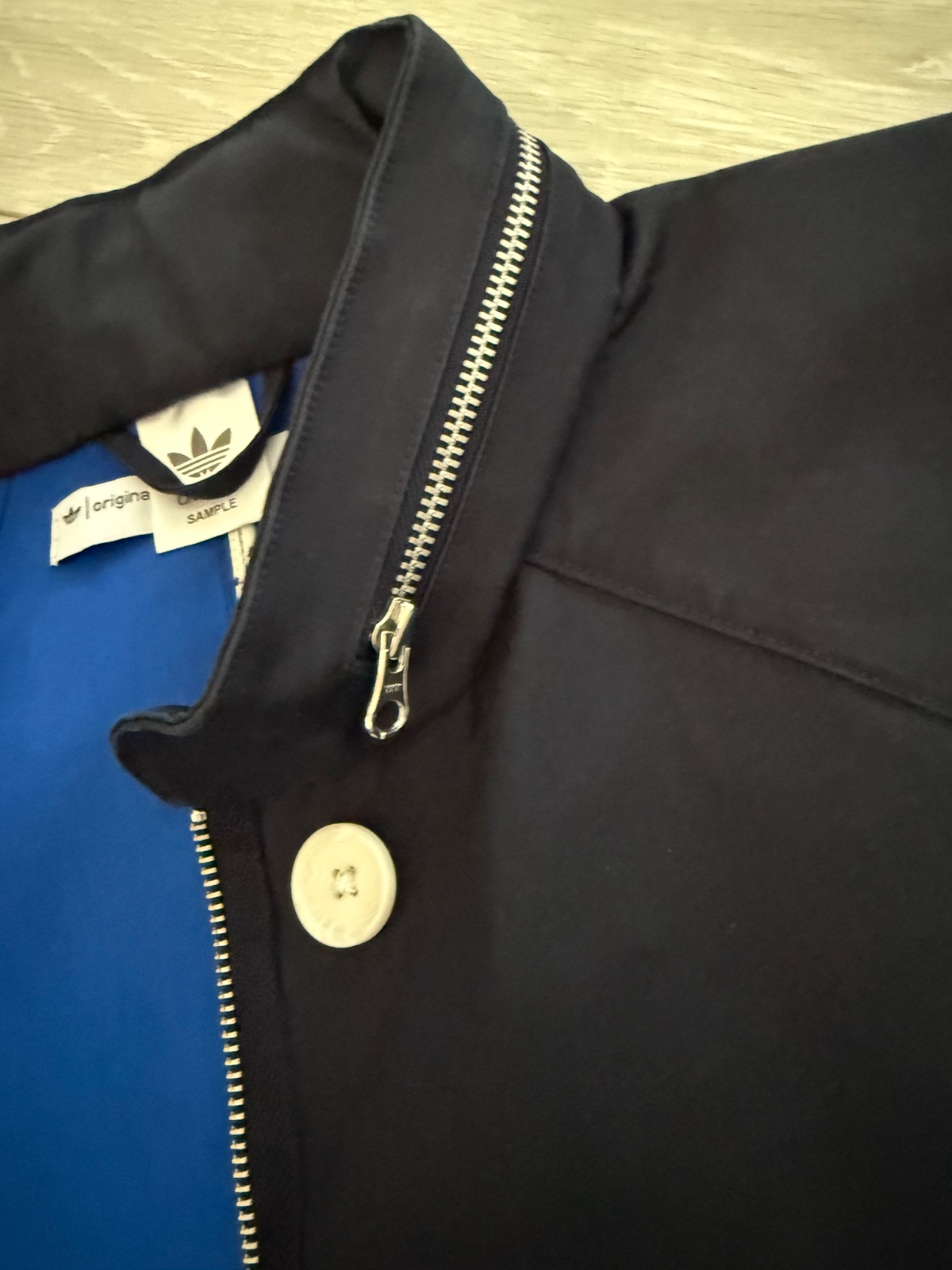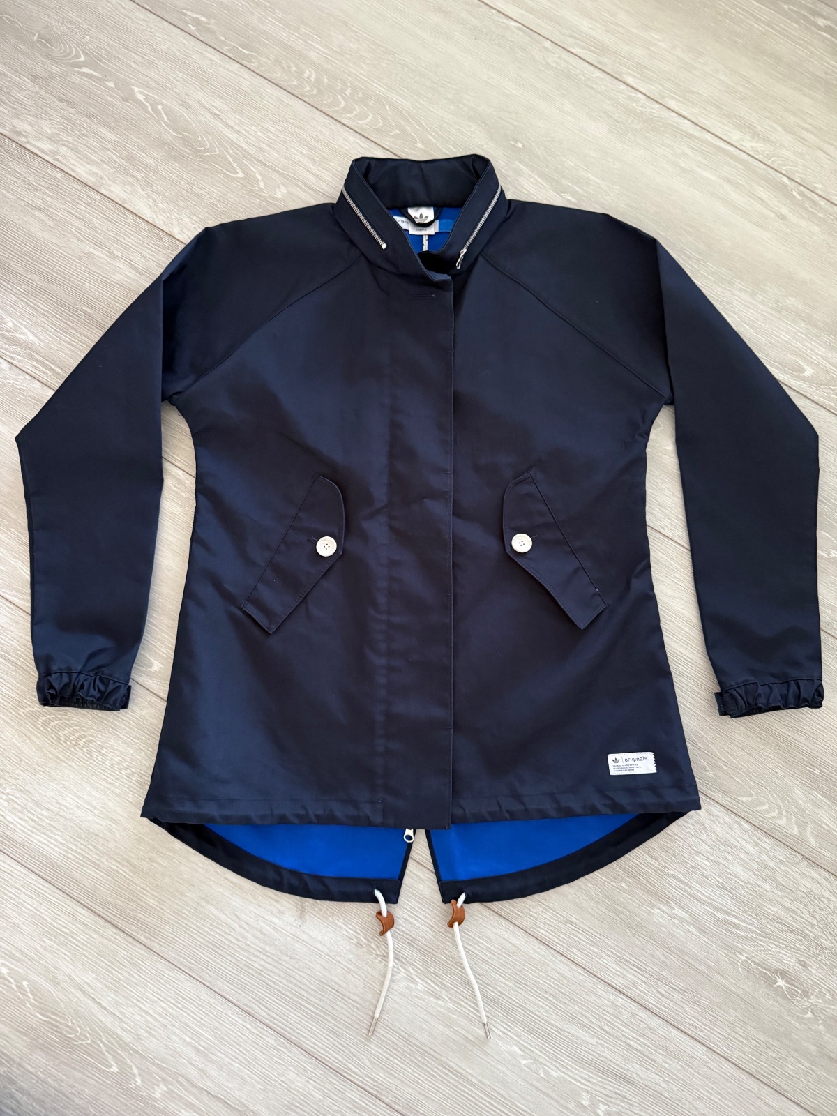 Športovo-elegantná bunda, kabátik Adidas. Veľkost 36 sedí na 38(M). Tmavomodrá farba, biele perletove gombíky, obojsmernný zisps, v kapucno skrytá tenká kapucna. Ako nová, žiadne známky nosenia. Šírka prsia 55cm.