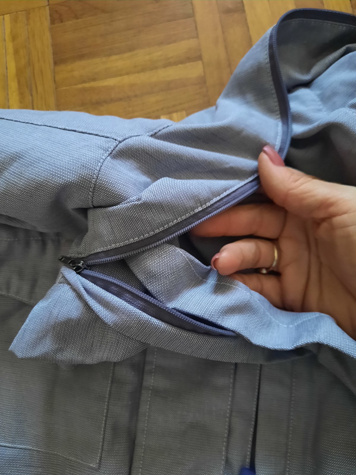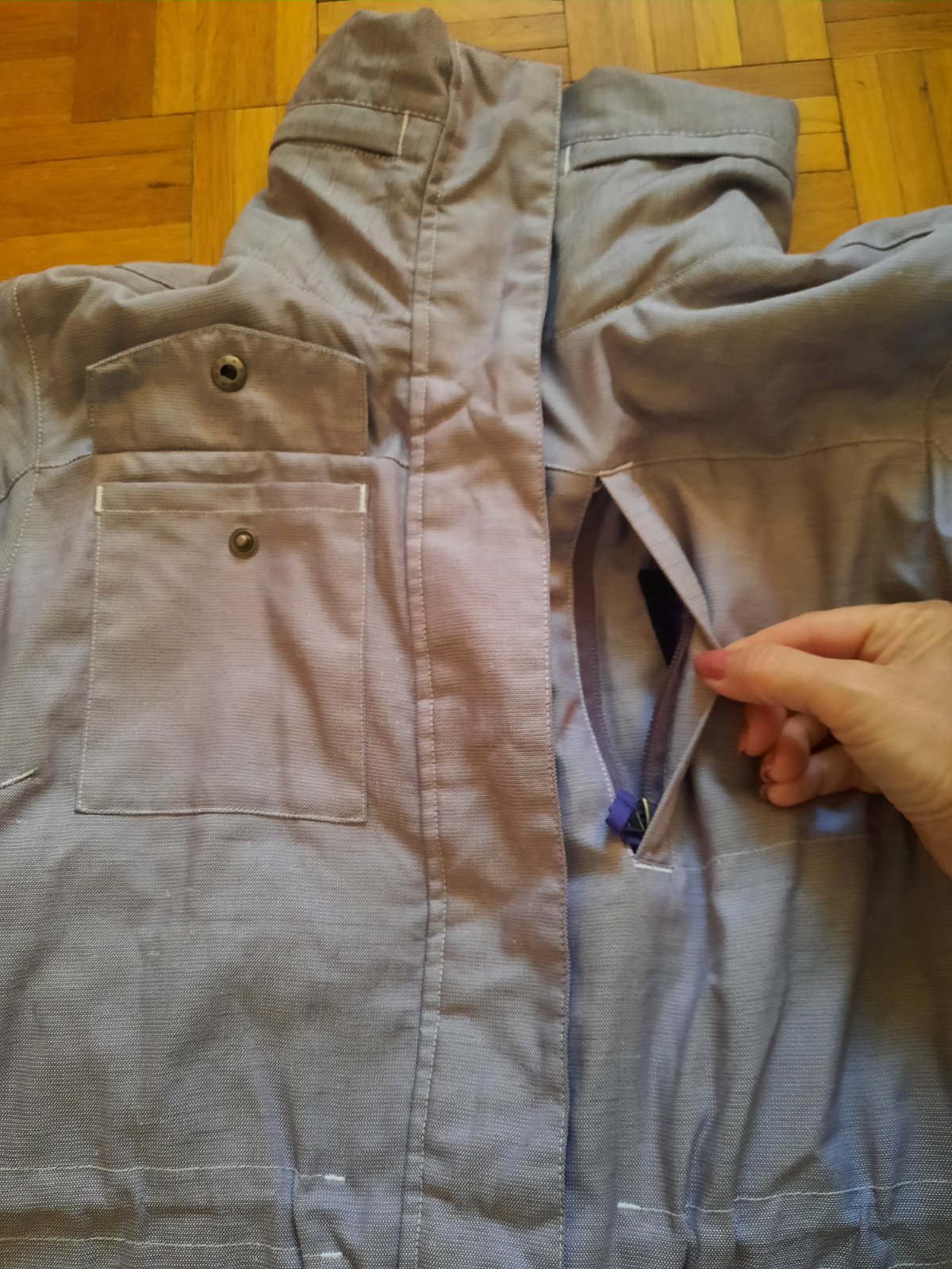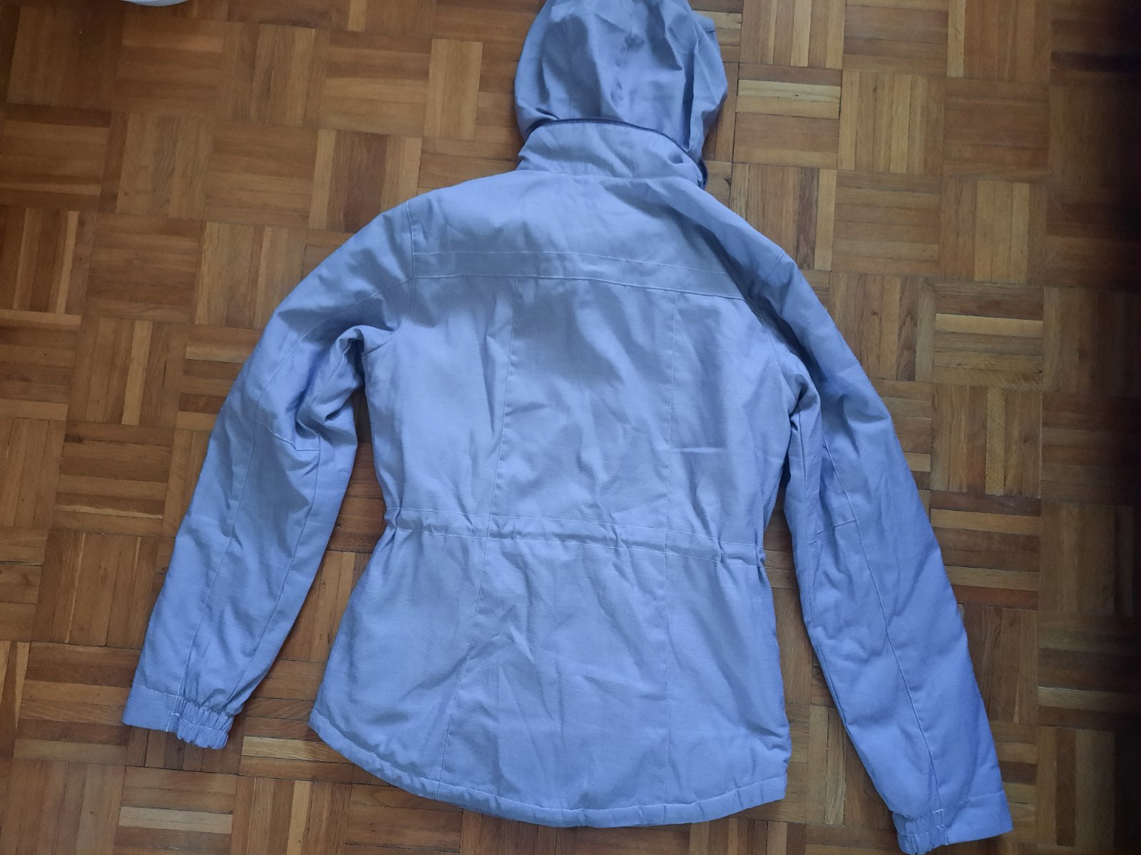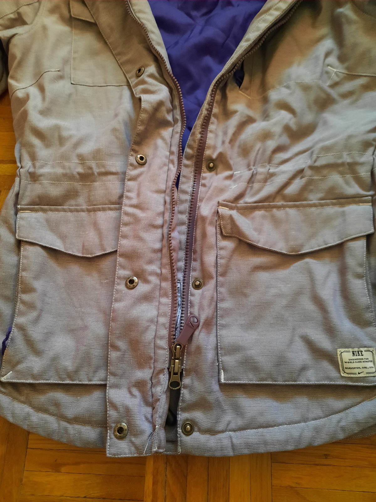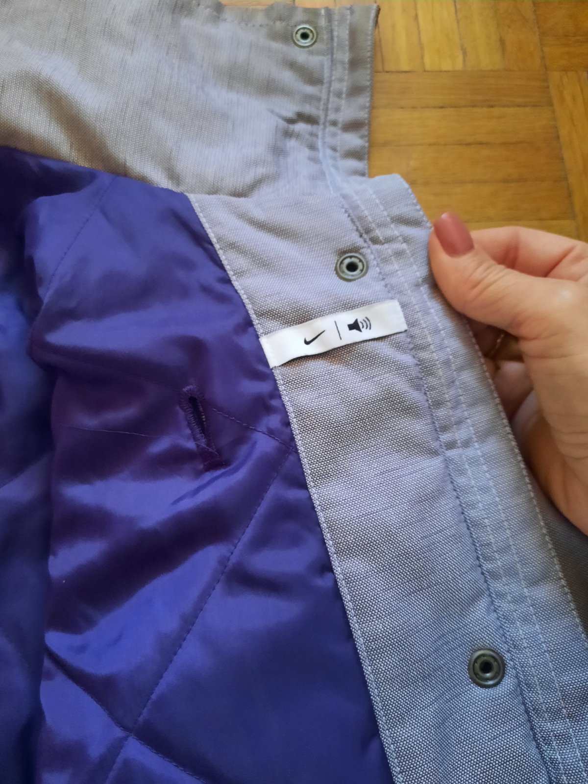 Super dámska Nike bunda vo výbornom stave. Príjemný materiál. Vačky sú vpredu, spodné sa zapínajú na nit, horný na zips. V páse je šnúrka na zaväzovanie. Kapucňa je schovaná pod golierom. Veľkostne sedí aj na M podľa mňa.