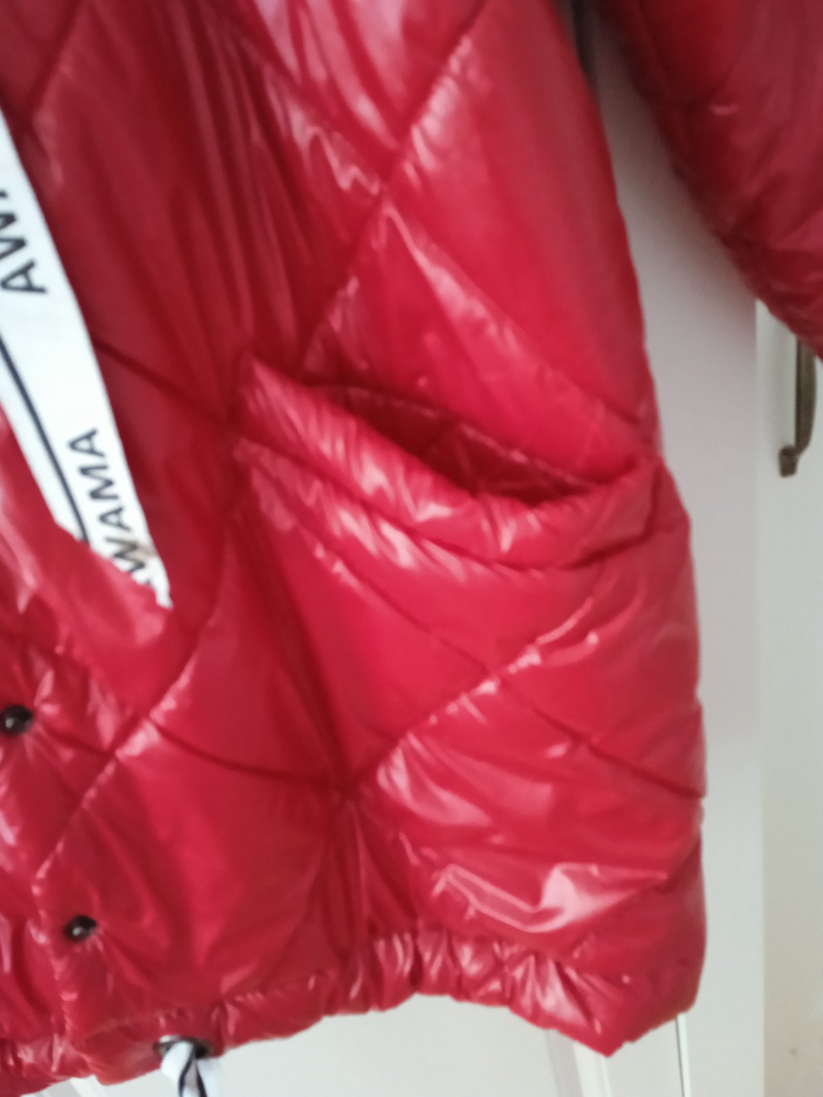 Sýto červená bunda na jesenné obdobie a miernejšiu zimu. Owersize veľkosť sedí na M,L,XL. Zapínanie na cvoky. Kapucňa je na pevnom. Lesklý efekt materiálu..