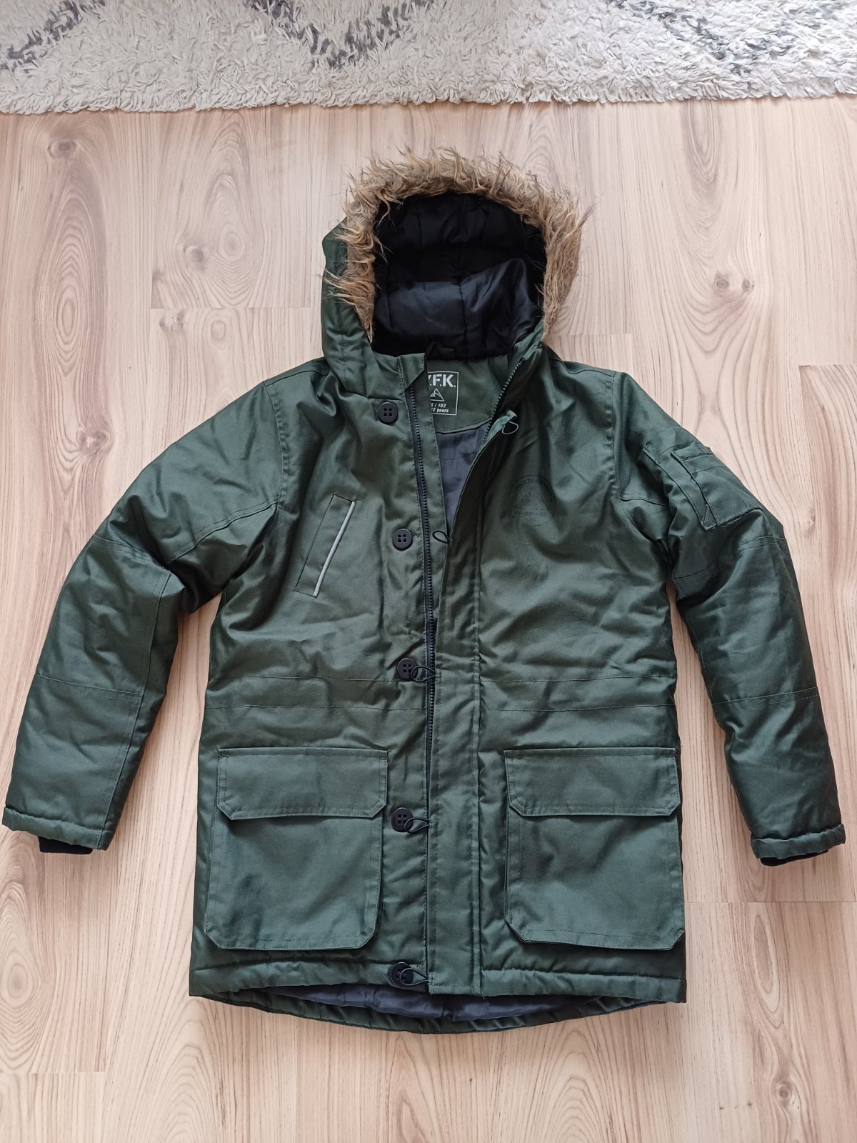 Veľmi pekný noseny stav, nema žiadne veľké poškodenia, len pri krku ako je pútko sa začala parať. Je to zašlite. Bunda je veľmi tepla, vhodná do silnejsich mrazov.