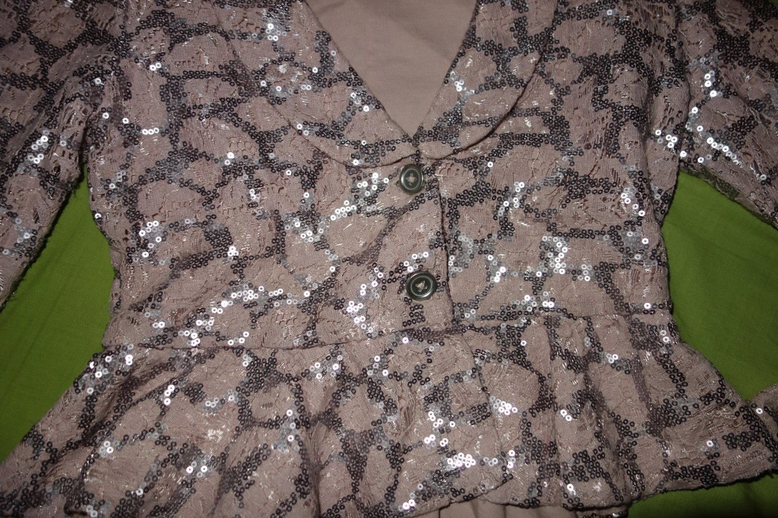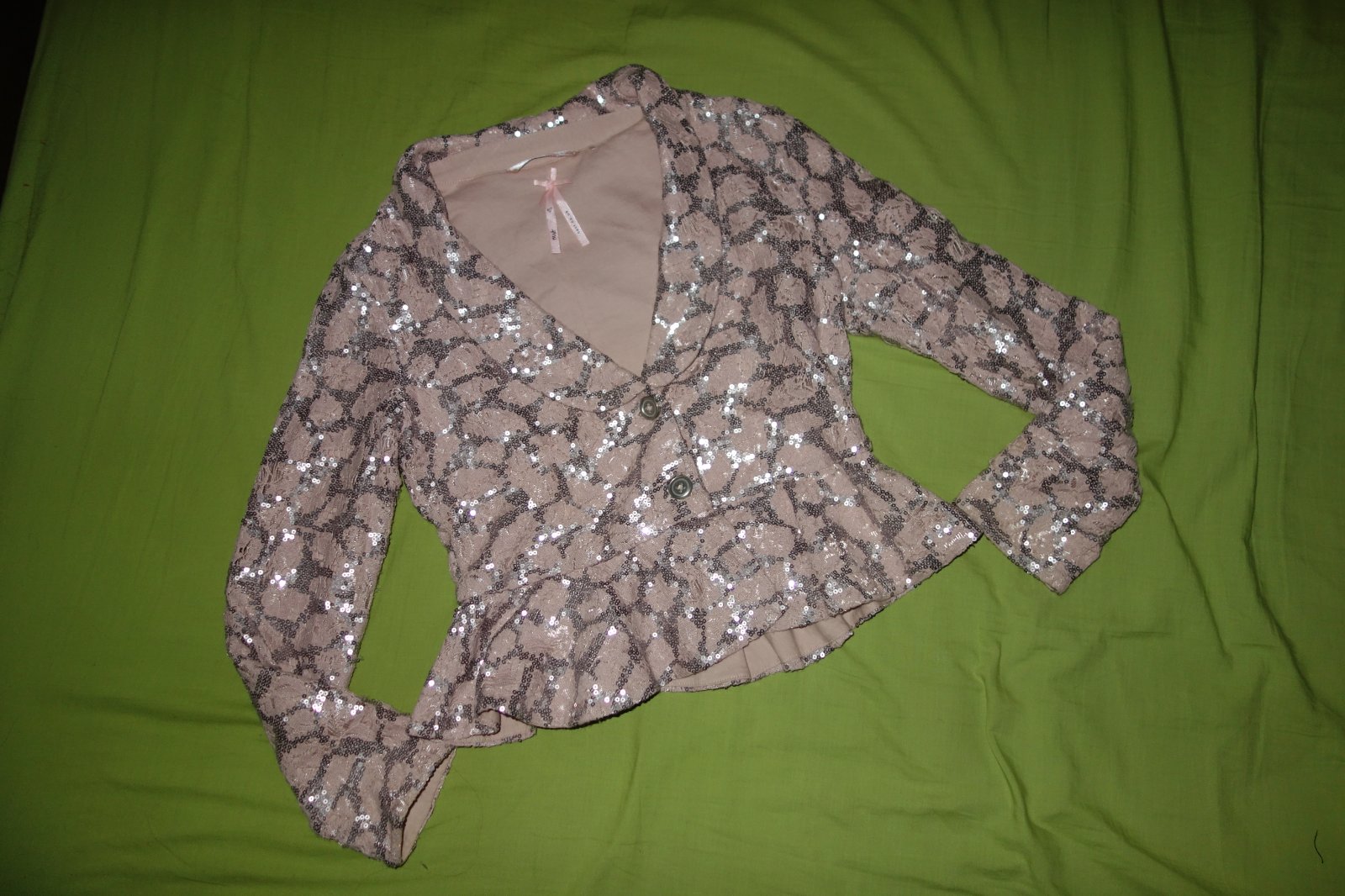 Krasne cipkove sacko s flitrikmi vo velmi dobrom stave. Je staroruzovej farby.