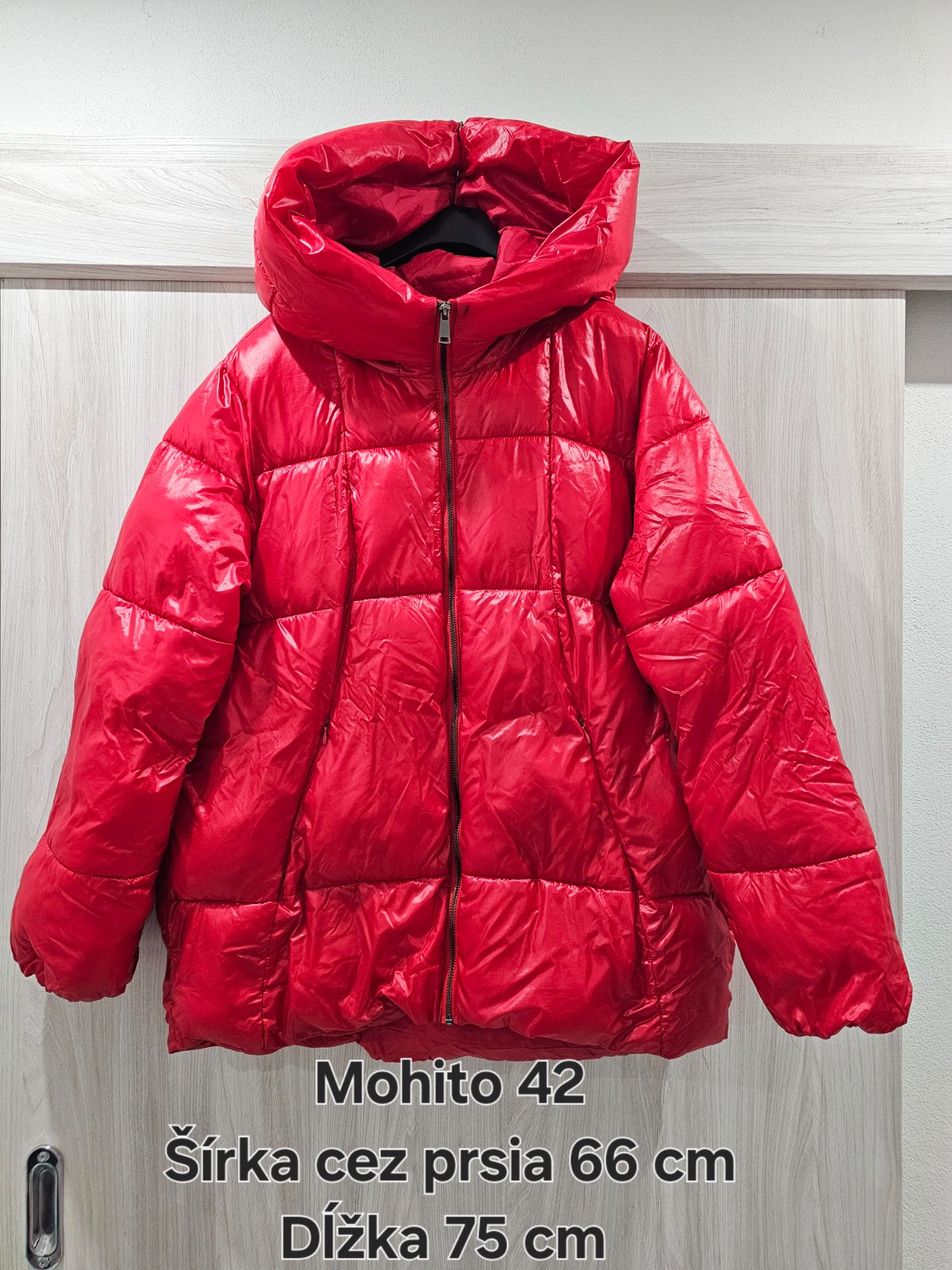 Teplá ľahká zimná bunda, málo nosená, necitim sa dobre v červenej farbe. Popri zipse na 2 miestach odtlaceny zips, bude treba niecim skusit vyčistiť. Inak bez poškodení