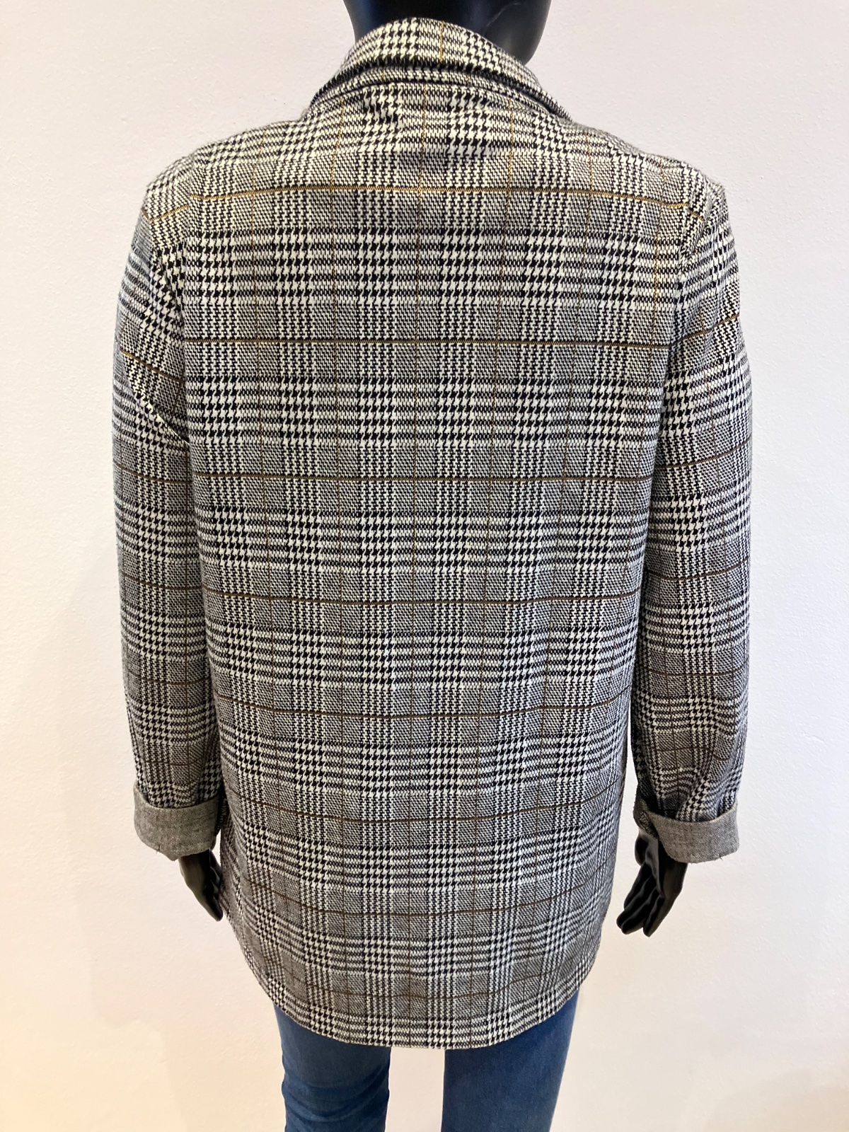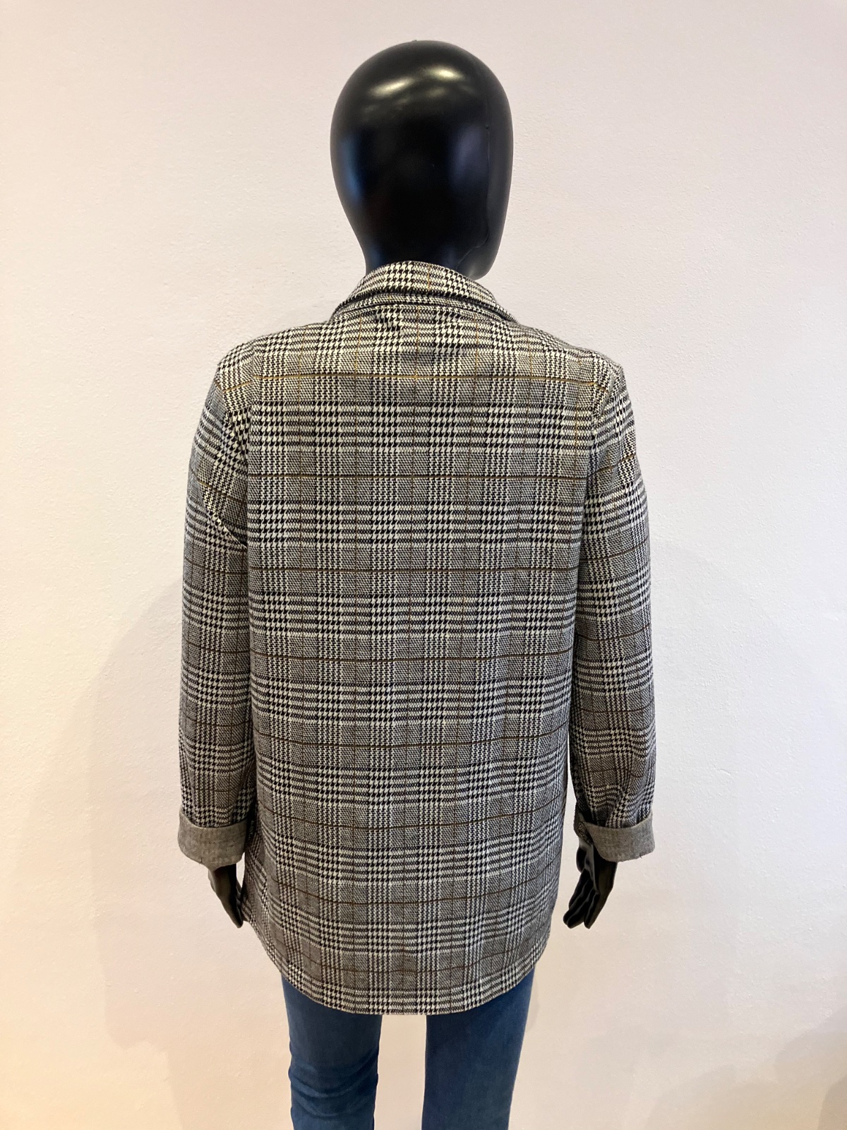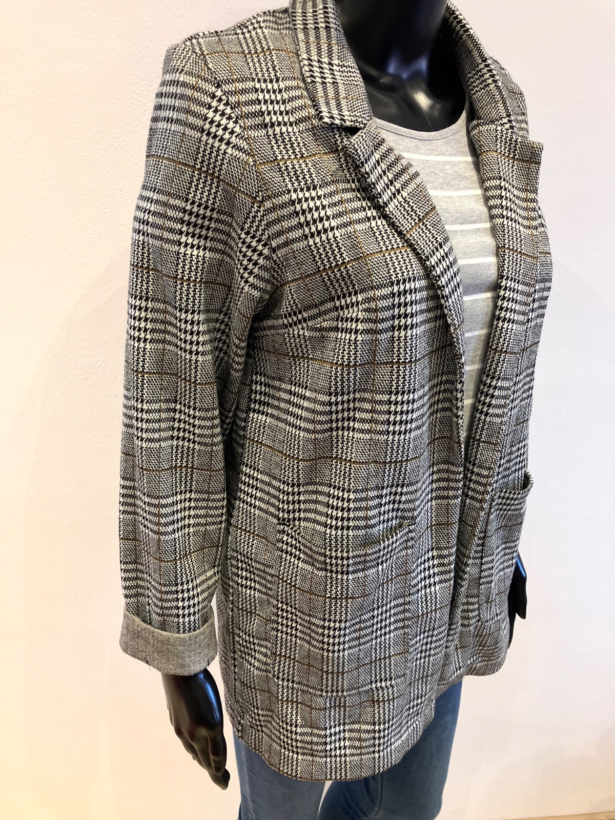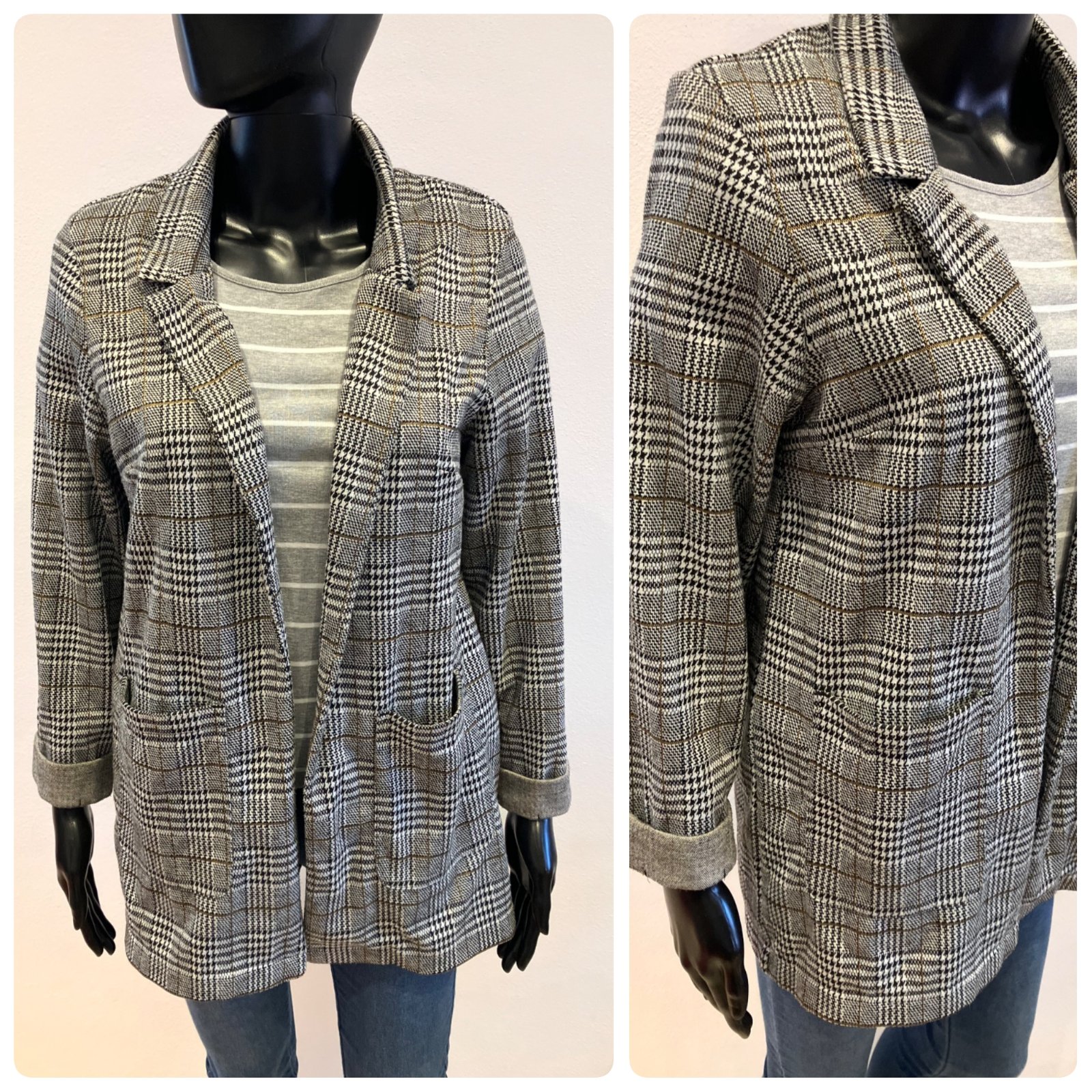 Dámske vzorované sako bez zapínania, dve predné vrecká, elastické, materiál 74%polyester 24%viskóza 2%elastan.