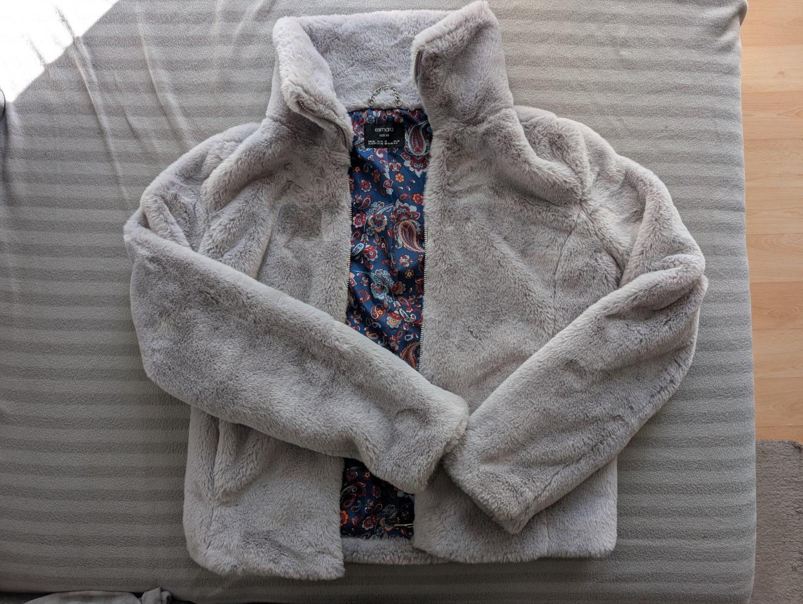 Chlpatá bundička sivej farby so zapínaním na zips, bez poškodení.