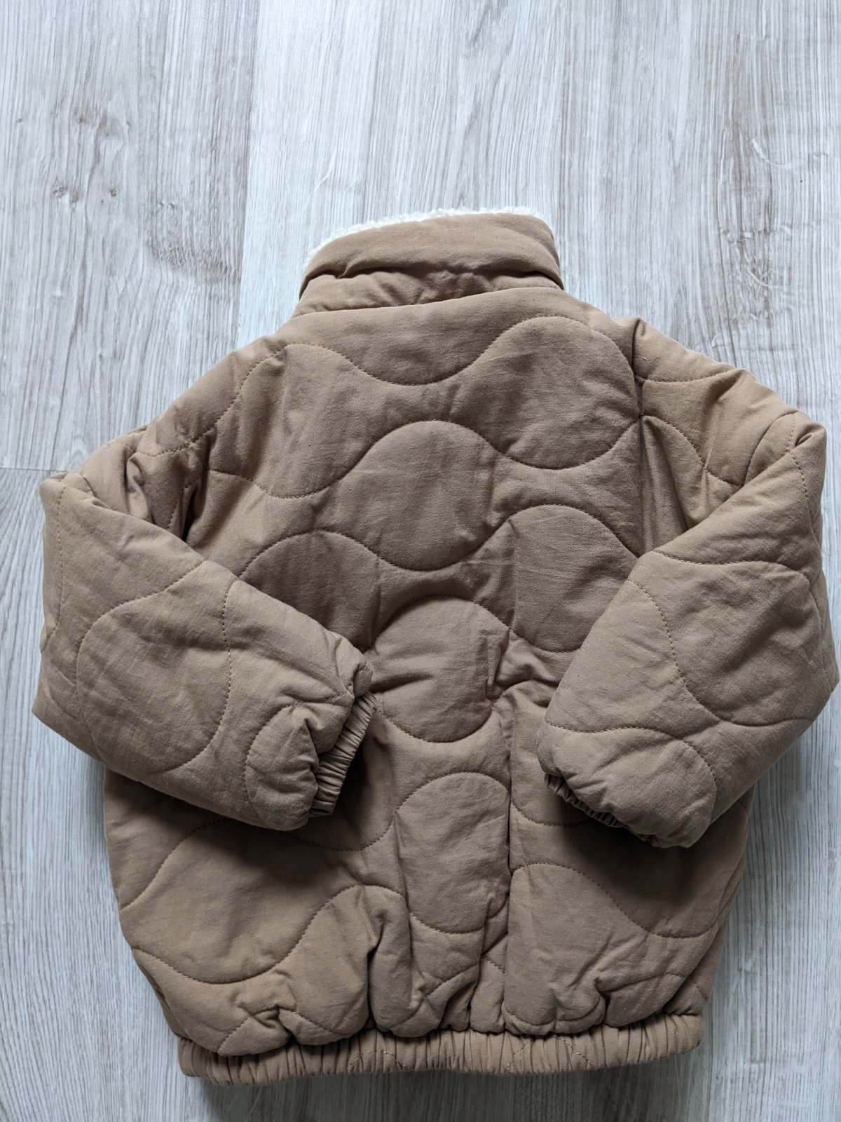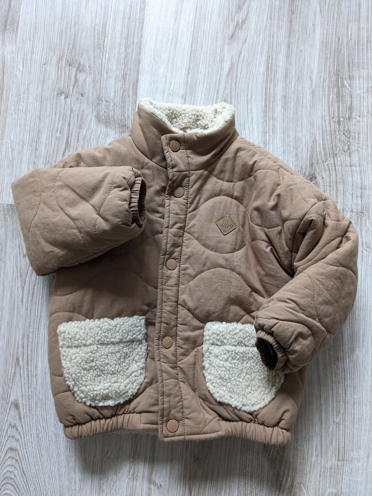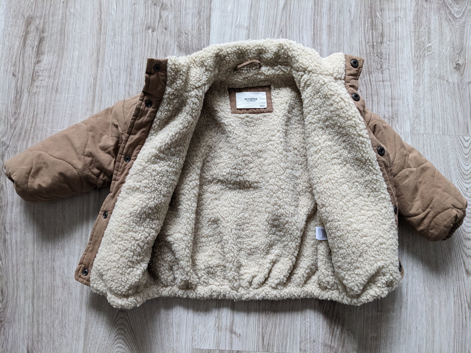 Nosená len mojím synom, nepremokavá, zateplená látkou, na zips+ štyri cvoky, dve bočné vrecká na cvoky, pogumovaná, na dotyk veľmi príjemná bunda. Len pri krku malé odlupnutie látky, viď foto, ináč...