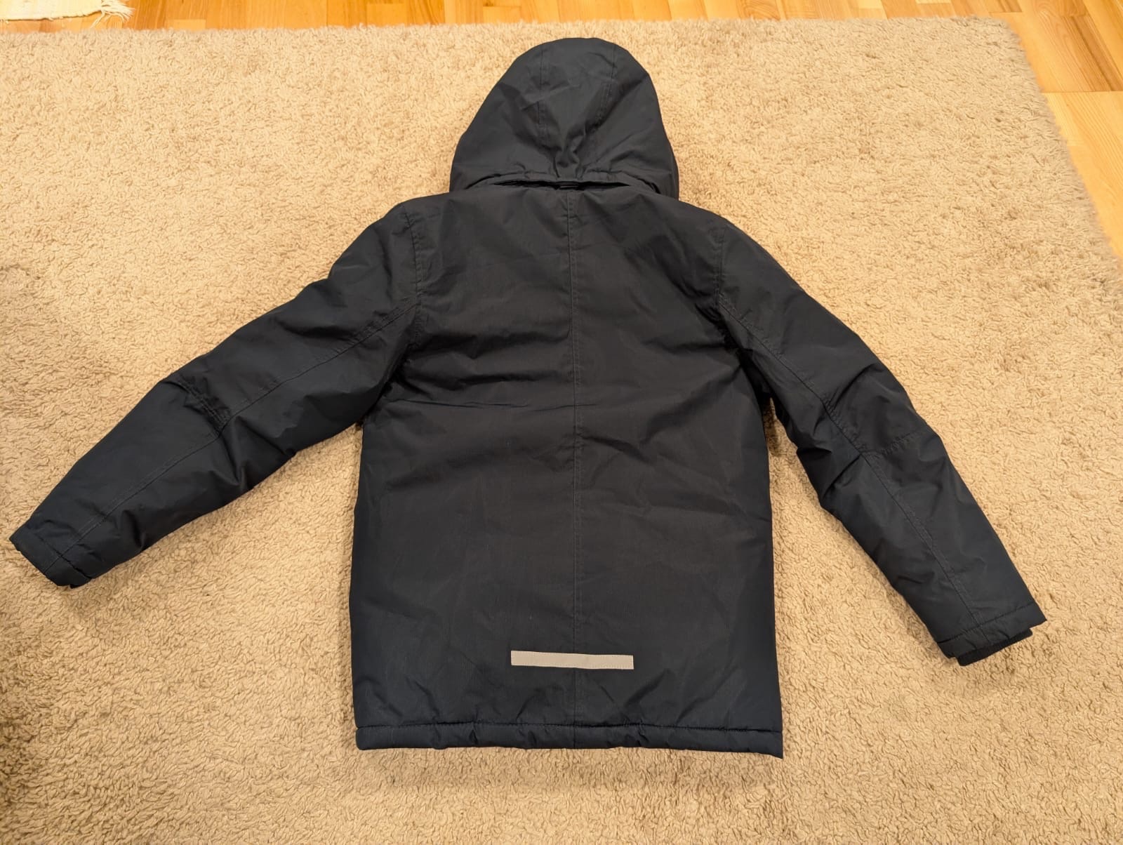 Modrá bunda bez poškodenia má reflexné prvky Šírka -53cm x 2, dĺžka rukáva od ramena -59cm , celková dĺžka 63cm Kapucňa je odopinatelna + Pošta