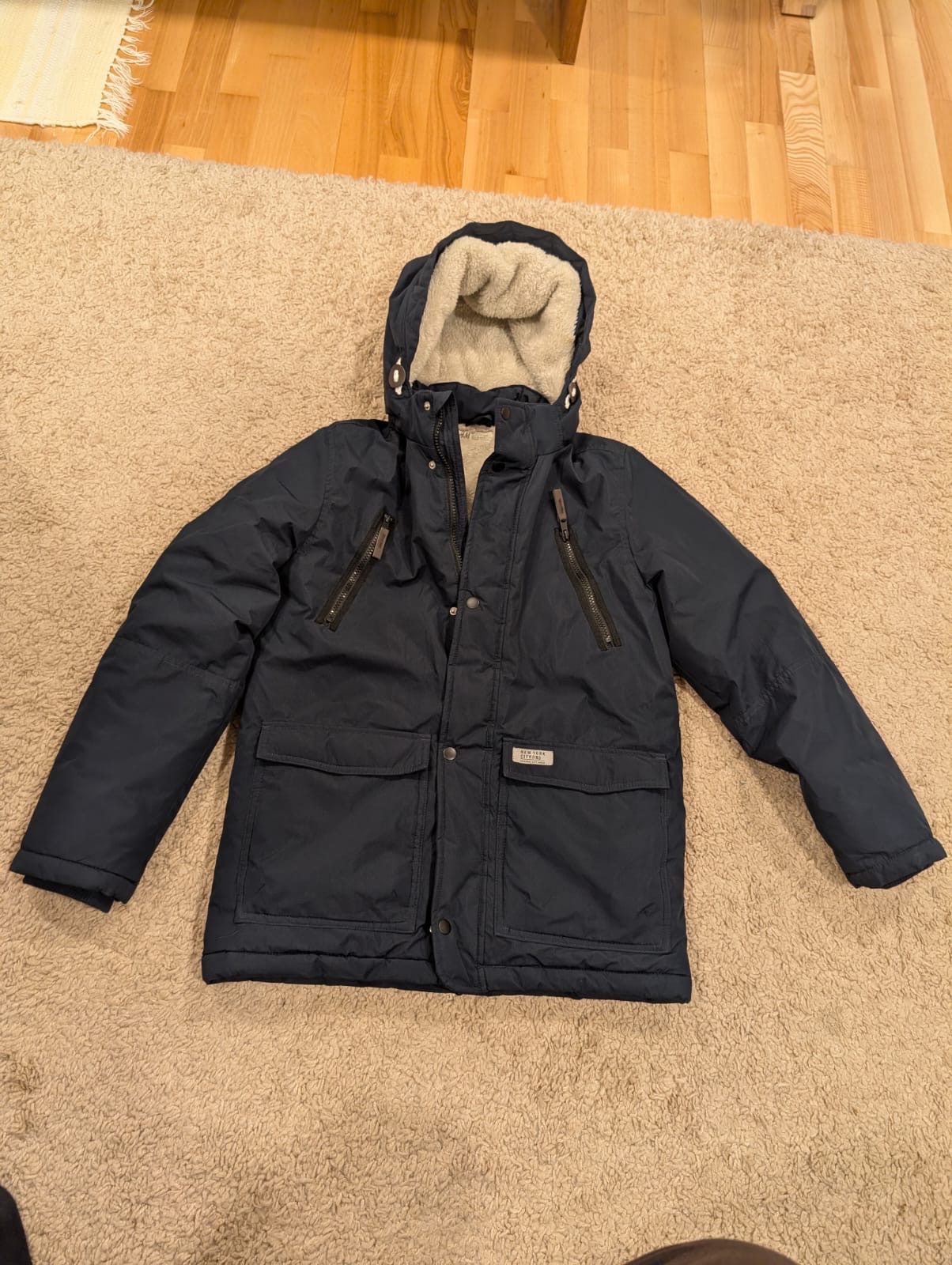 Nová zimná bunda pre chlapca vo veku 12 13 rokov veľkosť 158 centimetrov patenty v rukávoch zapínanie na zips vaky kapucňa odnímateľná vhodné aj ako dar