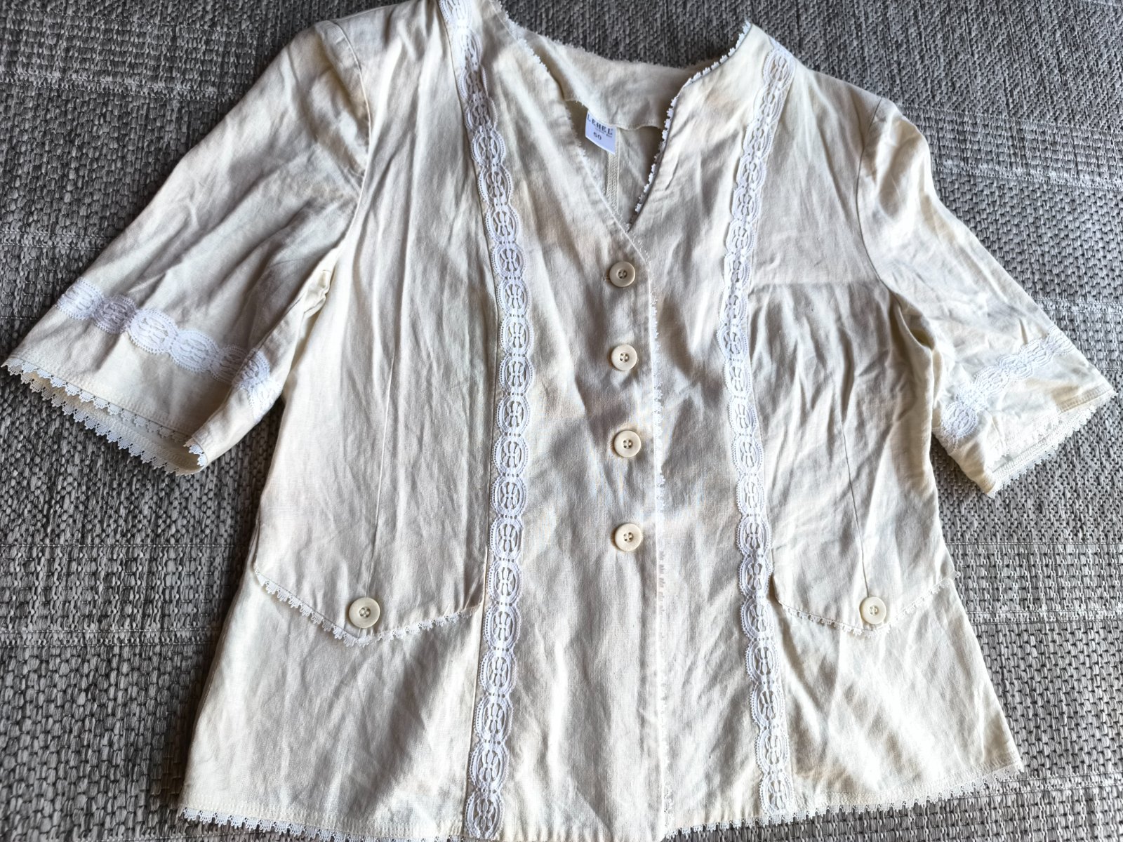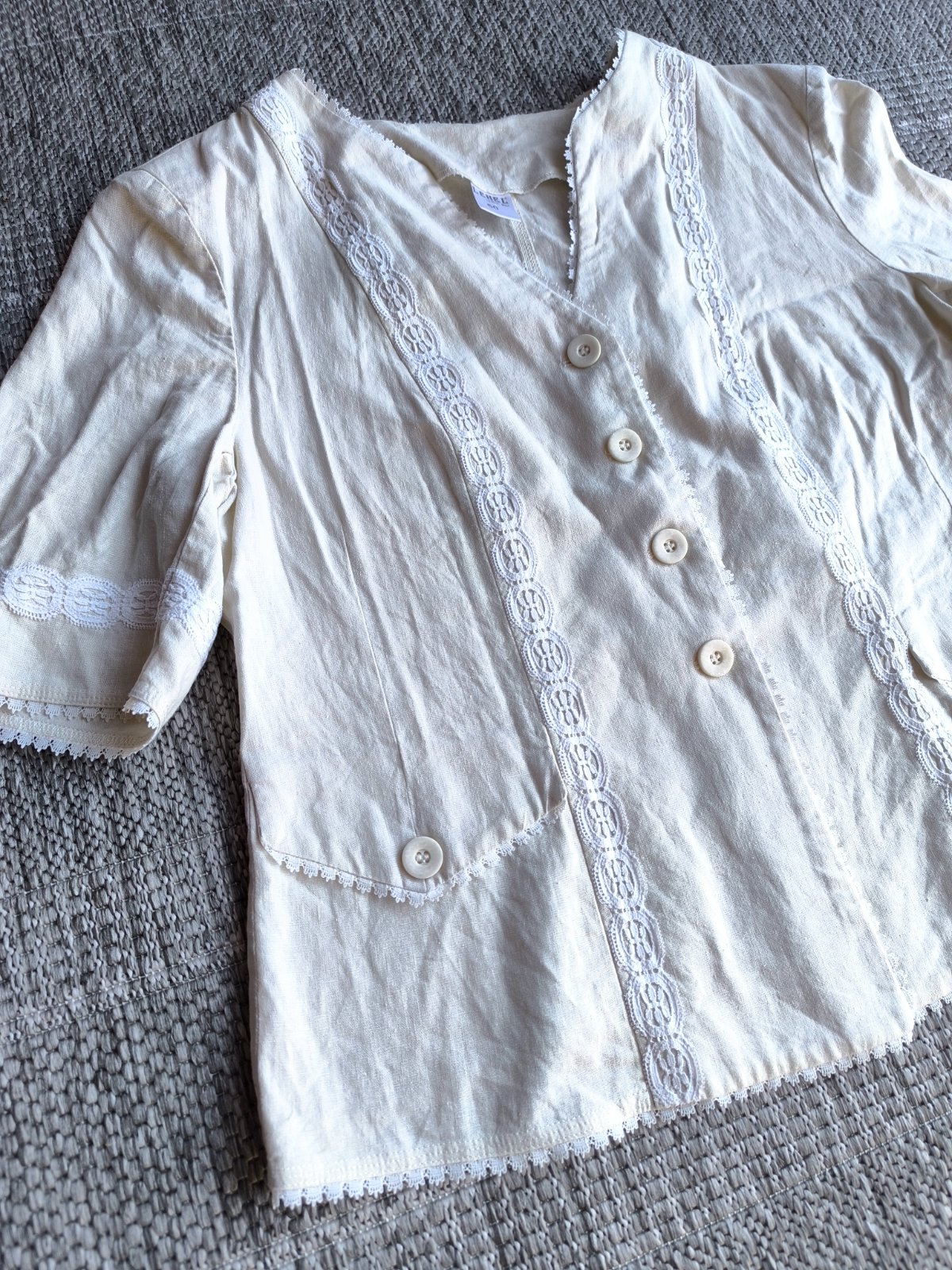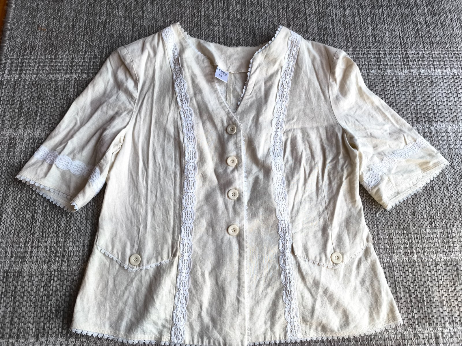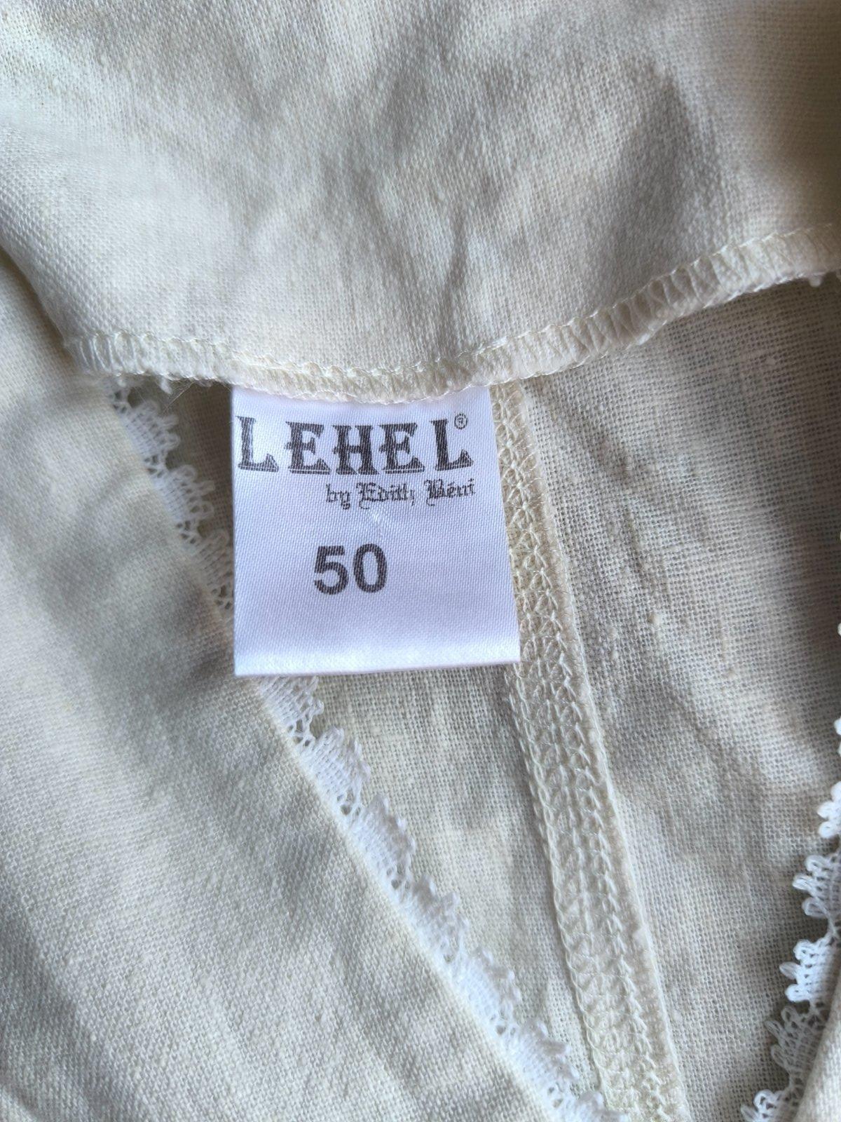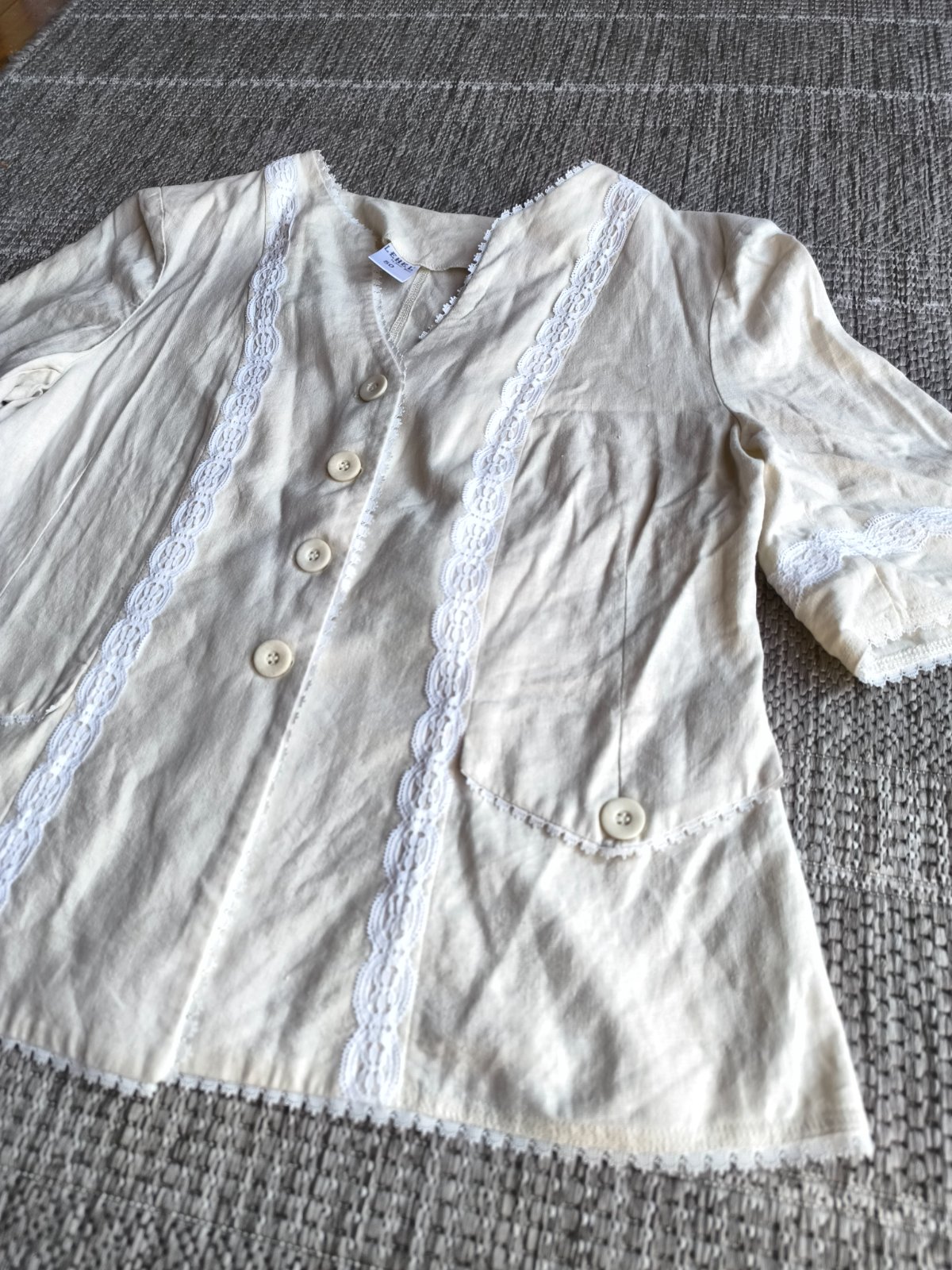 55% ľan, 45% viskóza. Sako, blejzer, blúzka, je prírodnej farby a zdobené bielou krajkou. Folklórny štýl. Nepodšité, krátke rukávy, vhodné na leto. Vrecká sú len dekoratívne. Vo veľmi dobrom stave, len dva mini fliačiky vzadu po bokoch, pozrite fotky. Dĺžka 63cm, šírka cez prsia 55cm, v páse 53cm.