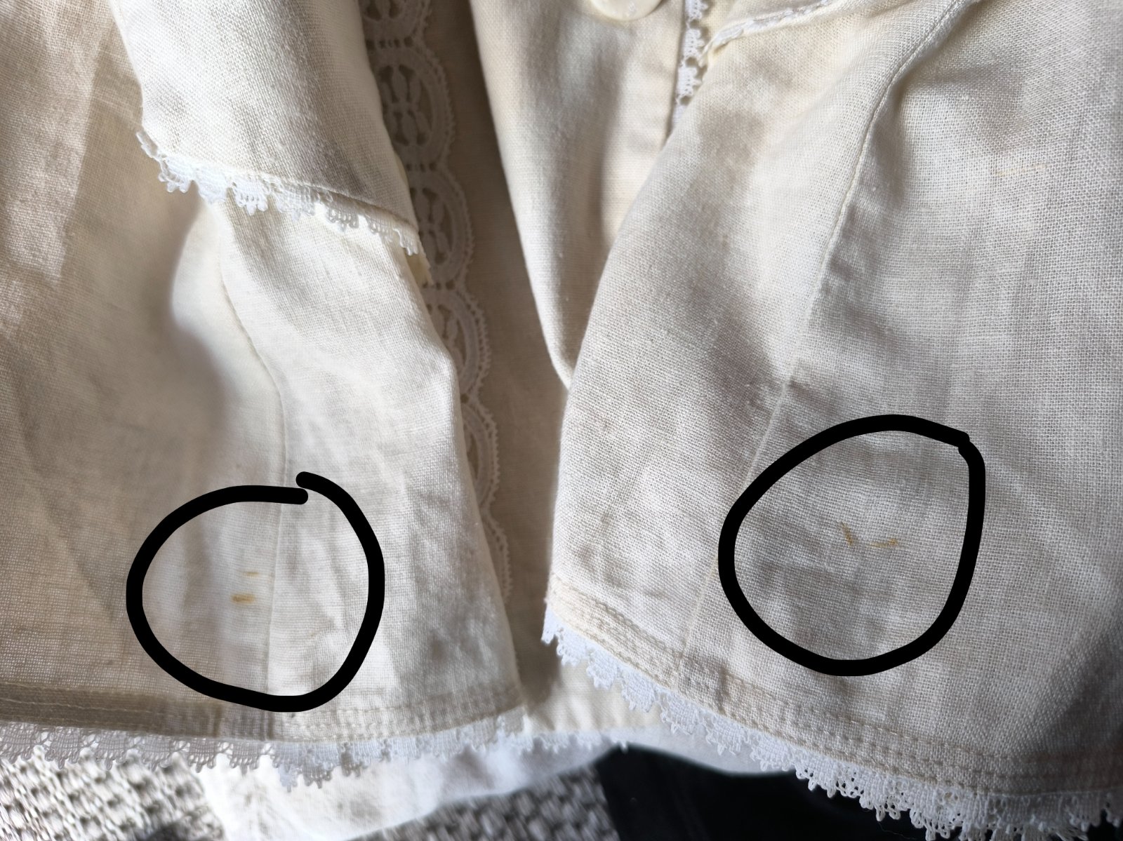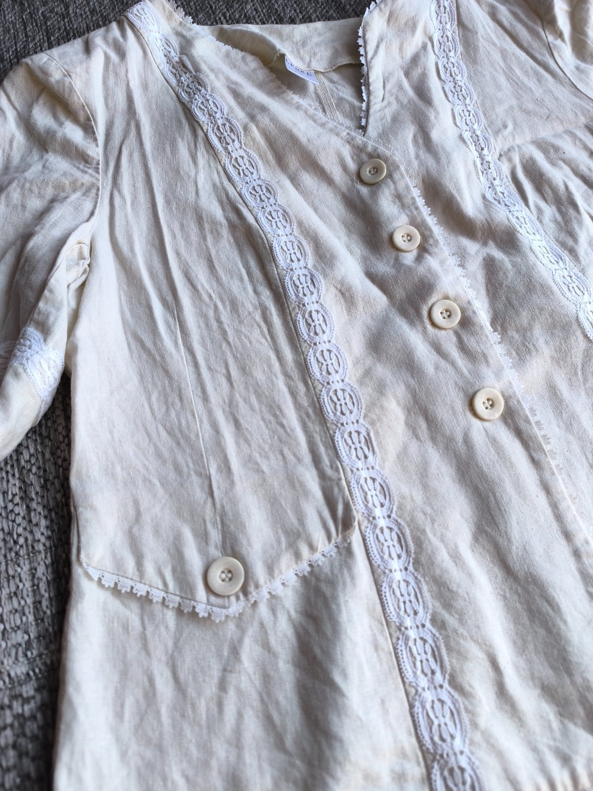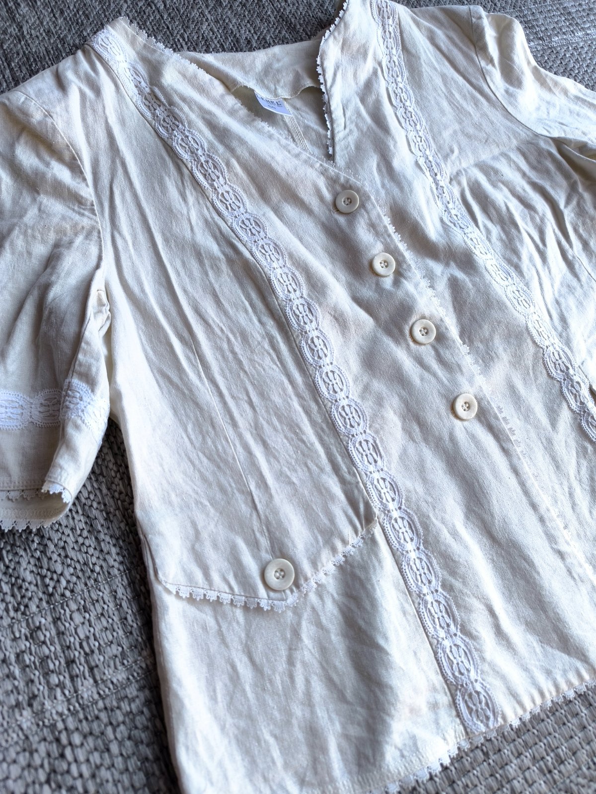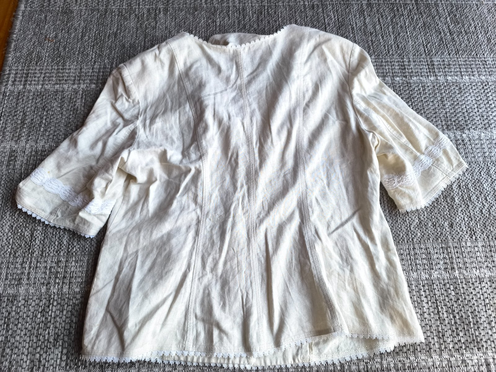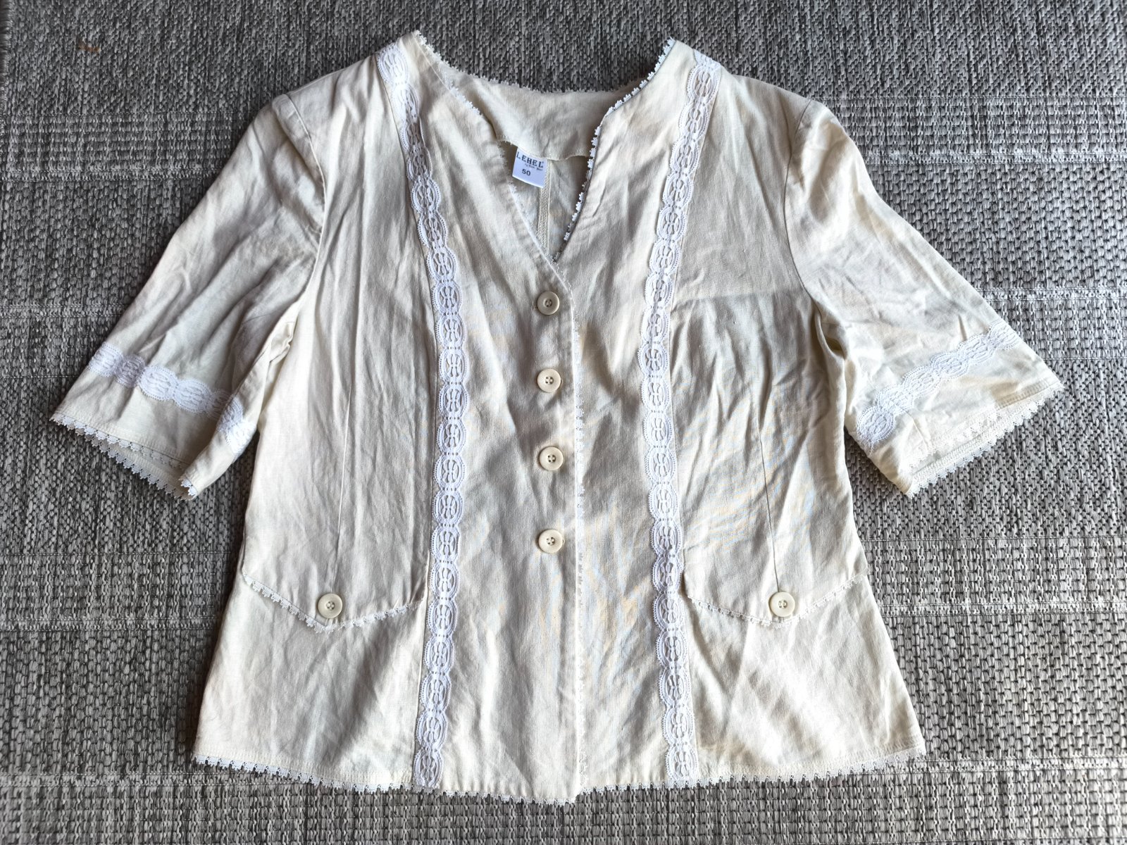 55% ľan, 45% viskóza. Sako, blejzer, blúzka, je prírodnej farby a zdobené bielou krajkou. Folklórny štýl. Nepodšité, krátke rukávy, vhodné na leto. Vrecká sú len dekoratívne. Vo veľmi dobrom stave, len dva mini fliačiky vzadu po bokoch, pozrite fotky. Dĺžka 63cm, šírka cez prsia 55cm, v páse 53cm.