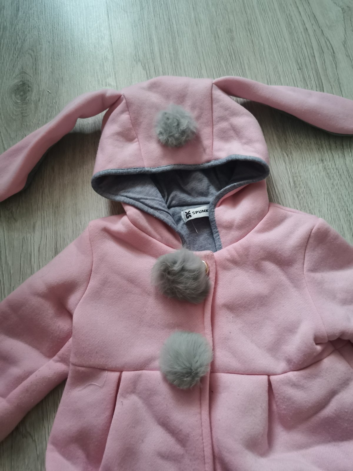 Krásny kabátik a kapucňou, ktorá má ušká. Kabátik v dobrom nosenom stave, na niektorých miestach minižmolky. Veľkosť 18-24 mesiacov.V