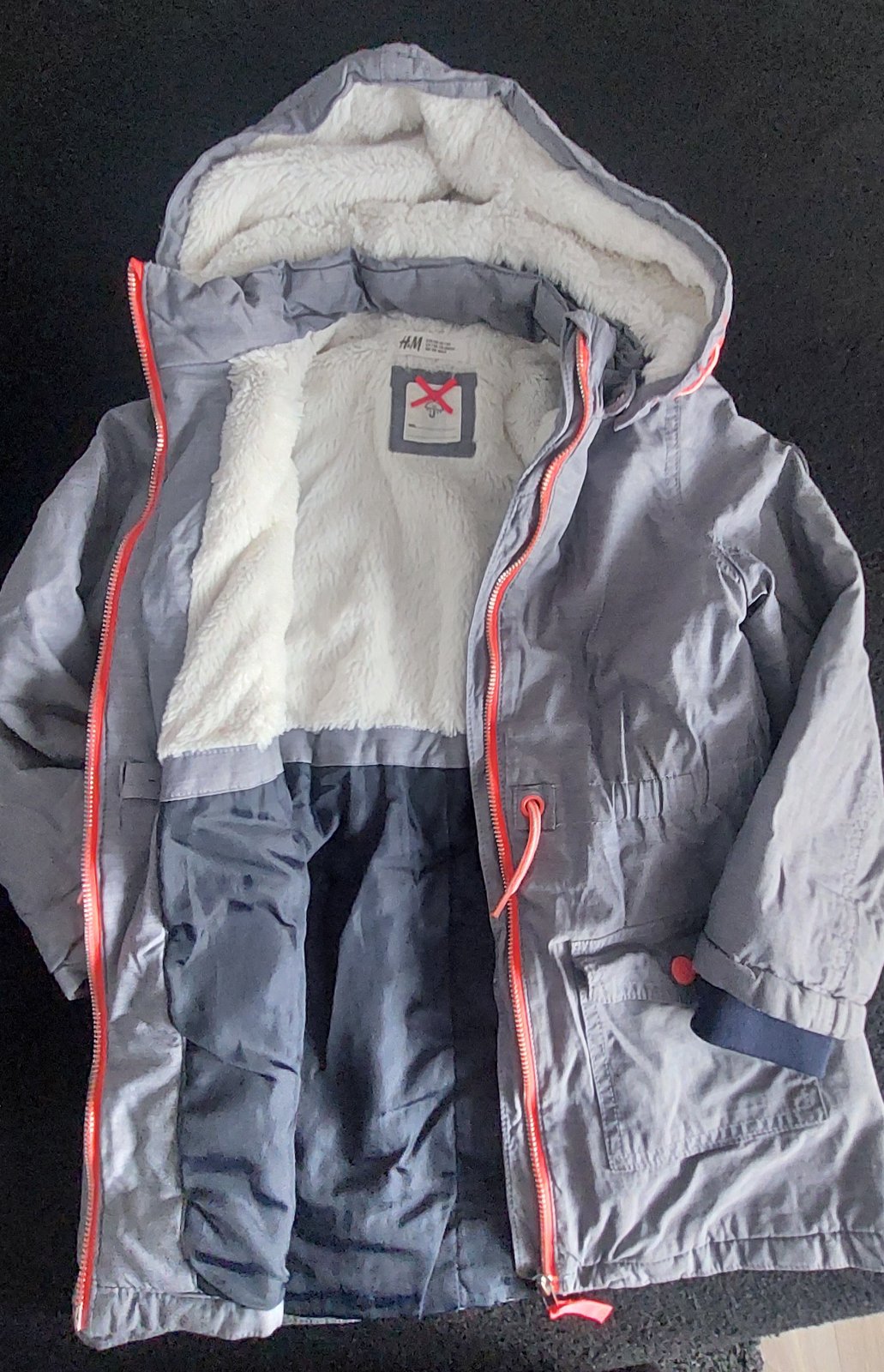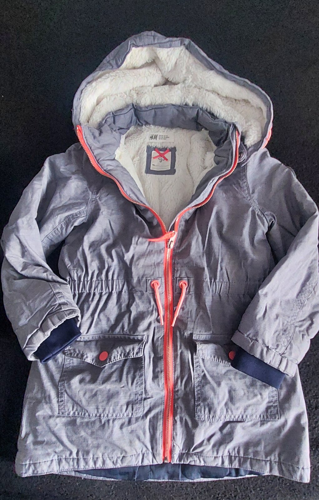 Teplá bundička. Nosená no v top stave, bez poškodení. Kapucňa sa dá odopnúť, bundička sa dá regulovať v páse zvnútra gumičkou. Celková dĺžka 63 cm, šírka pod pazuchami 40 cm, rukáv 45 cm.