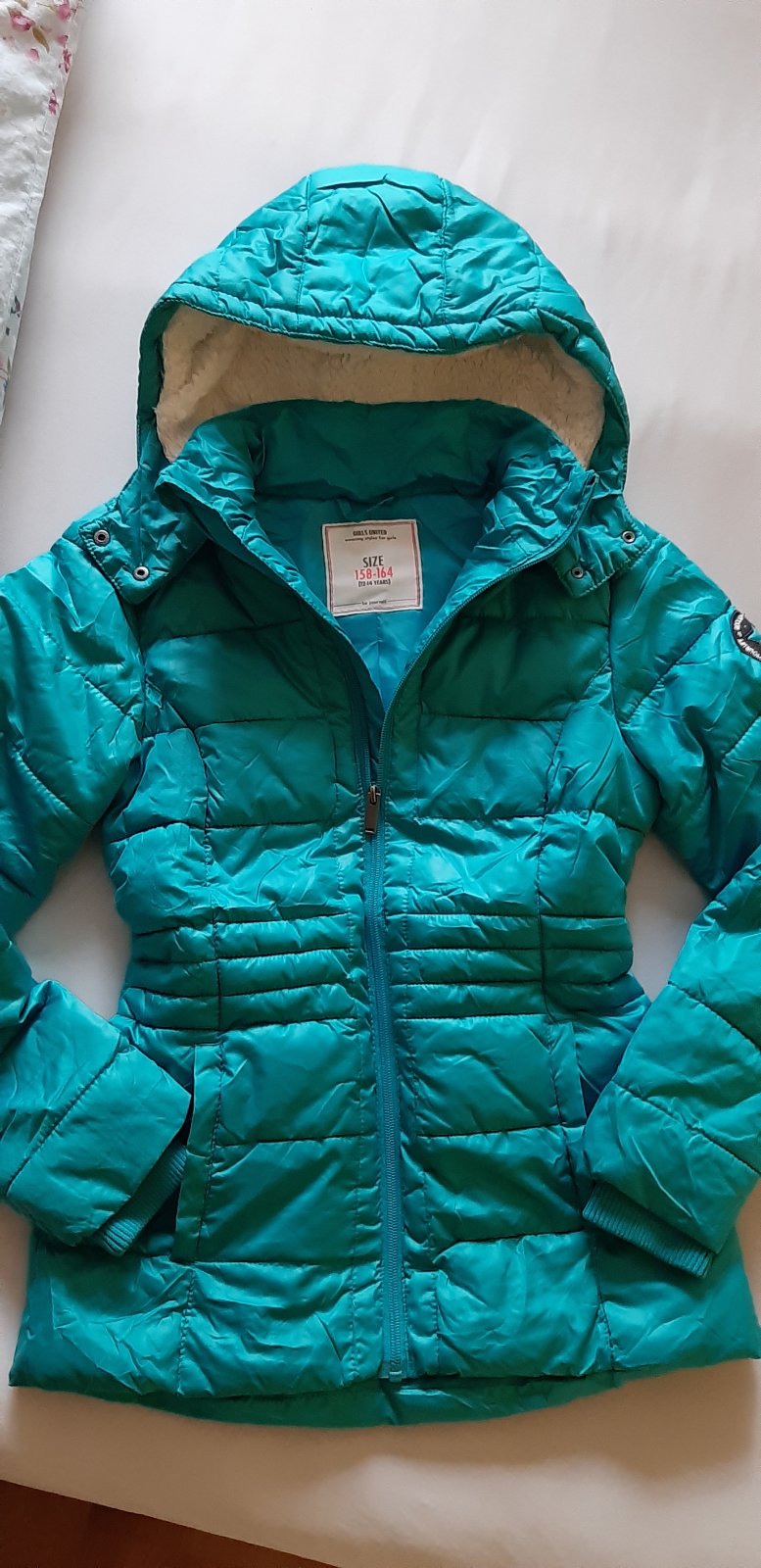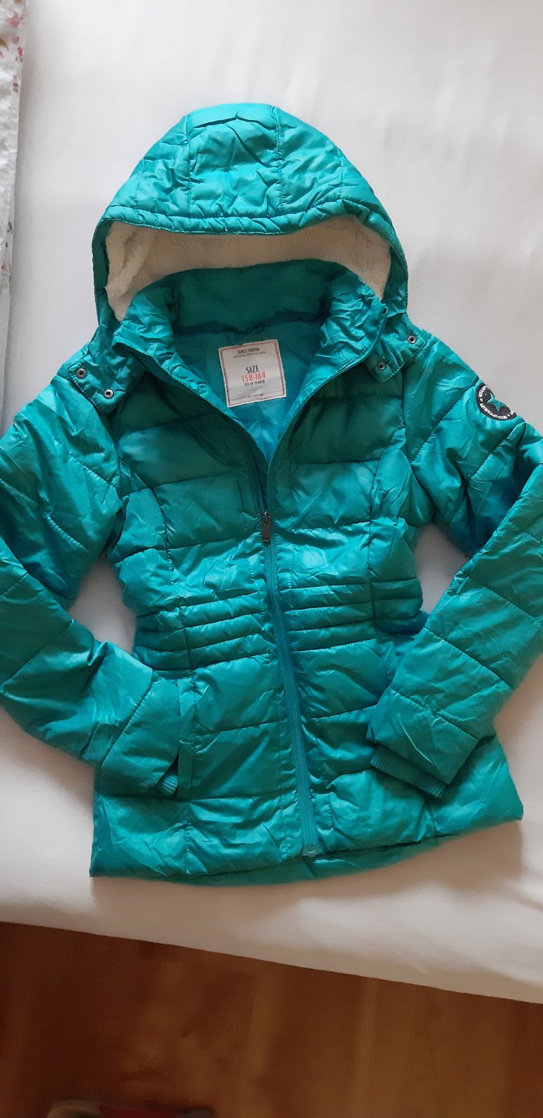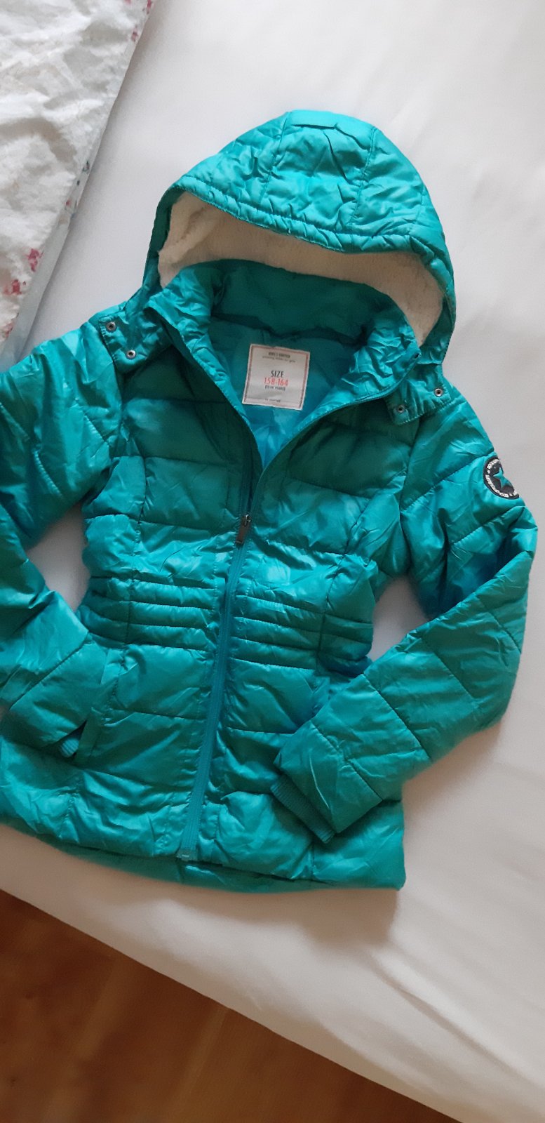 Tyrkysová zimušná bunda, veľkosť uvedená 158/164, sedí aj ako dámska XS/S.