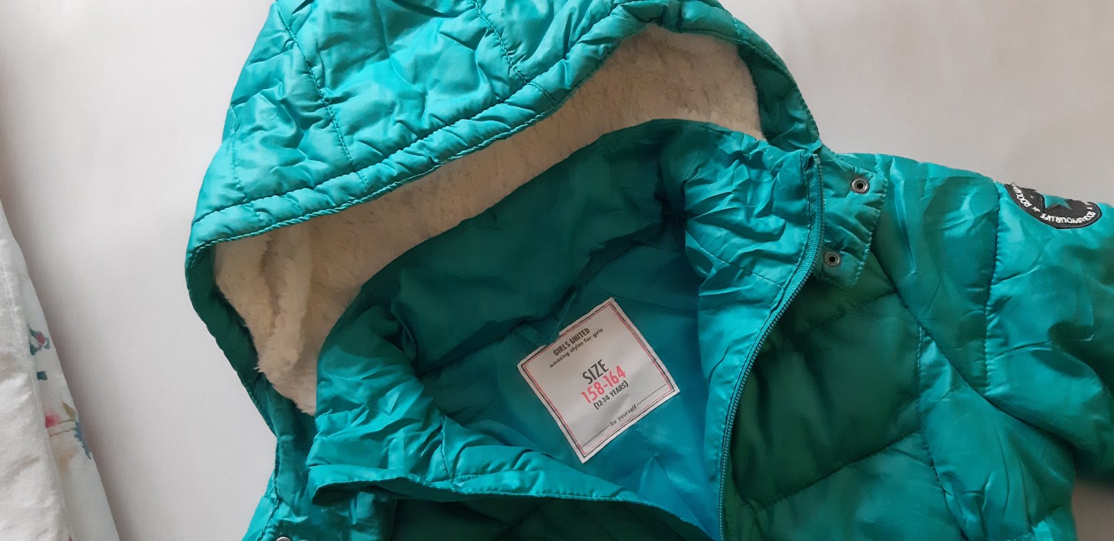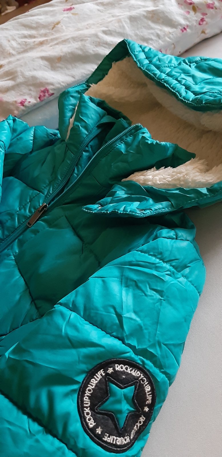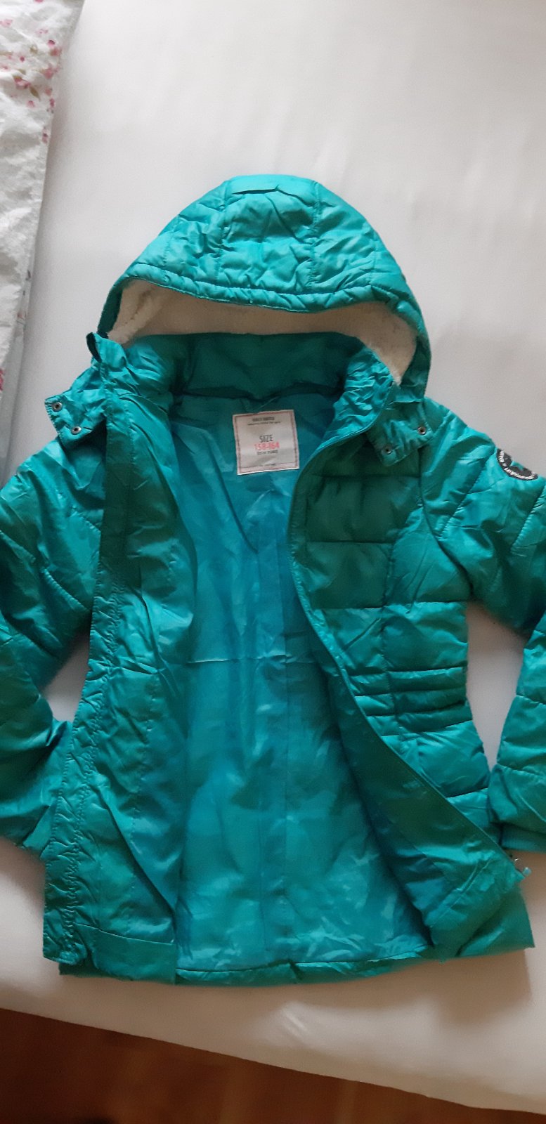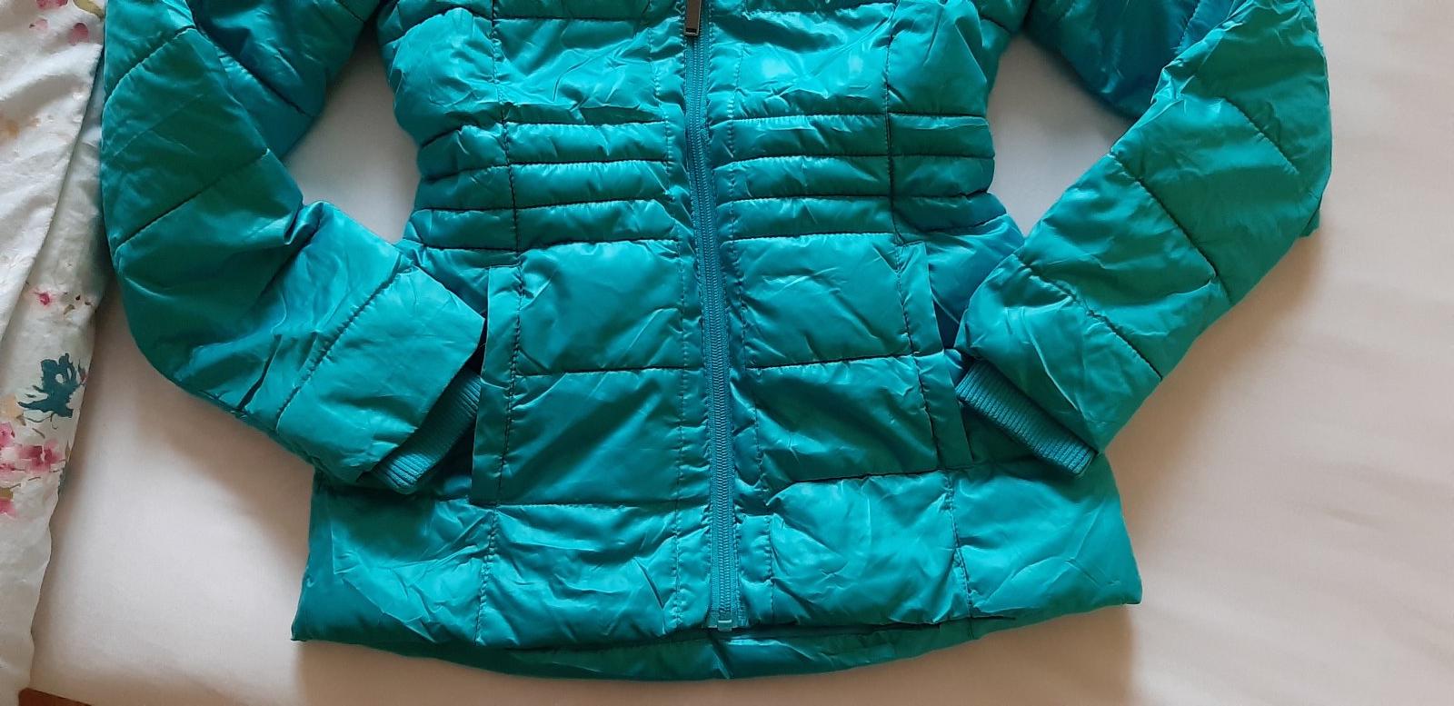 Tyrkysová zimušná bunda, veľkosť uvedená 158/164, sedí aj ako dámska XS/S.