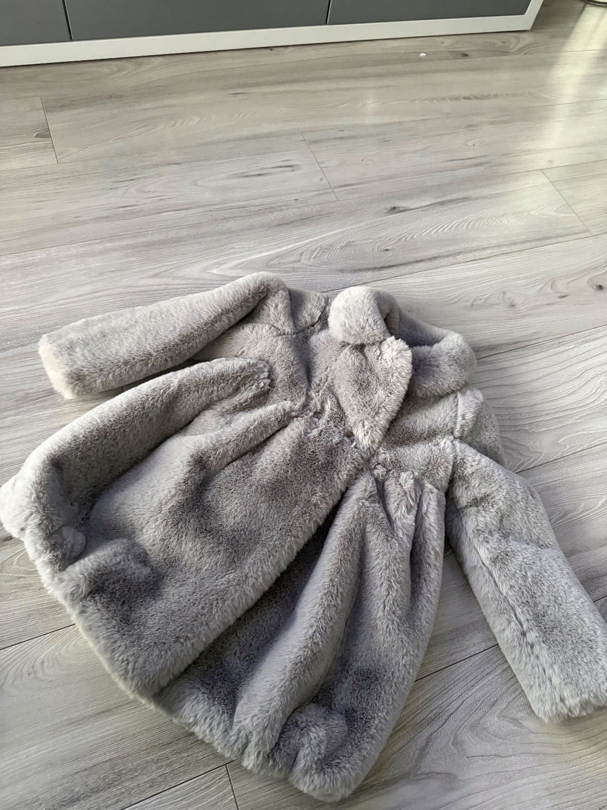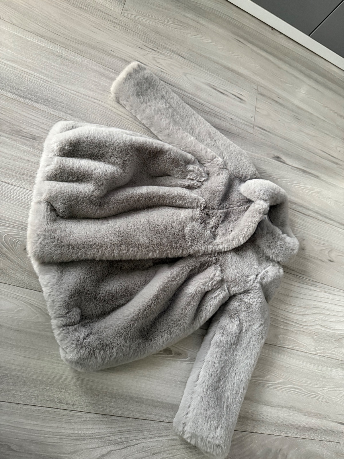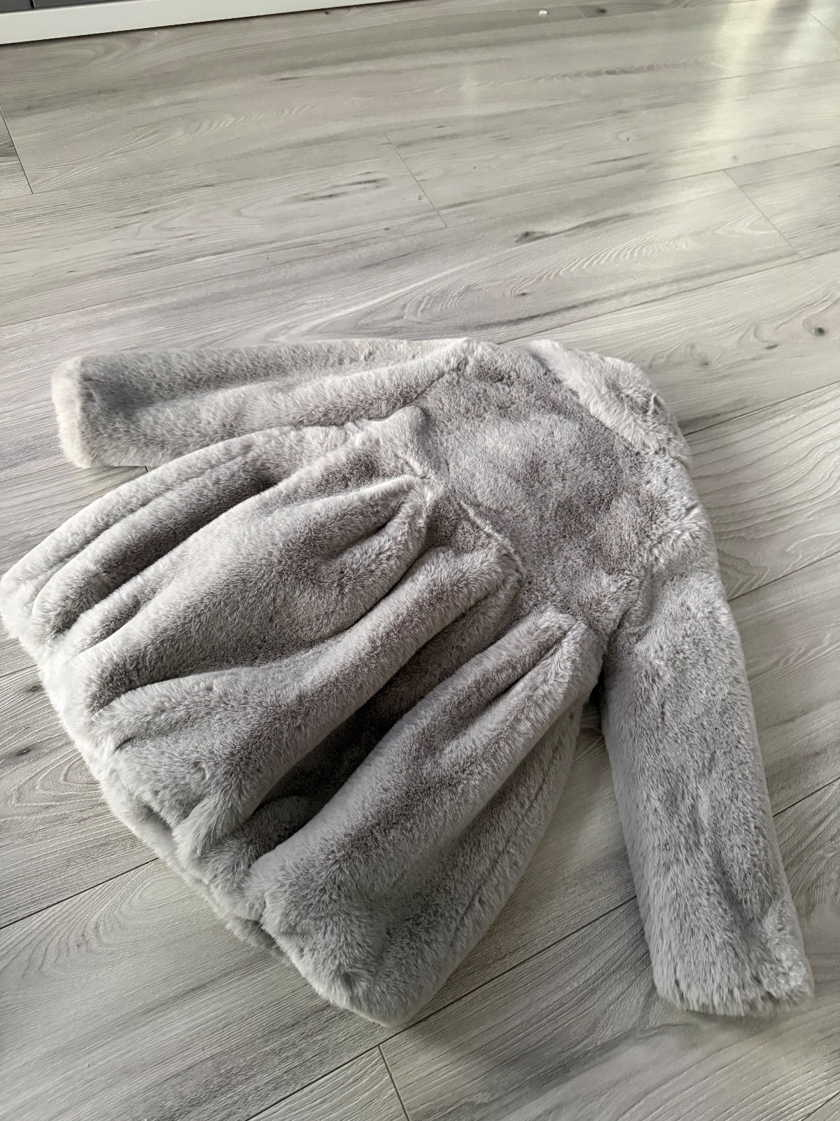 Krasny kozusok vo velmi dobrom stave. Farba je taka sedo-hneda. Rozmery: dlzka rukavu od kapucne: 48cm, rukav od pleca: 41cm, celkova dlzka od pleca: 59cm, sirka pod pazuskami: 41cm