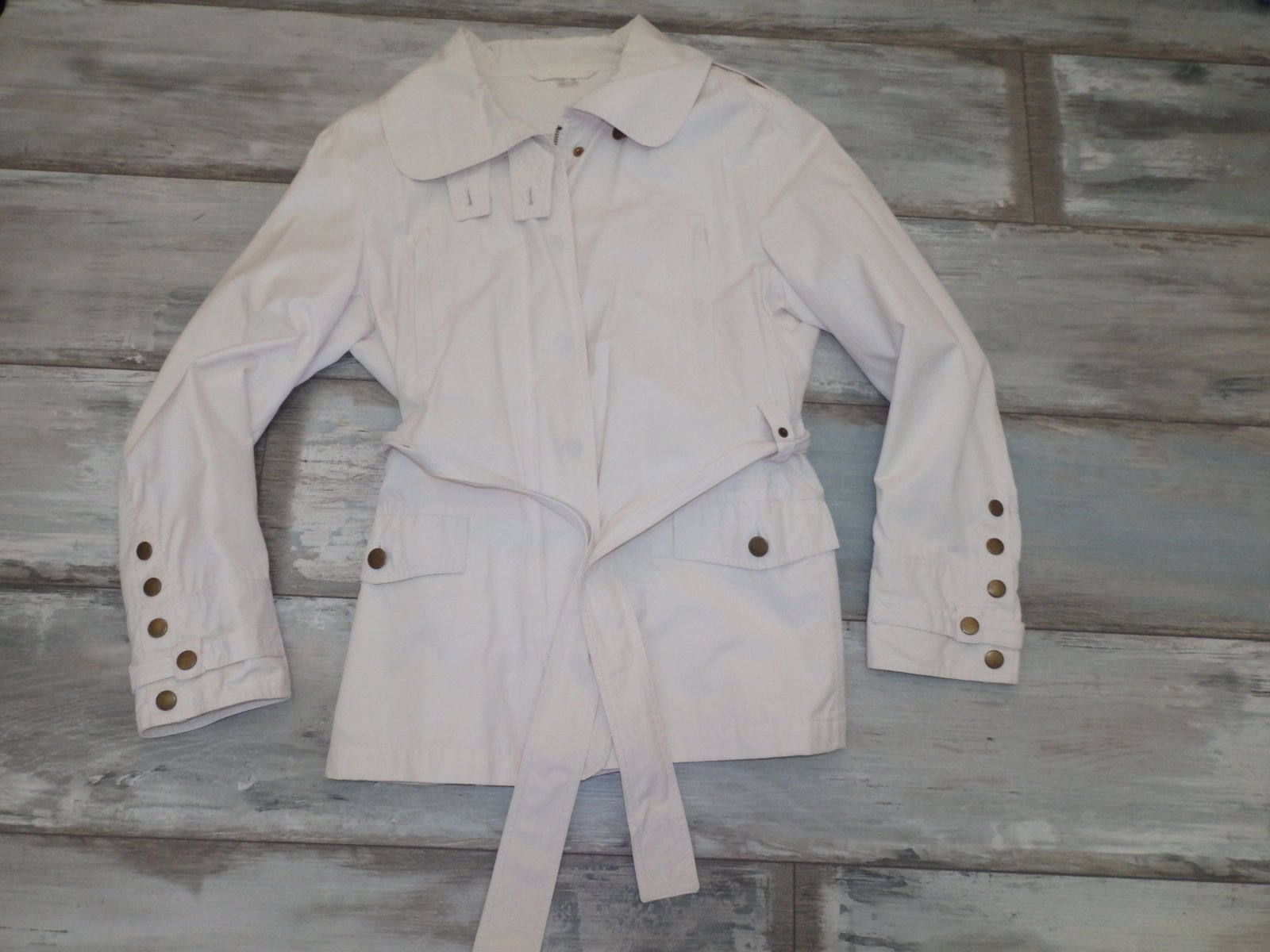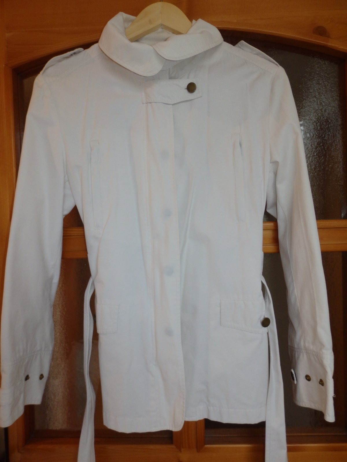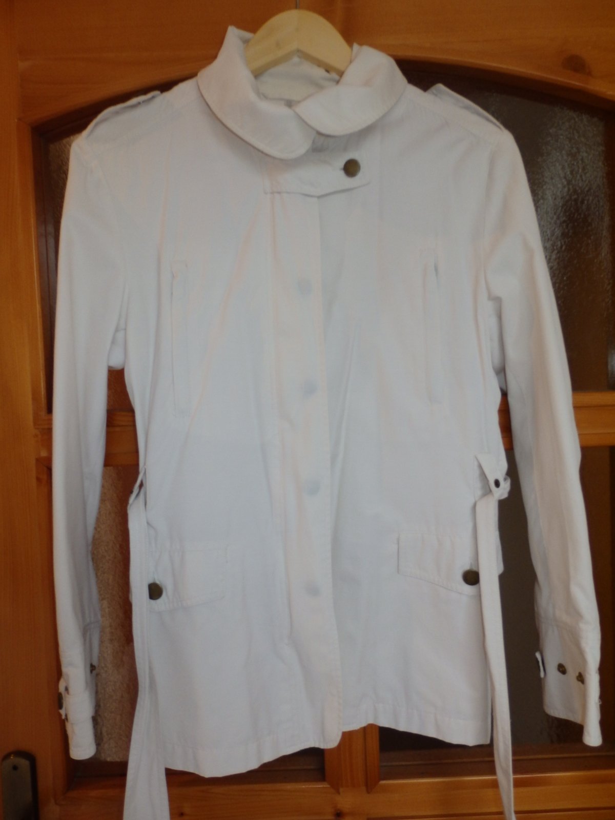 Ponúkam prechodnú alebo letnú bundičku, ja som ju nosila do lietadla na letnú dovolenku, vidieť už pranie, nie je úplne snehobiela, ale ešte dobre poslúži. Veľ. písaná 42, ale je to skôr taká 38/40