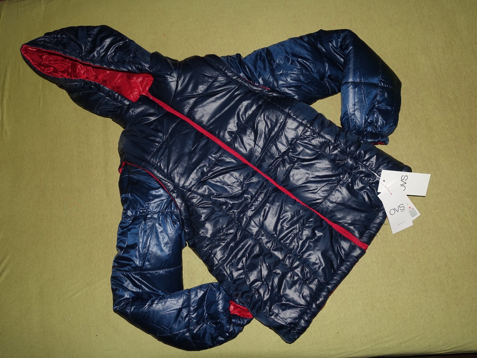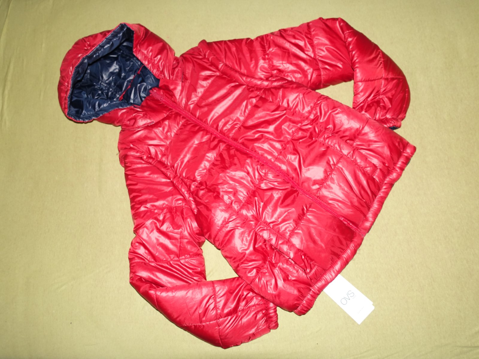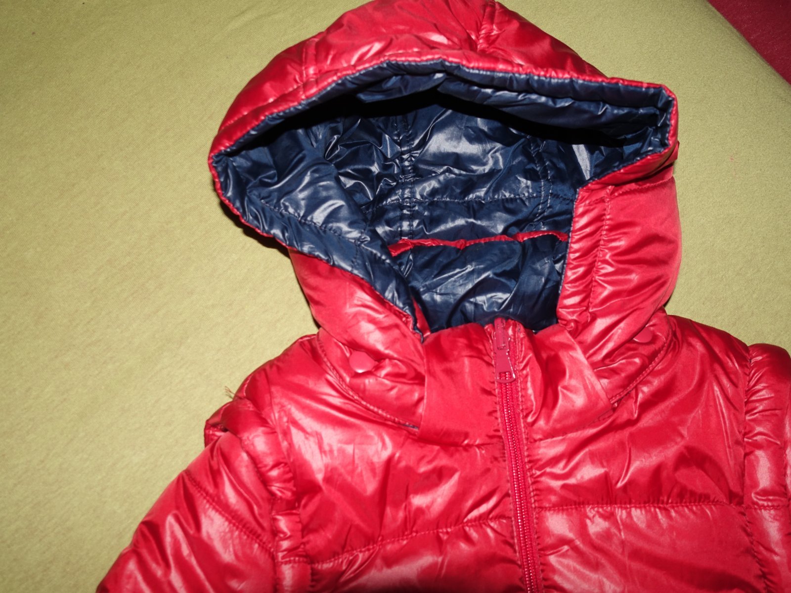 Krasna obojstanna bundicka- nova, s visackami. Rukavy sa daju odopnut a da sa z nej urobit aj vesticka. Kapucna sa da tiez odopnut. Velkost je uvedena ako 164, ale je mensia.