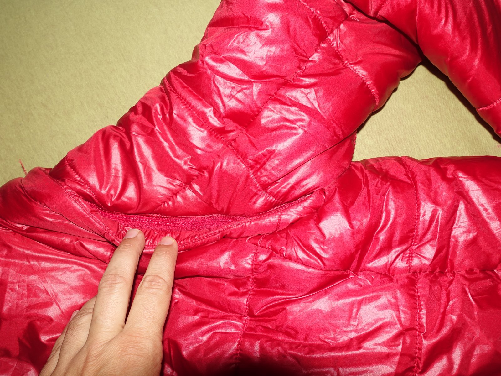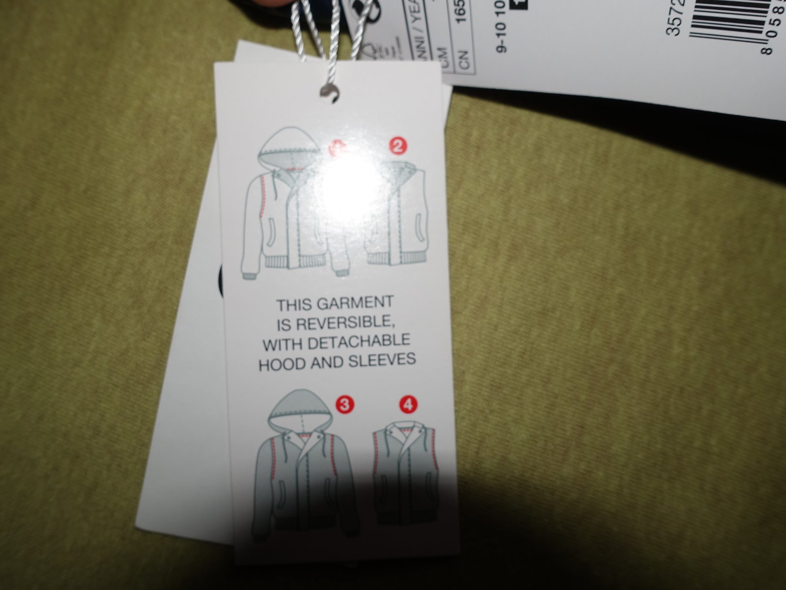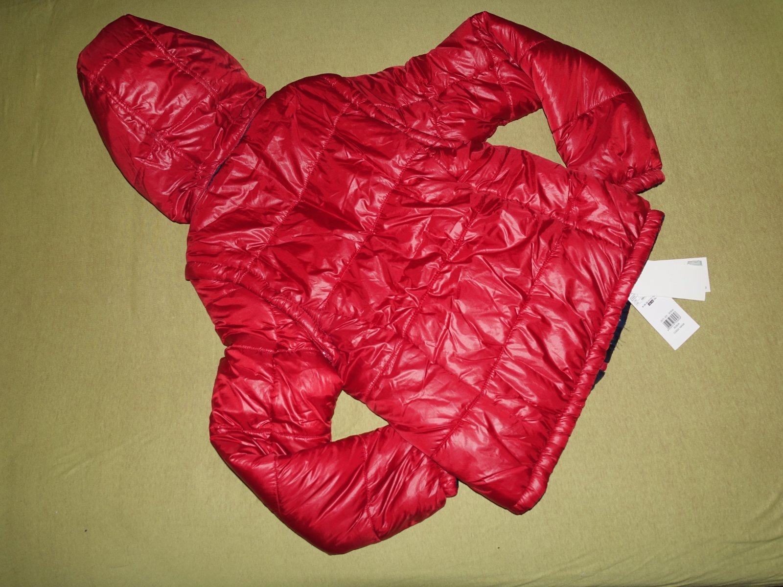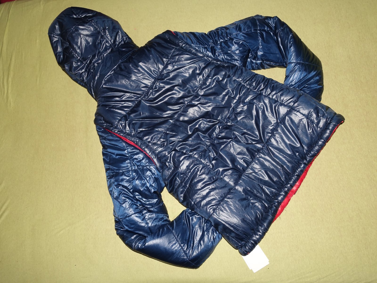 Krasna obojstanna bundicka- nova, s visackami. Rukavy sa daju odopnut a da sa z nej urobit aj vesticka. Kapucna sa da tiez odopnut. Velkost je uvedena ako 164, ale je mensia.