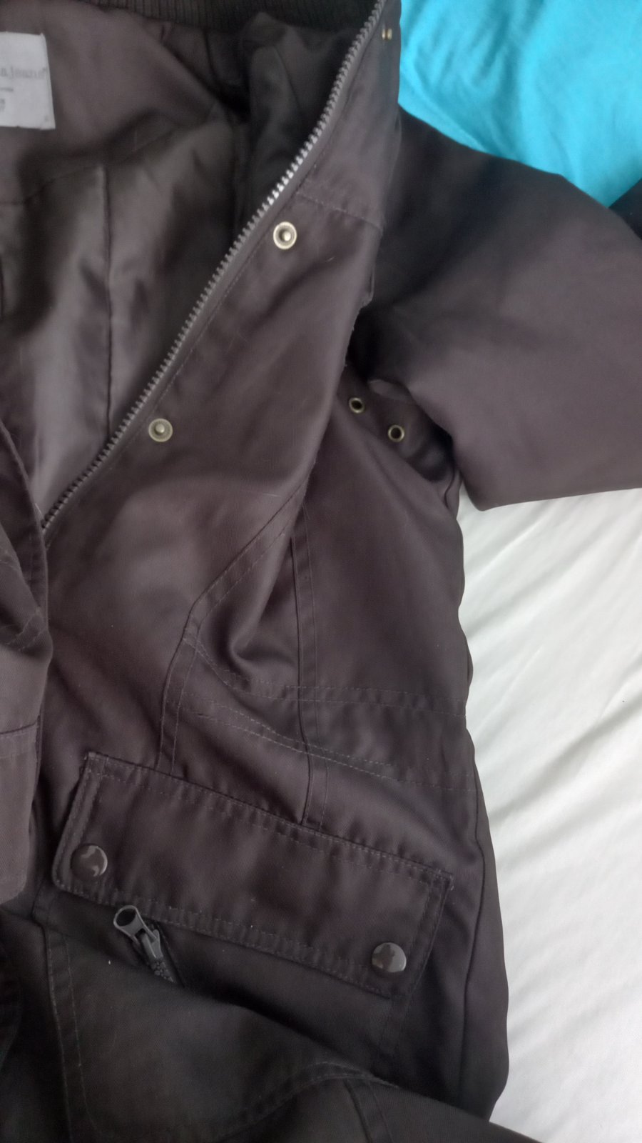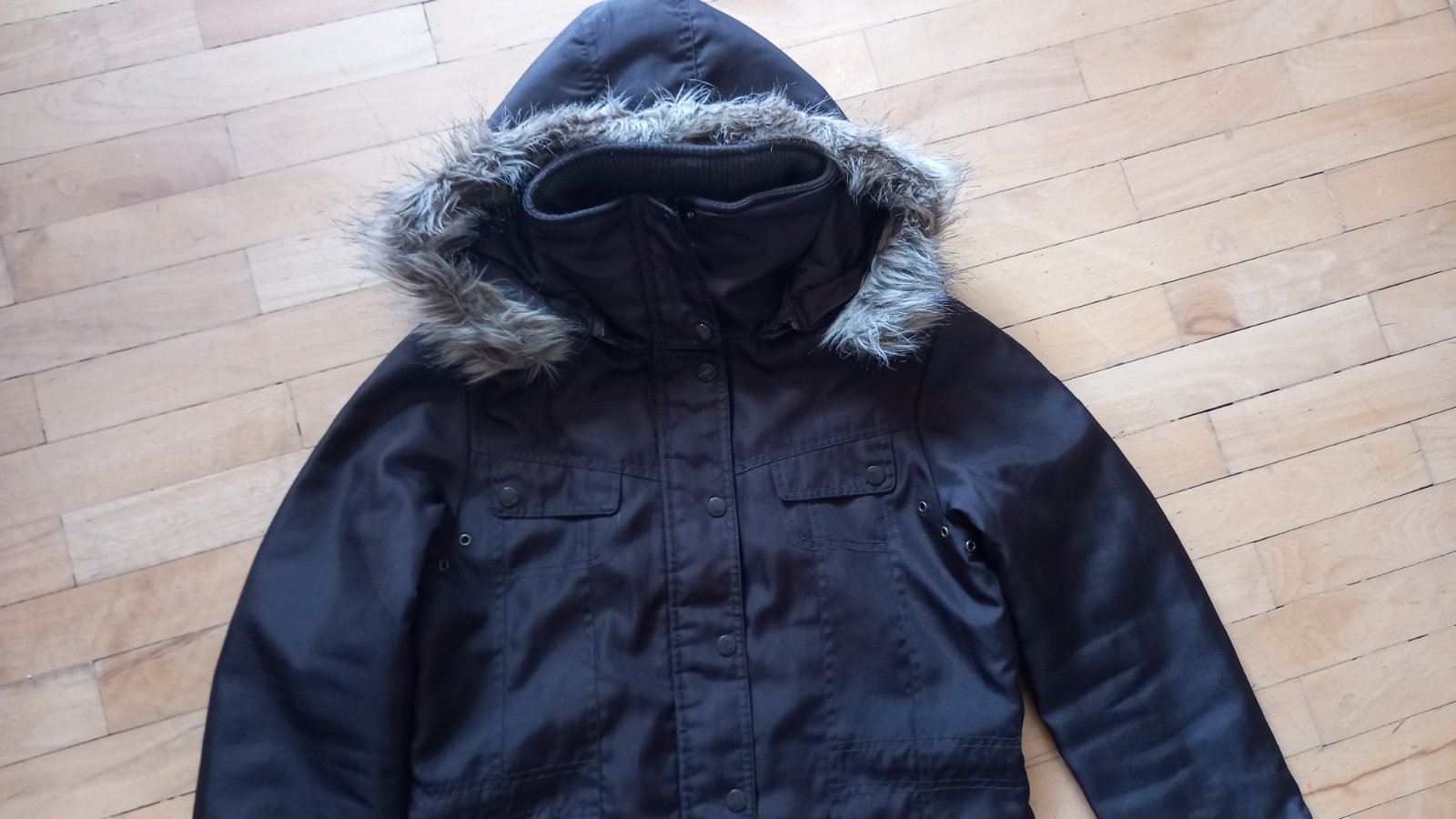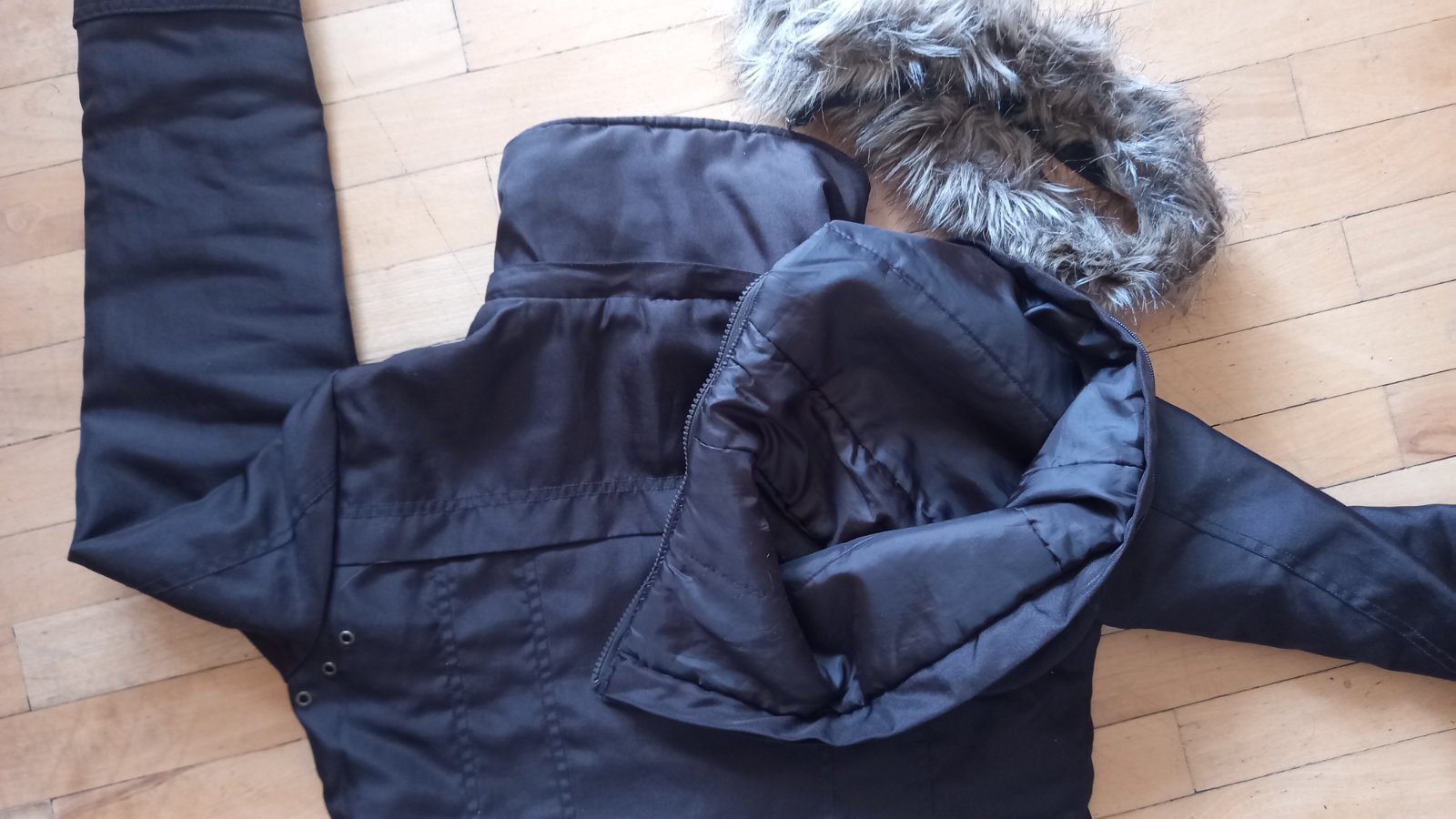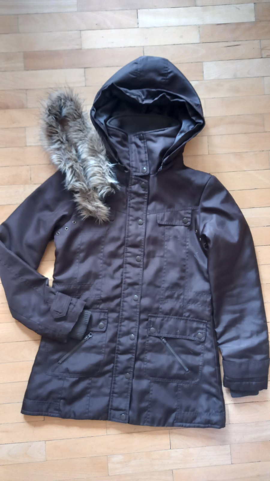 Vyborný stav, min.nosená, sytohneda-foto oblesknute. Najblizsie ku farbe je foto 2,3. Kapucnu mozne odpojit a pouzit s alebo bez kozusinky