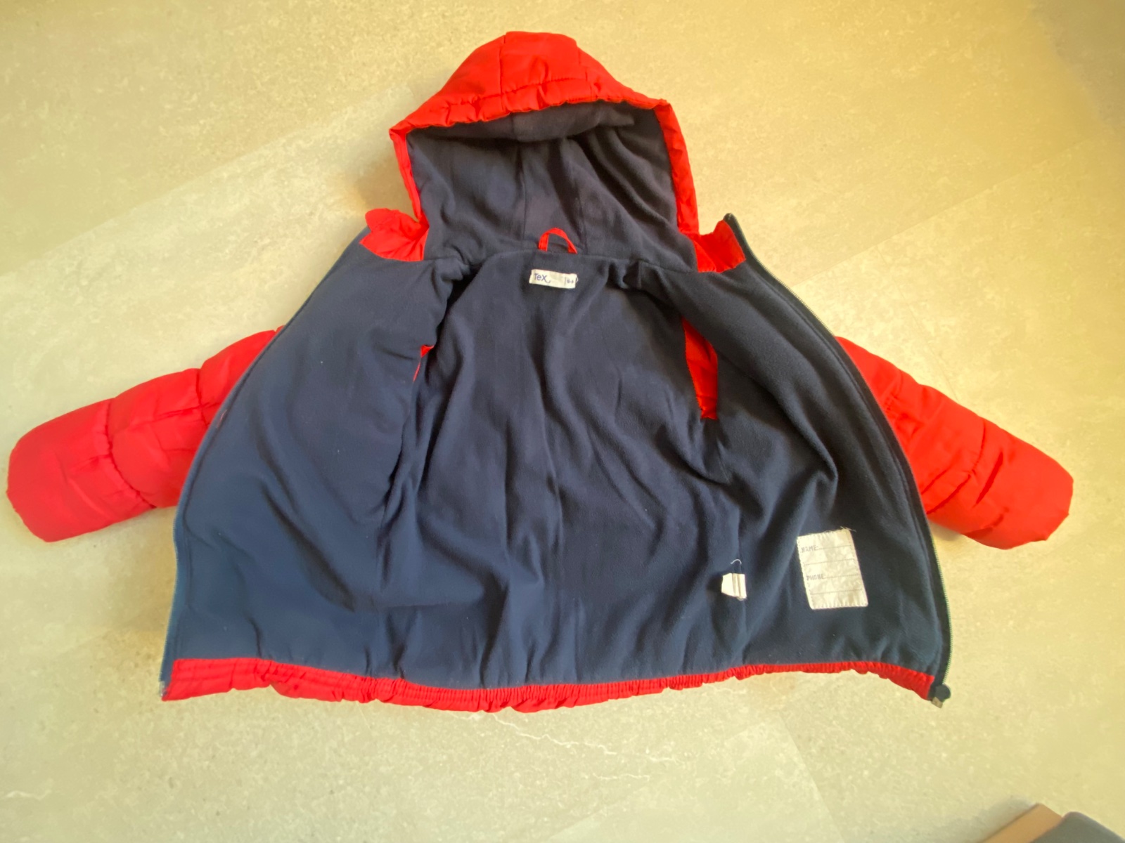 Bunda značky TEX veľkosť uvedená 5-6 rokov. Bola natrhnutá, zošita vpravo dole je vidieť.