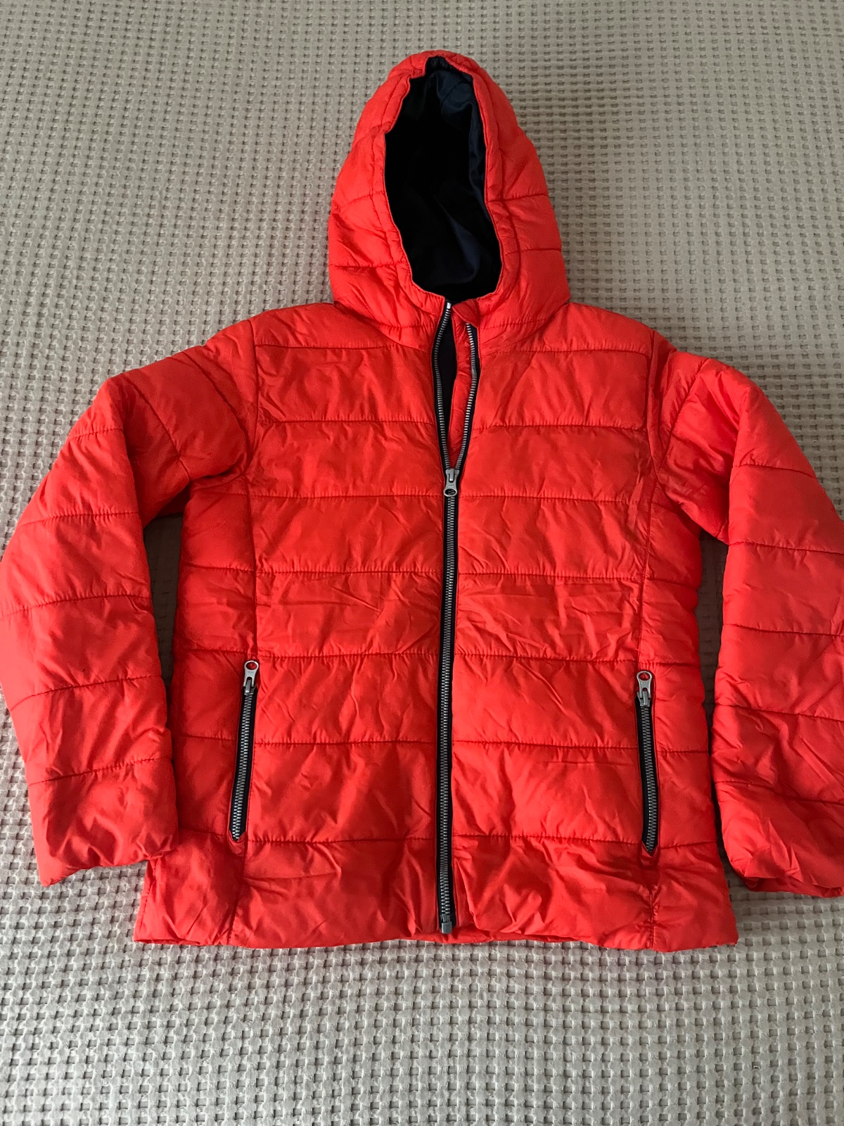 Nosená, ale zachovalá moderná, frajerská chlapčenská zimná bunda - vhodná do školy. Jediná chyba - na rukáve sa odlupuje nápis - vid foto. To ale pri nosení nie je vidieť - vyzerá to, ako by to bol...