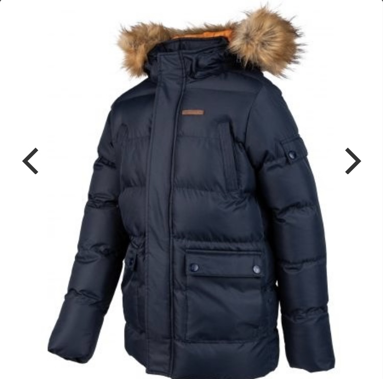 Zimná teplá bunda zn. Head, veľkosť 140-146, predĺžený strih,odnímateľná kapucňa, odopínací lem kapucne z umelej kožušiny, farba tmavomodrá s oranžovou pošívkou,