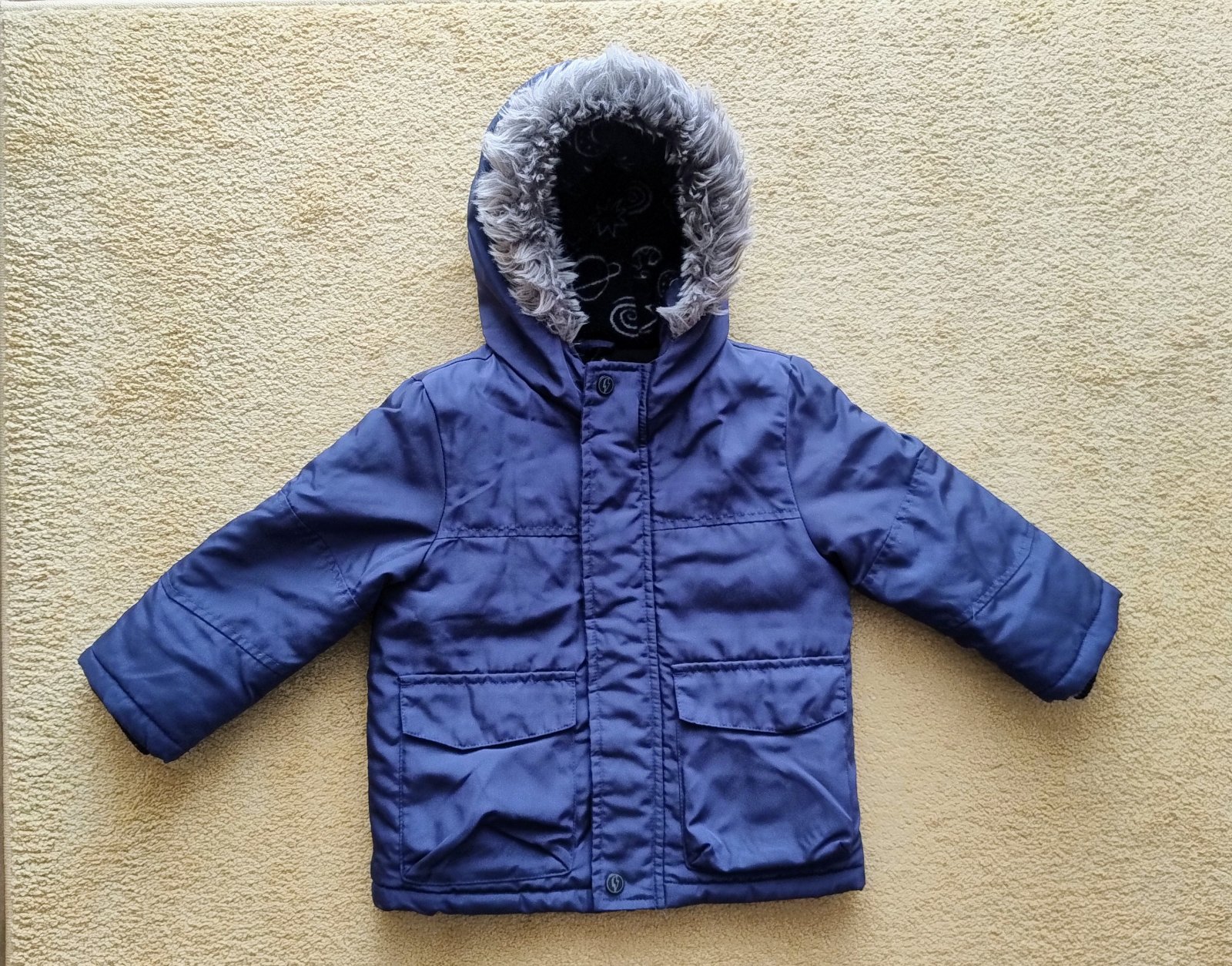 Krásna chlapčenská bunda s kapucňou na ktorej je kožušinka. Zapína sa na zips+ cvoky. Vpredu sú vačky. Bunda je vo vnútri flísom zateplená. Rukávy majú aj manžetu. Váha: 422 gr. D- 39 cm ŠvPP- 34x2...