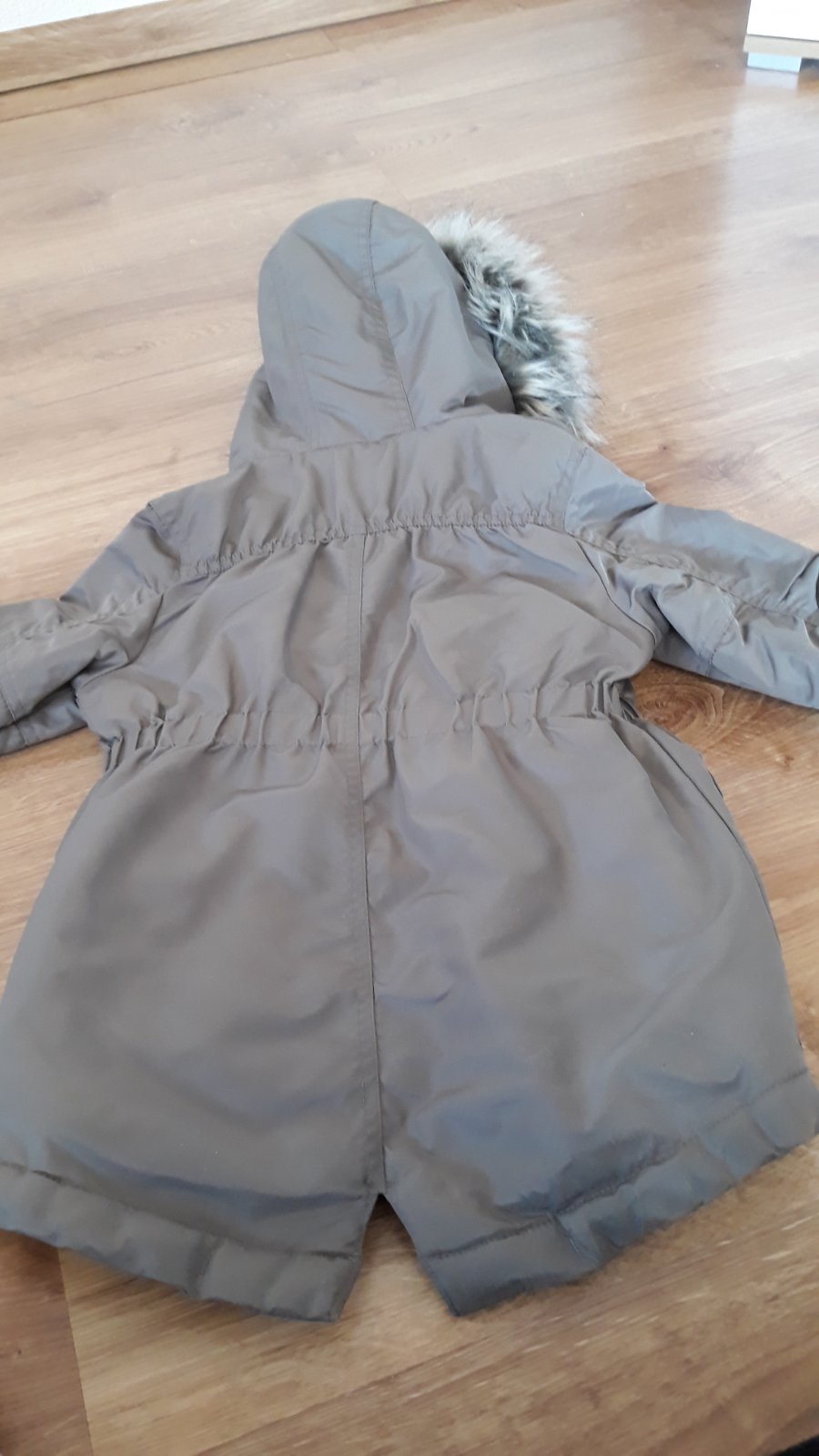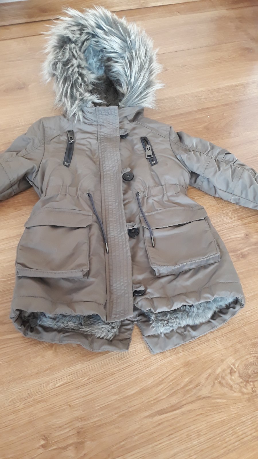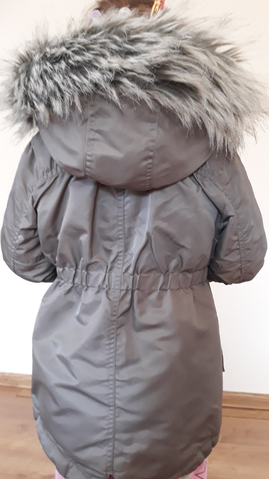 Krásna vetrovčička zn.Next. je dlhšieho strihu pod zadok - typ parka. Riadne zateplená kožušinkou. Kozušinka na kapucničke je tiež z kvalitneho materialu - nezožmolka sa ani prianím. Zapínanie na zips + gombíky. V páse sa dá stiahnuť. Velmi pekne ukaže na dieťatku. Malo nosená.