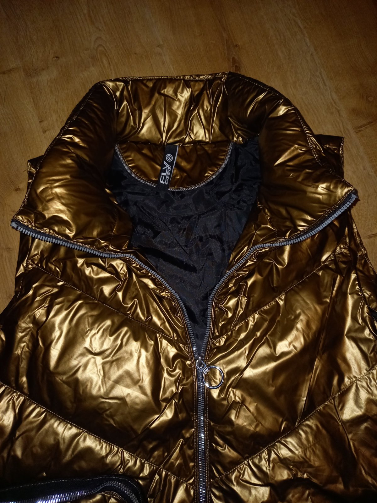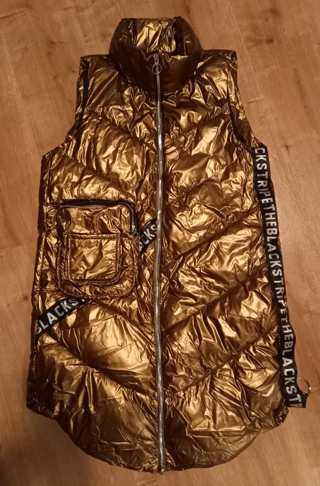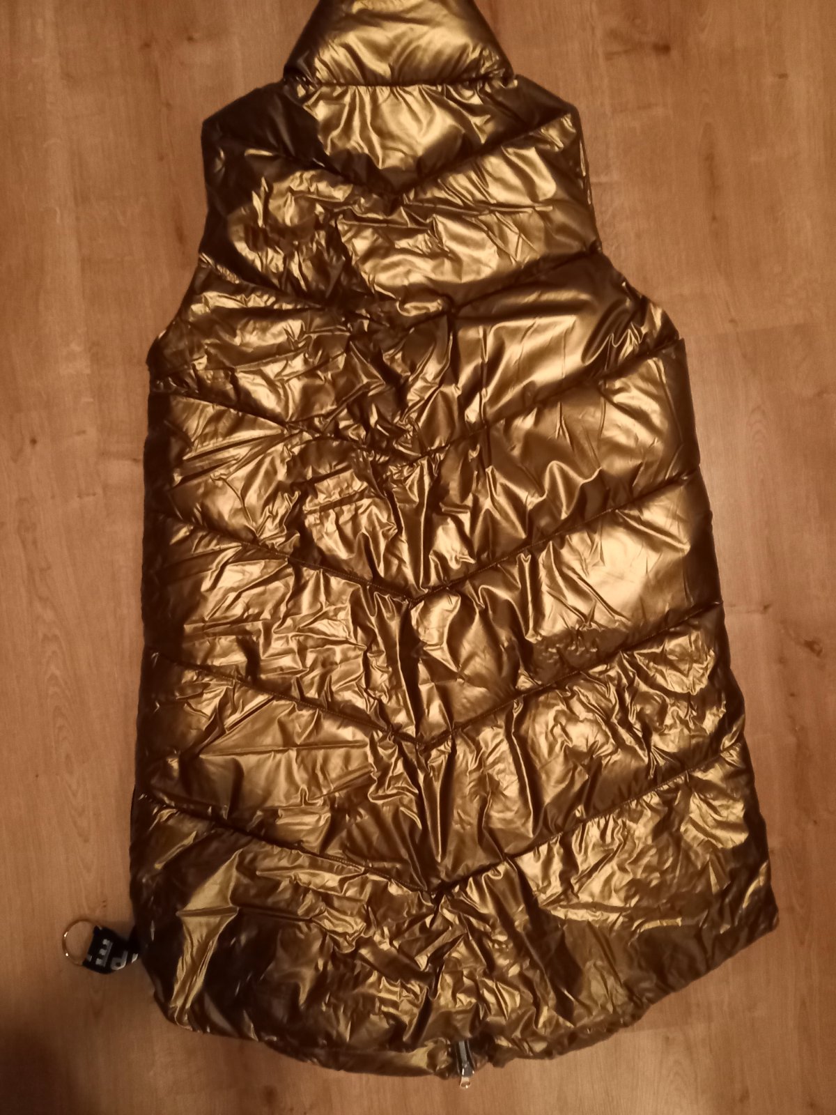 Krásna hnedo-zlata medená nadýchaná tepká dlhá vesta, obojstranný zips, v bočných švíkoch tiež skryté vrecká. Moderná cool. Dĺžka 105cm. Mala som ju iba raz oblečenú, mám viac túto posúvam ďalej. je ako nova, bez visacky. (je troška pokrčená, mala som ju zloženú v skrini, vyrovná sa) pc bolo 70eur