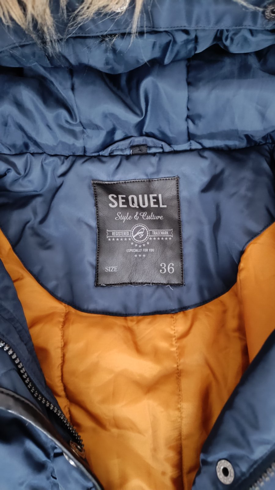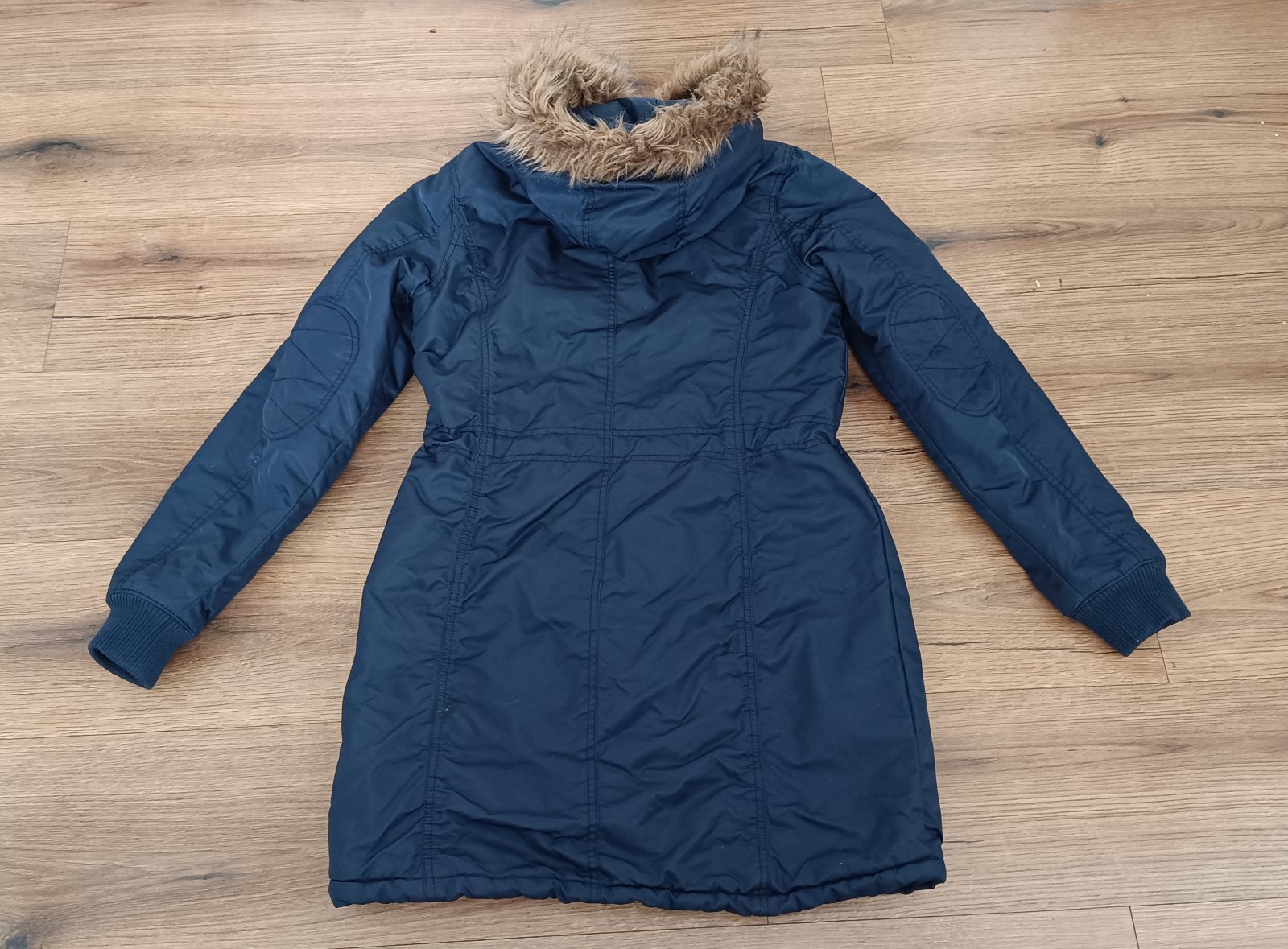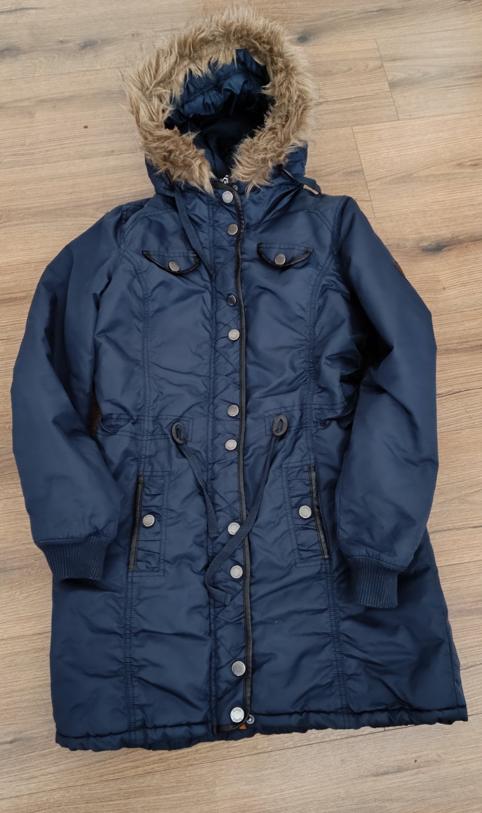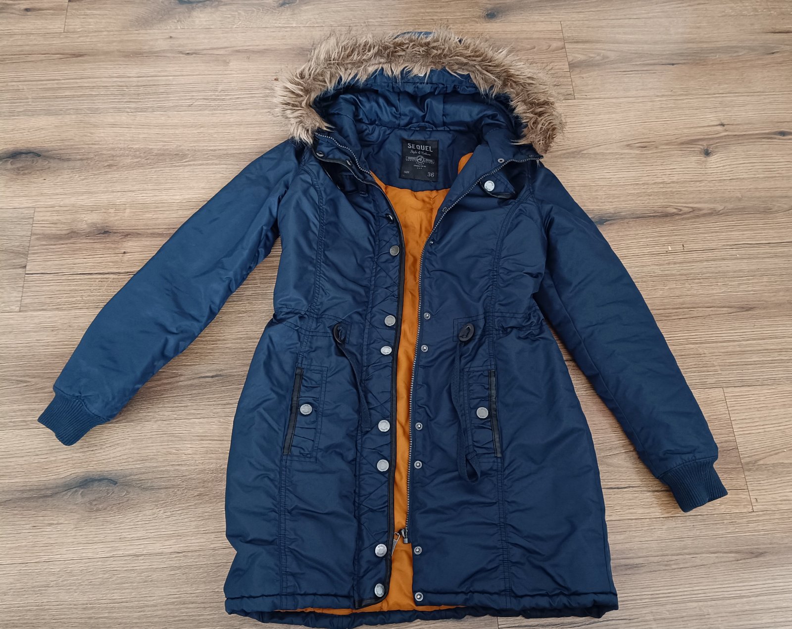Zimná bunda veľ.36. Nepremokavý materiál, pekná tmavomodrá farba bundy.Nosená , nepoškodená . Celková dĺžka je 84cm, rukáv 65cm.