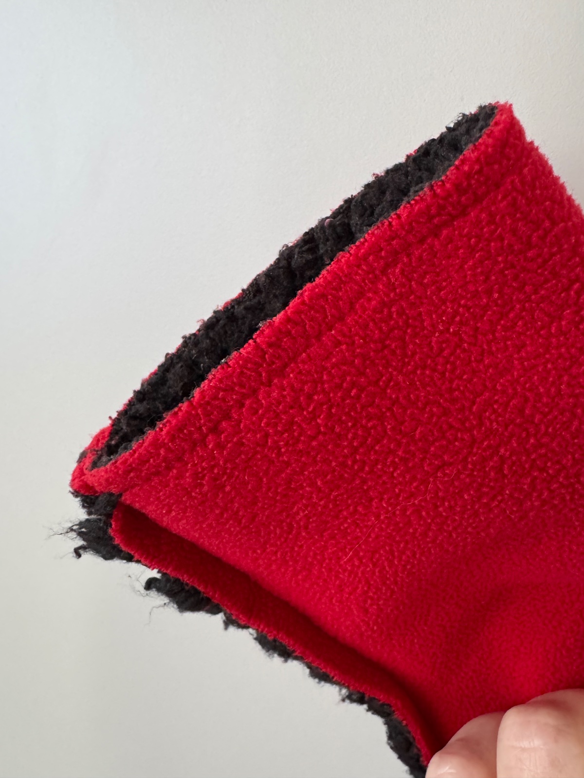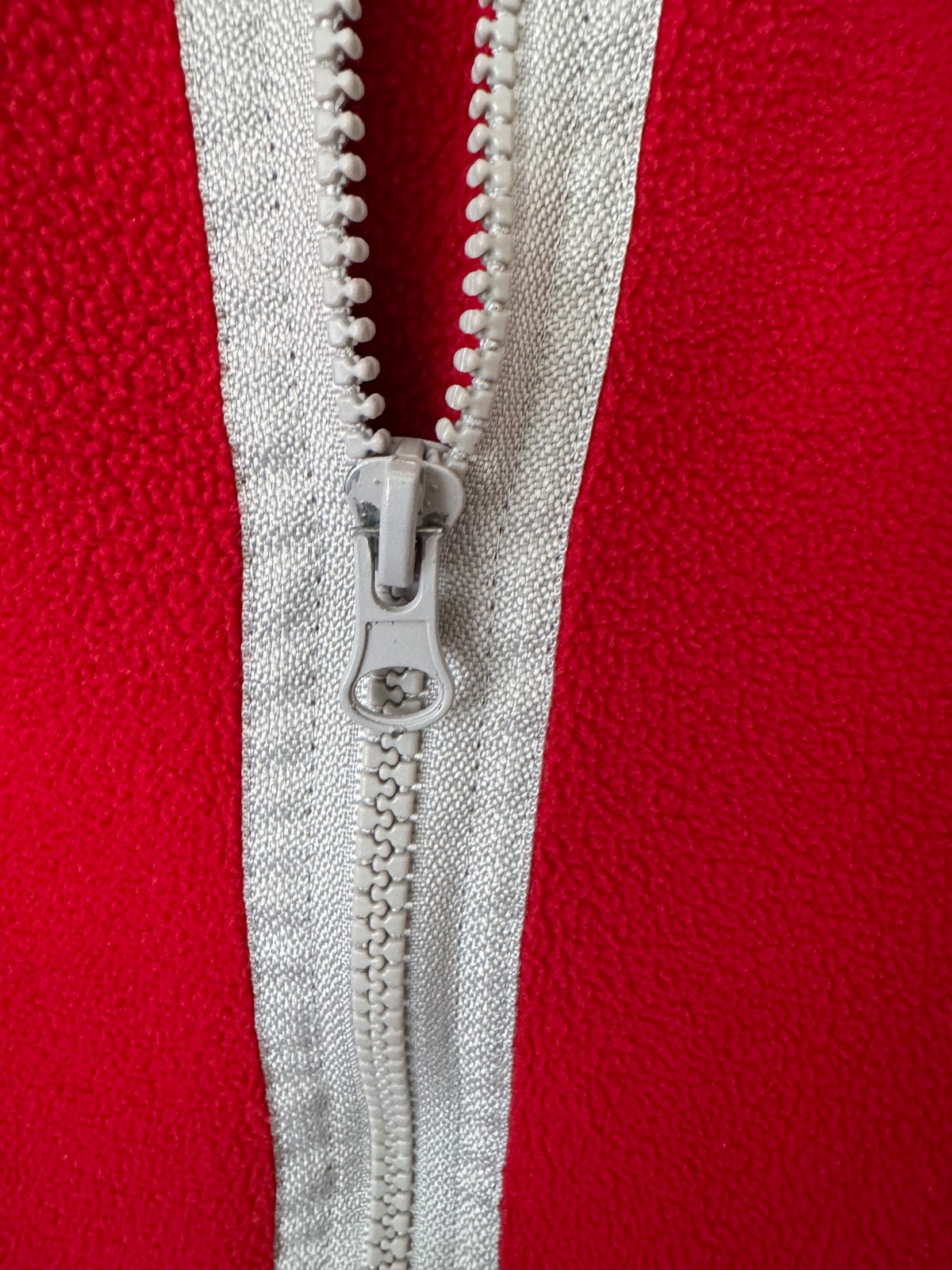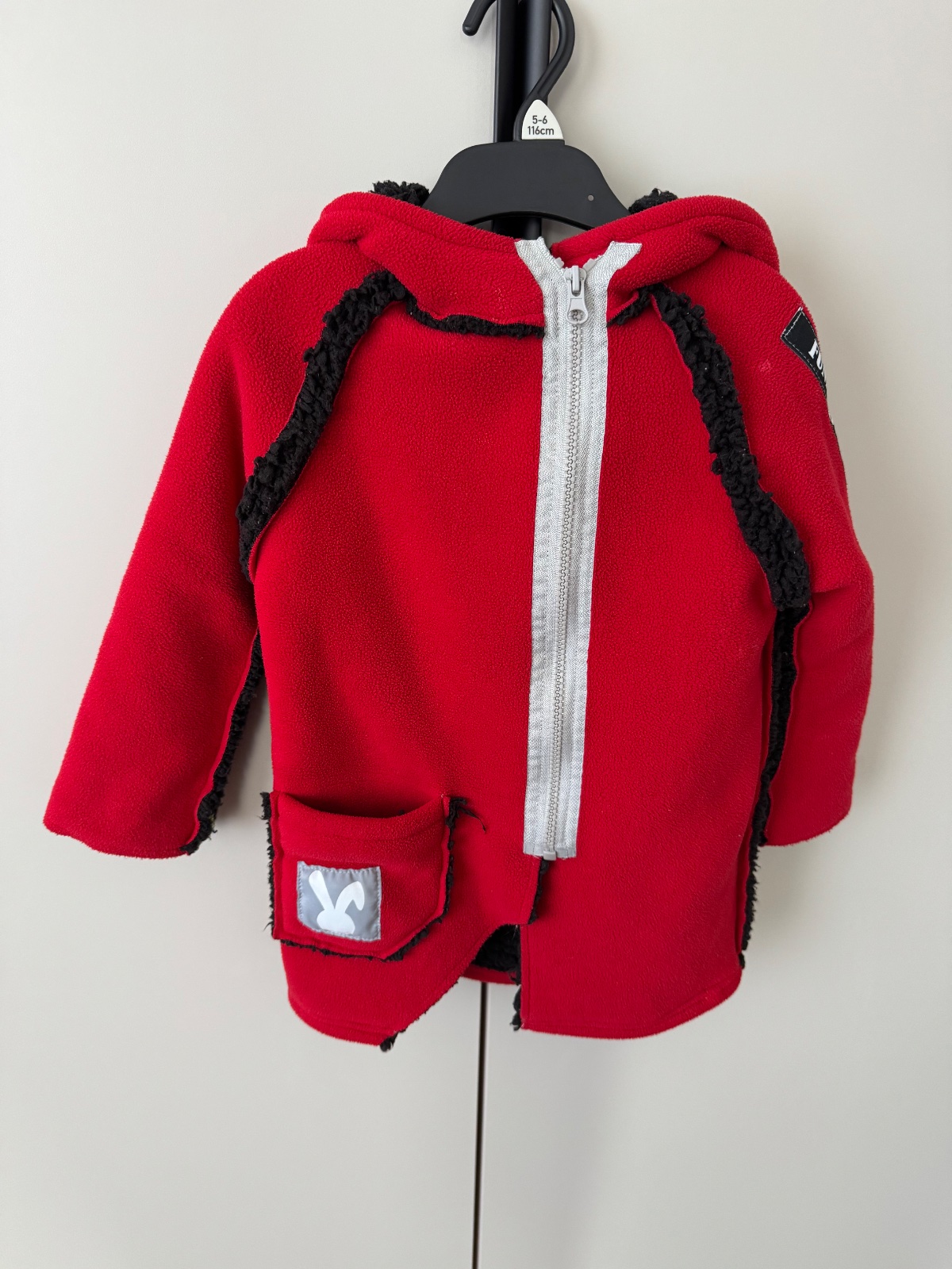 Cervena vetrovka velkosti L, kapucna, 2x vrecko. Rozmery: Pod pazuchami 63 cm, cez plecia 56 cm, dlzka 85 cm.