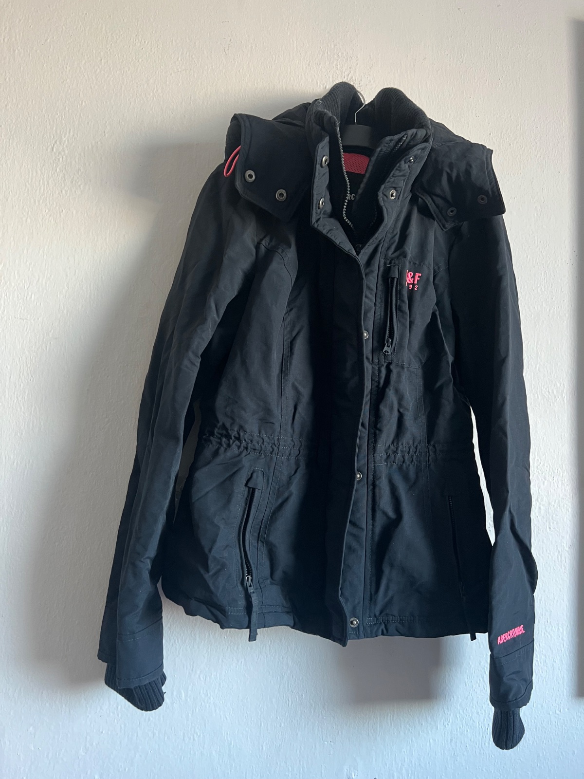 Bunda Abercrombie & Fitch tmavomodra bunda pc 129es kapucou jesena jarna Obcas nosena , tmavomodry , podarilo sa mi odlomit uchyt na zipse, inak je zips funkcny … staci oprat …ale preto nizsia cena