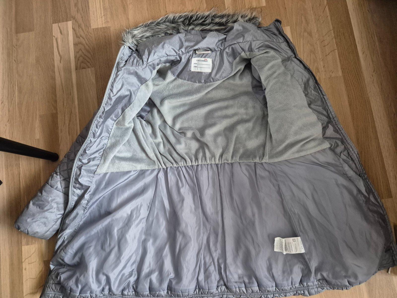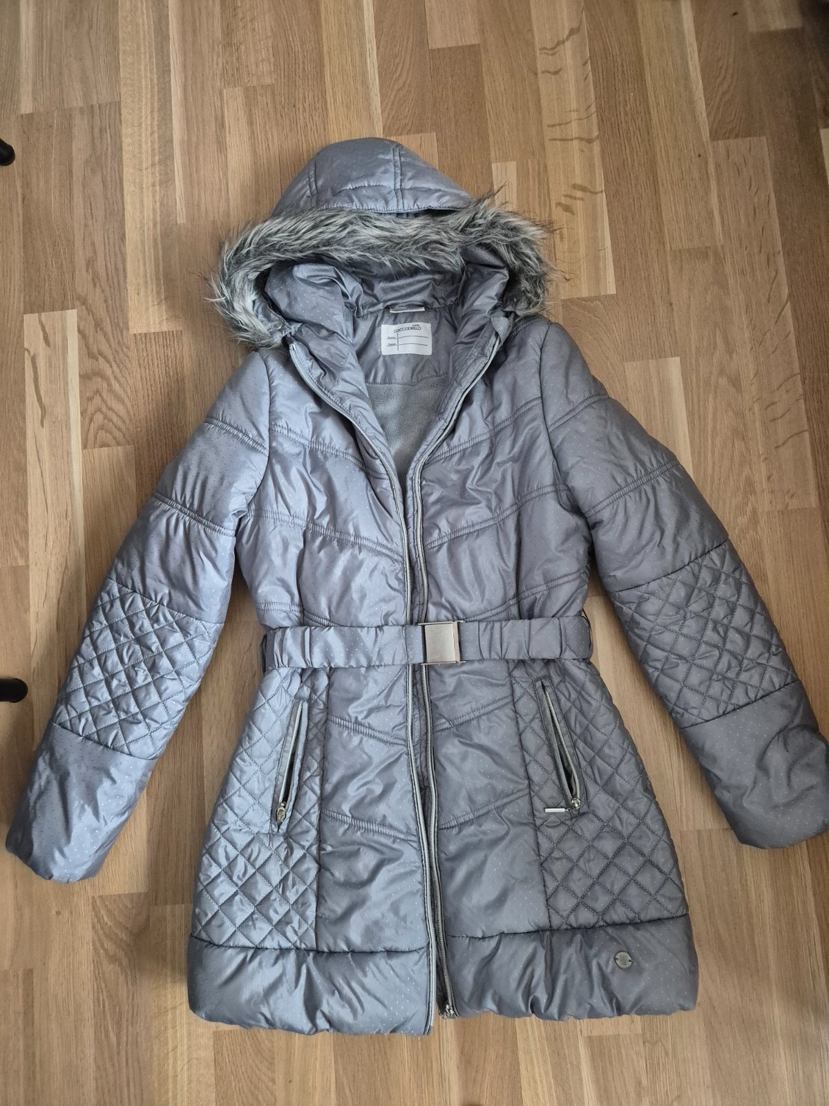 Krásna bundička šedostriebornej farby, zateplená, vo výbornom stave, len kovová pracka na opasku je trochu ošuchnutá. Môže sa nosiť samozrejme aj bez opasku.