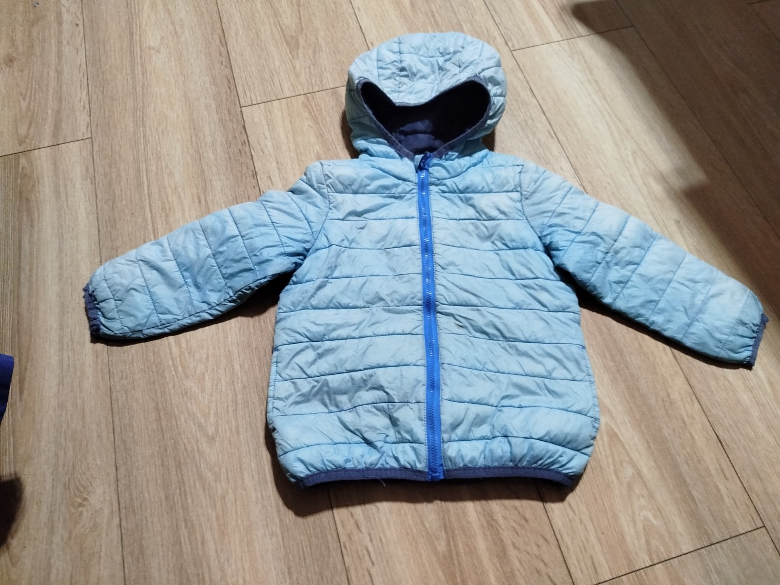 Nosena originál bundička, po jednom dieťati, známky nosenia okolo rúk a vreciek ako dieťa kráča a šúcha rukami...nevidieť pri bežnom nosení ... Vzadu jemne poškodená jedna niť, nič hrozné ani nevid...