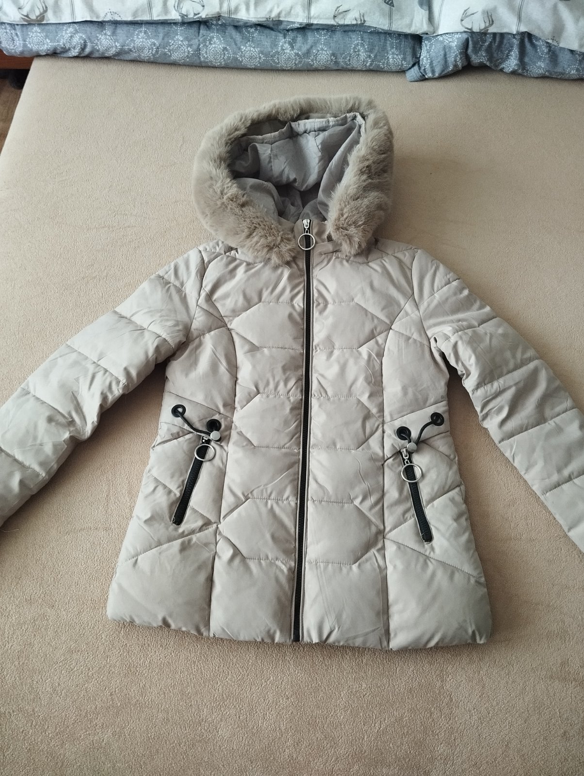 Super stav , kožušina je odnímateľná, dĺžka 66cm, šírka cez prsia 2x 46cm, rukáv od krku 72 cm, rukáv od ramena 61cm .