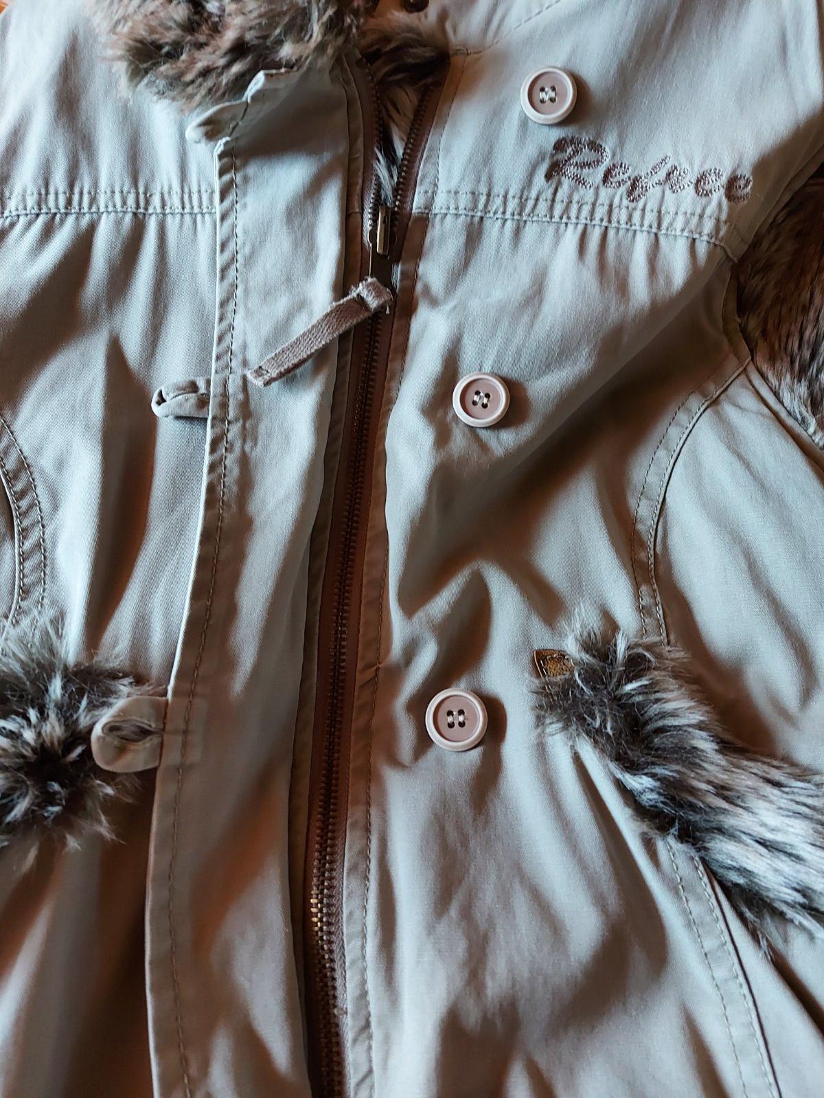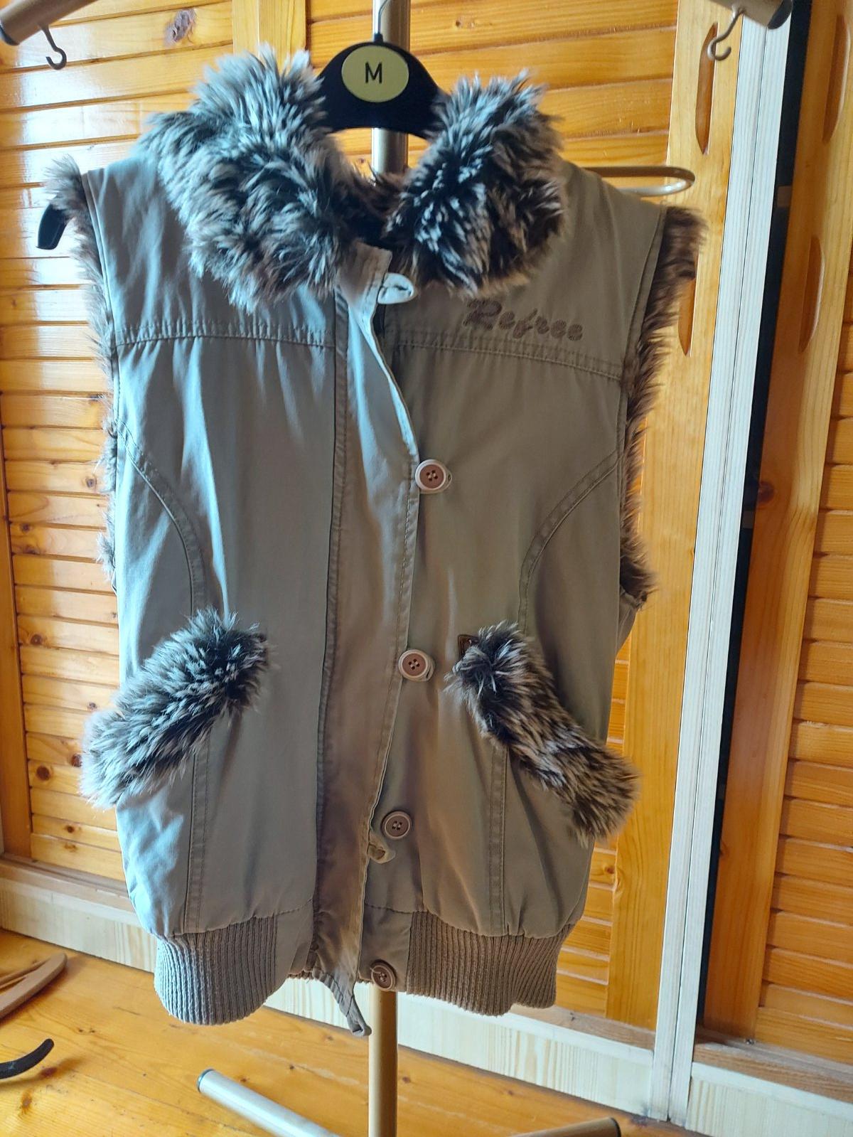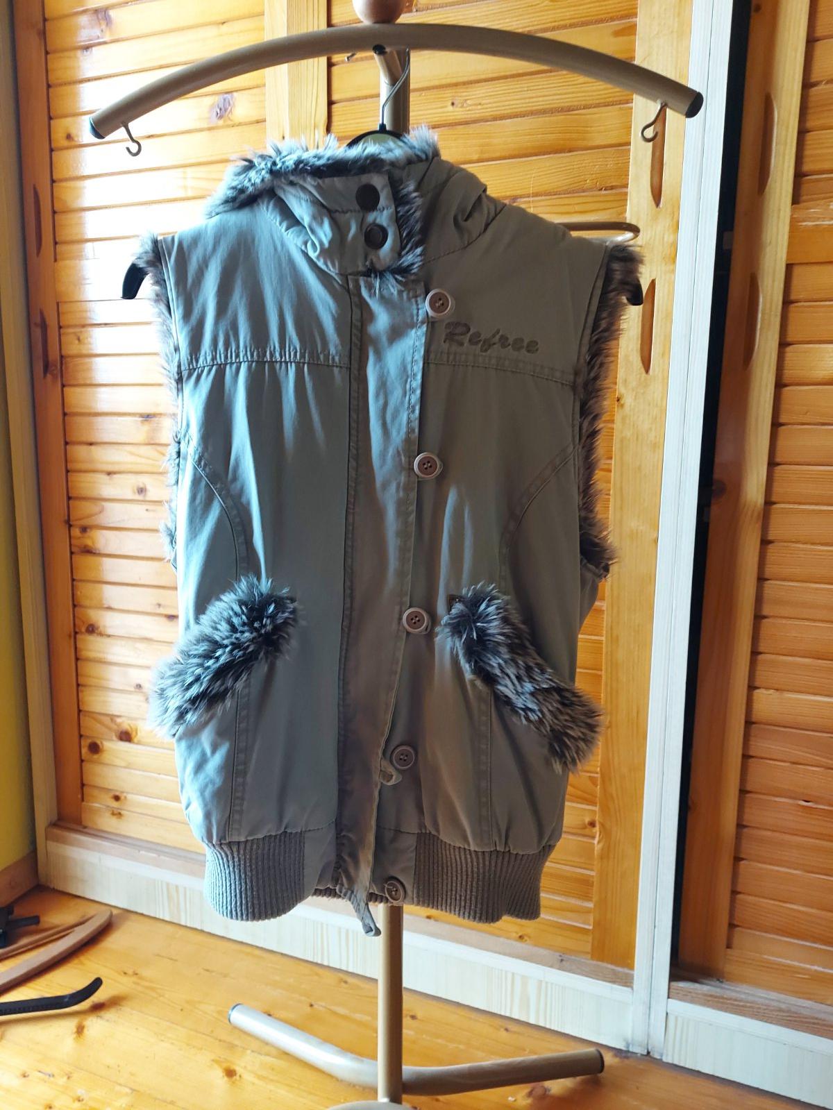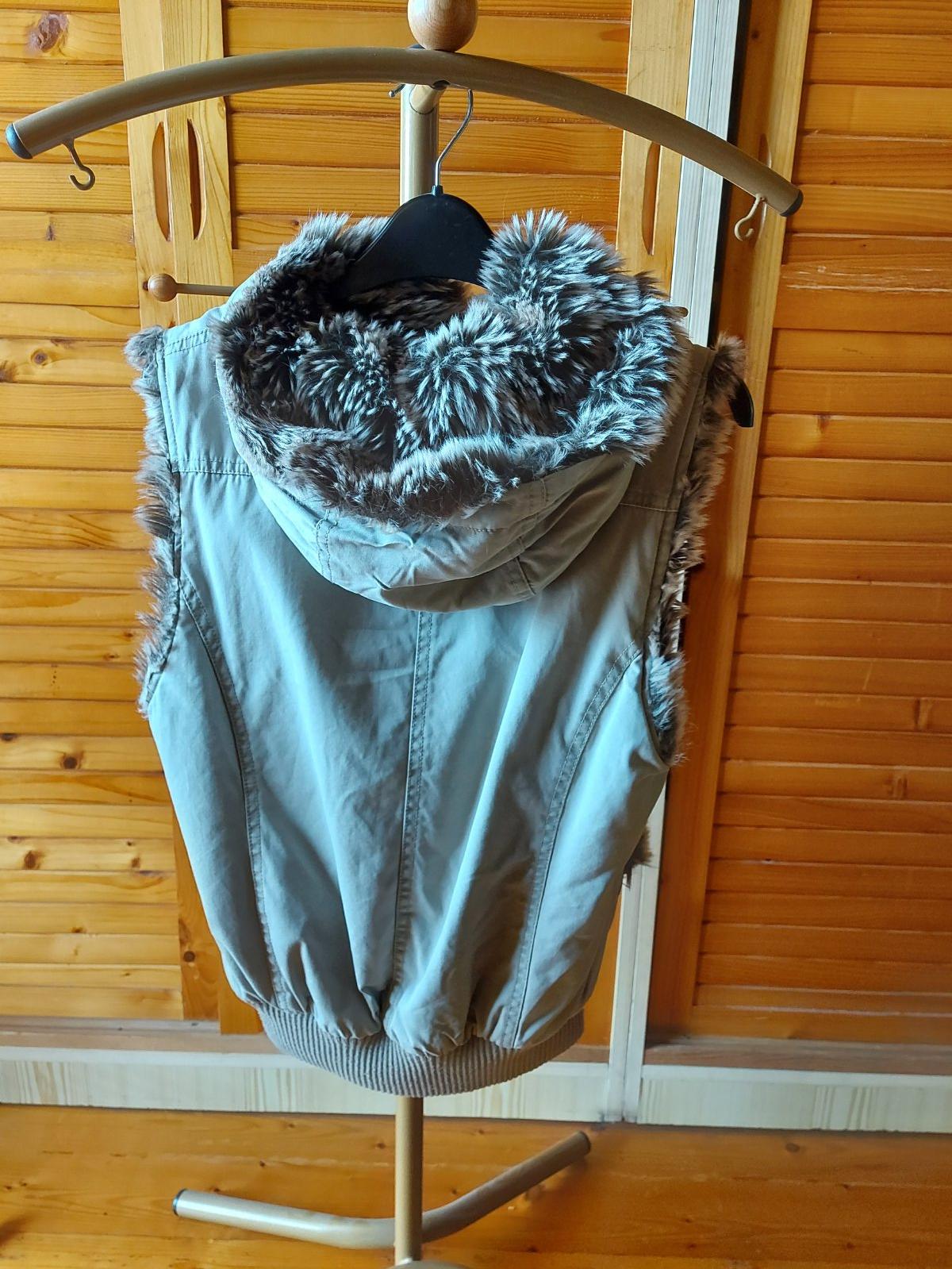 Vesta s kožušinou a kapucňou Refree, S/M, svetlo olivovo-zeleno-béžová, na zips, aj gombíky, š. pod pazuchami - 47,5, dĺžka - 56