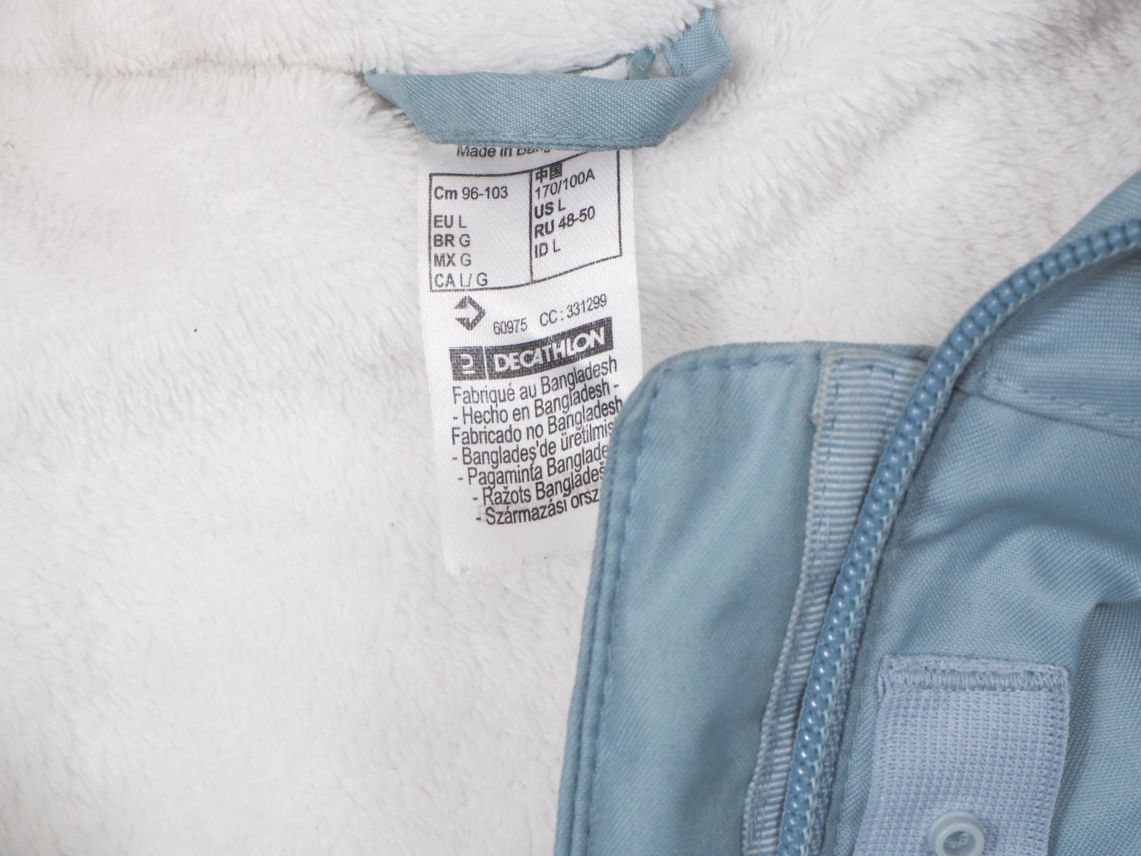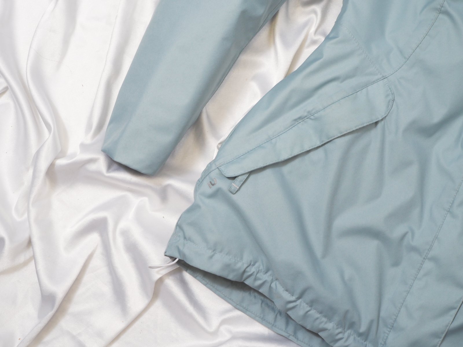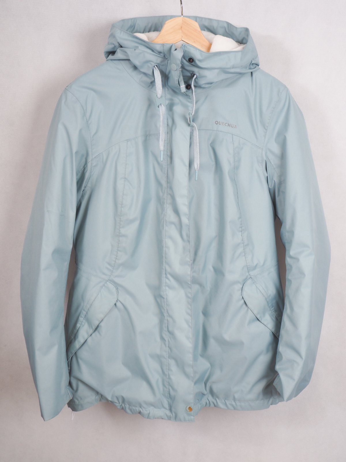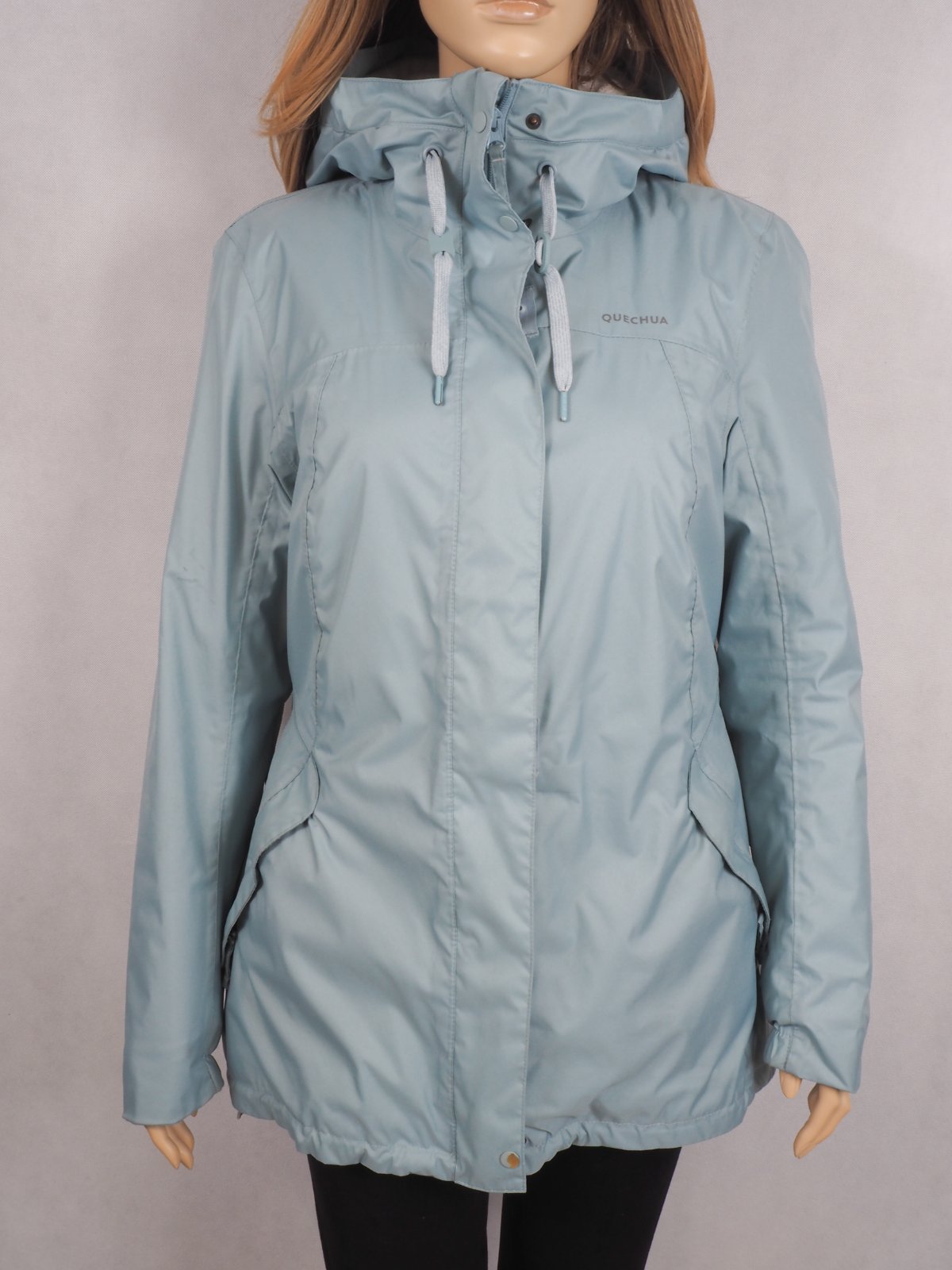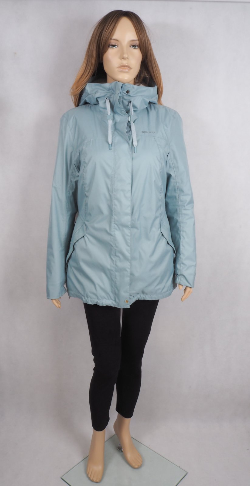 Kvalitná zimná bunda bledomodrej nezábudkovej farby, zapínanie na zips a légu, na spodku gumka, tvarovaná na postavu, všité vrecká, materiál 100% polyester, super stav.