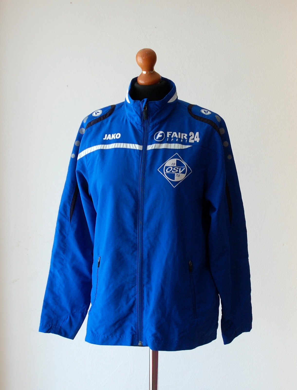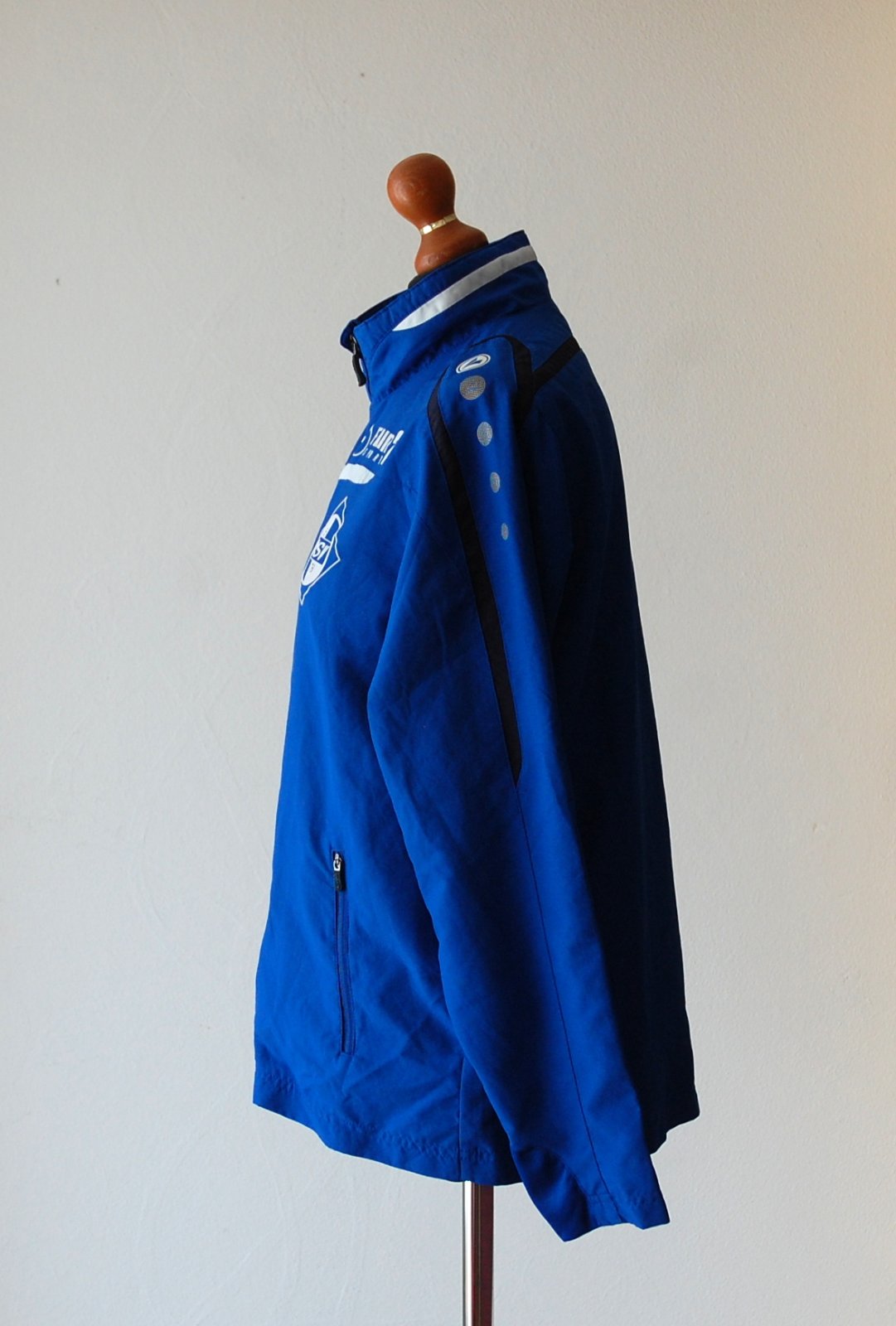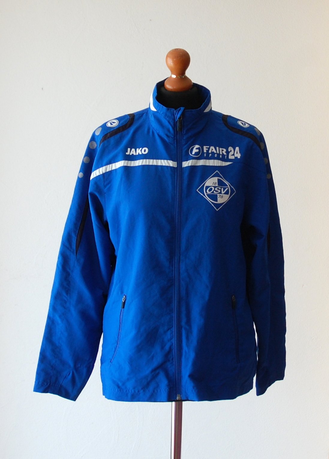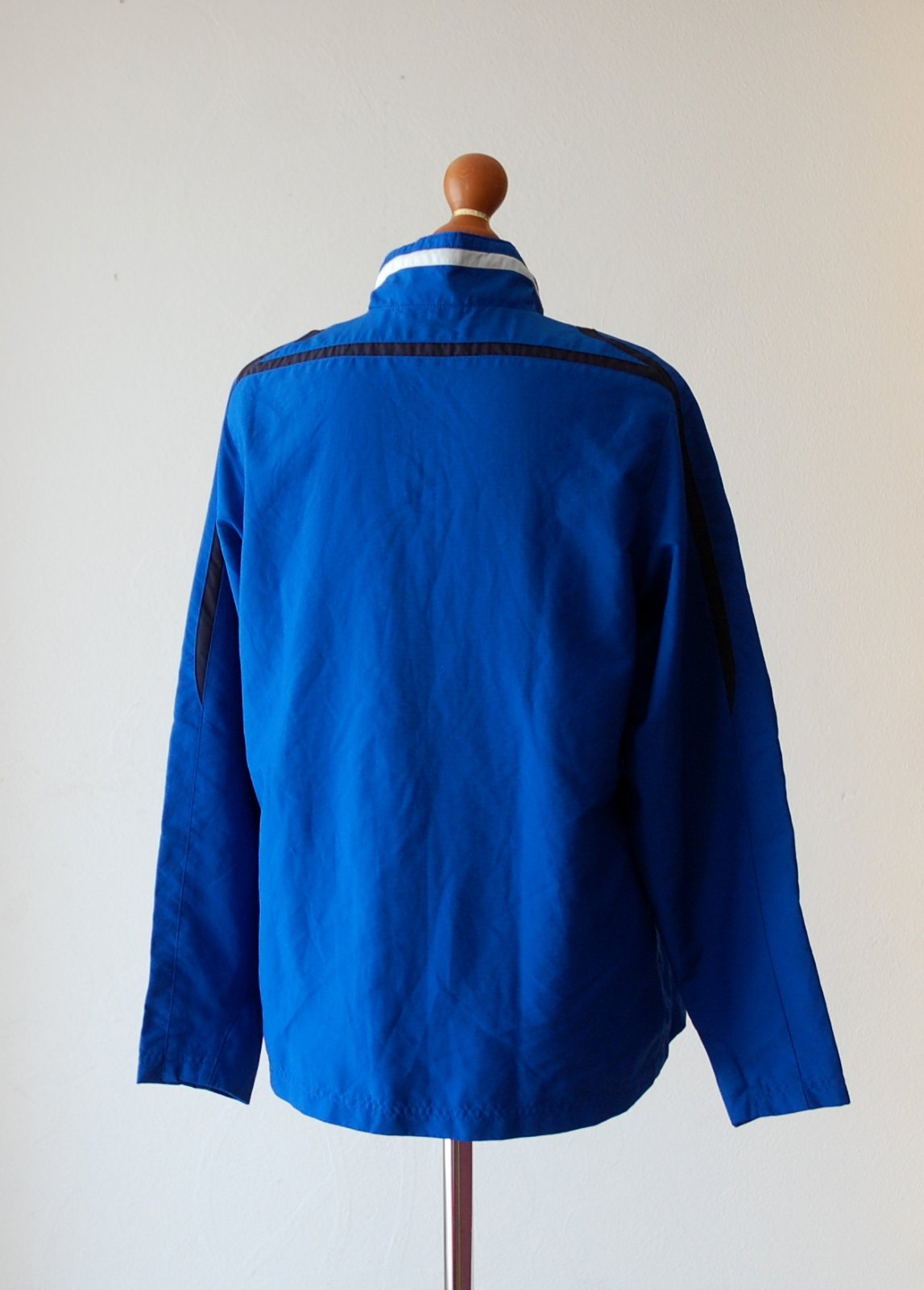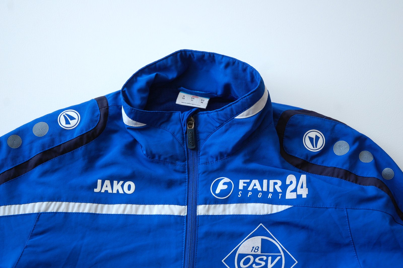 Predám modrú športovú bundu značky JAKO, vhodnú na tréningy aj voľný čas. Ide o kvalitné tímové oblečenie s funkčnými vlastnosťami. Bunda je v kráľovskej modrej farbe s bielymi detailmi na ramenách.