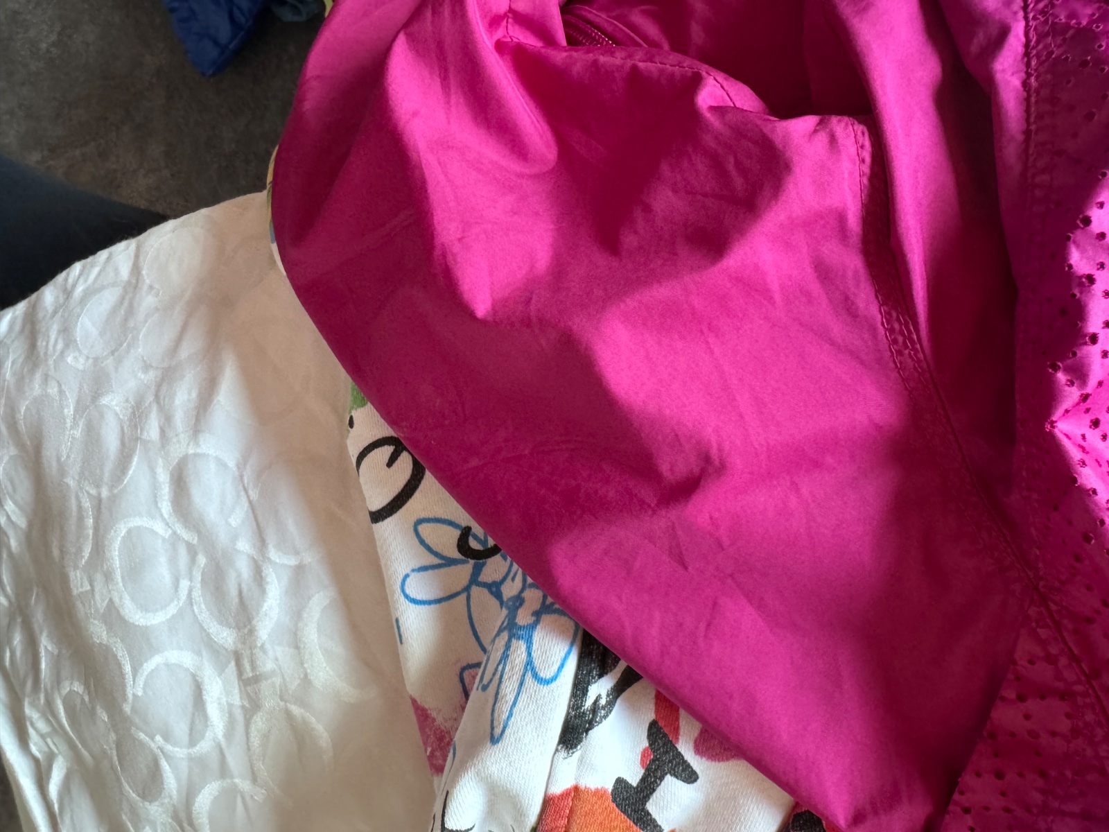 Fialovo- ruzova, bez poskodenia, Dĺžka 64 cm šírka 50 cm rukáv od goliera 72 cm